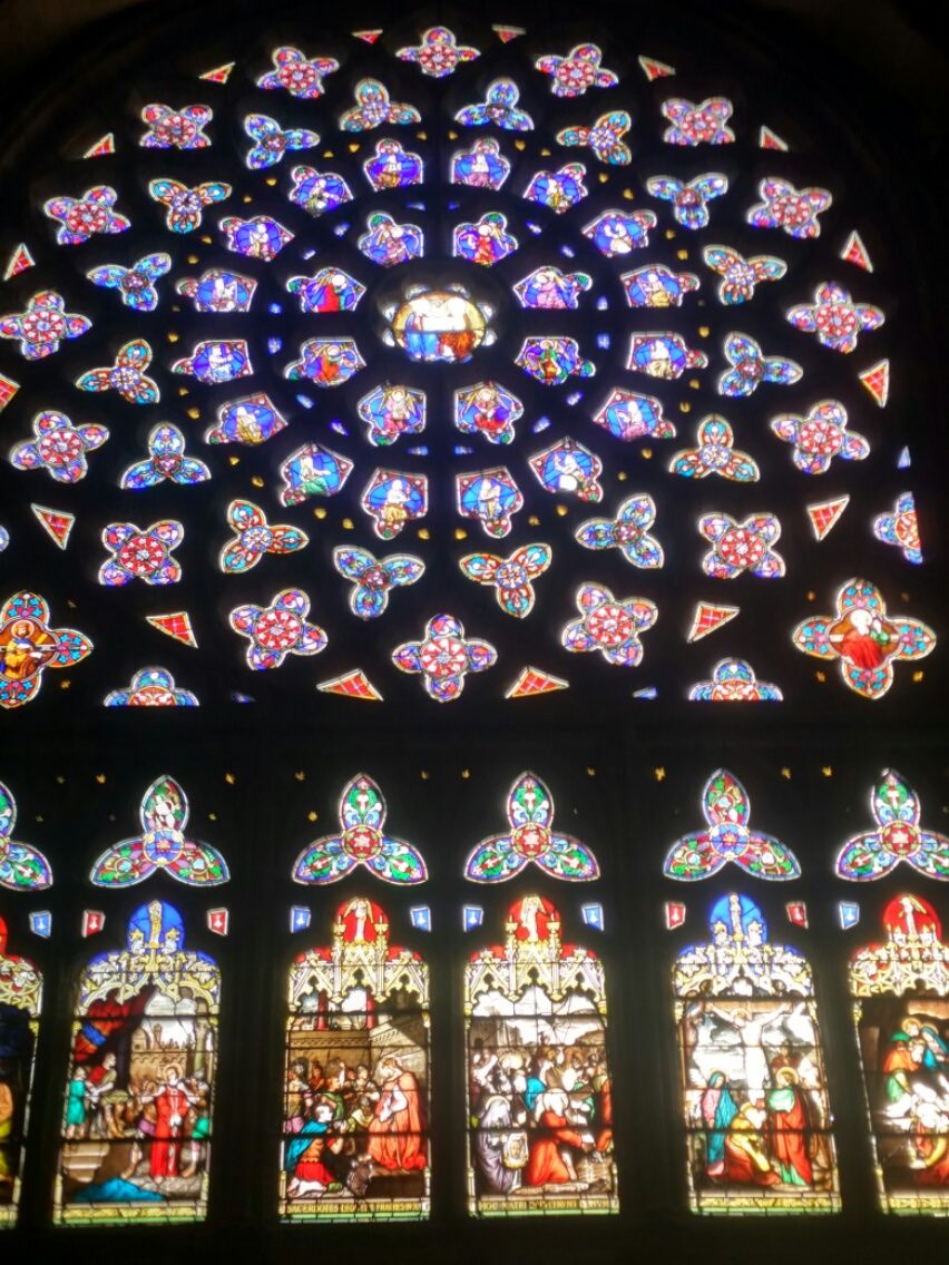 Ein durchweg trockener Tag verlockt zu einem langen Marsch Richtung Norden um die Bucht herum, vorbei am alten Hafen und am Anleger der kleinen Ausflugsboote, die täglich mehrmals zur vorgelagerten île de Batz übersetzen. Es folgen zwei Tage Dauerregen. Aber dann …. Blauer Himmel, zaghaft scheint die Sonne hinter den Wolken hervor, es hält uns nicht länger auf dem Boot. Ein schöner Spaziergang führt zunächst am Strand entlang, dann an Feldern und Wiesen vorbei, bis wir wieder in Saint-Pol-de-Léon landen. Hier erwischt uns ein heftiger Regenguss, schon nach ein paar Minuten sind wir floddernass. Wir flüchten in die Cathérale St. Paul Aurélien. Kalt, dunkel, es tropft durch’s Dach und riecht muffig. Trotzdem haben Kirchen mit offenen Toren ihren ganz besonderen Reiz. In die leeren Bankreihen setzen und einen Moment der Stille genießen tut gut. Besonders beeindruckend ist ein Kirchenfenster aus dem Jahr 1560. Zurück nach Roscoff geht es per Bus, denn der Regen hält sich hartnäckig.