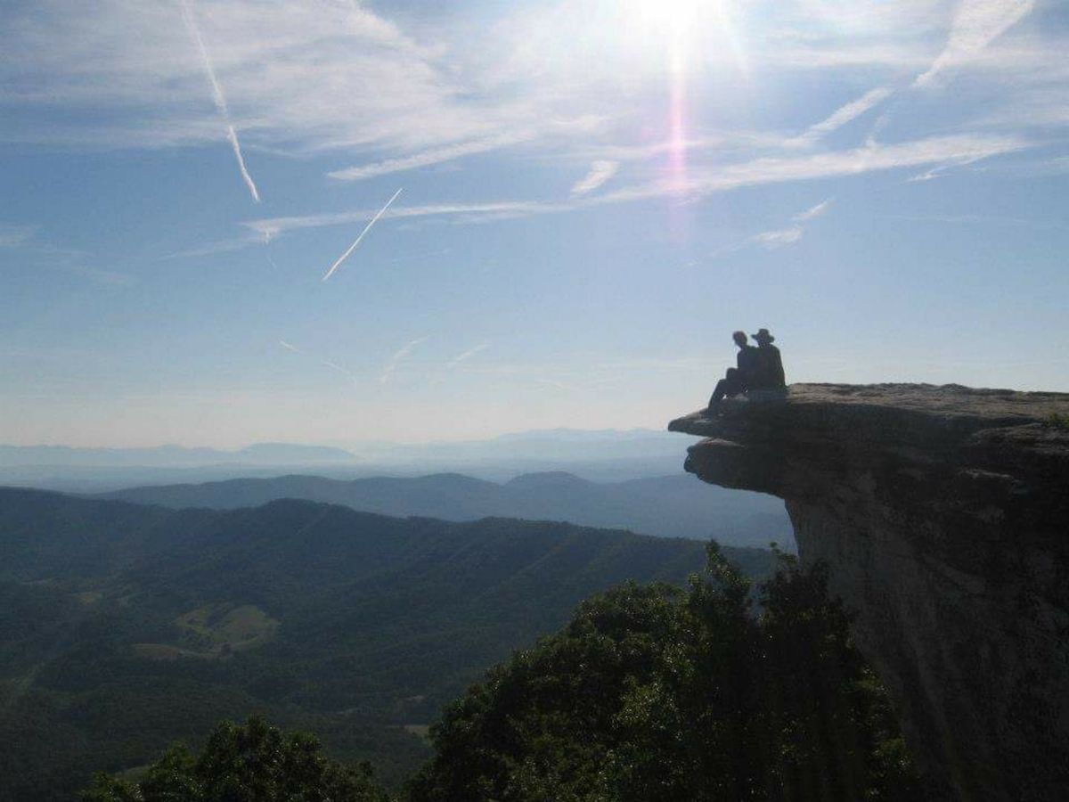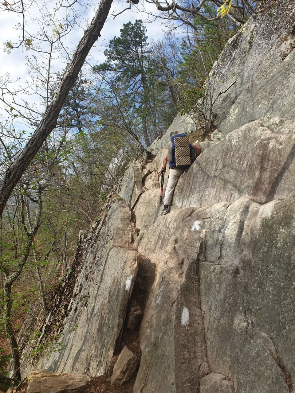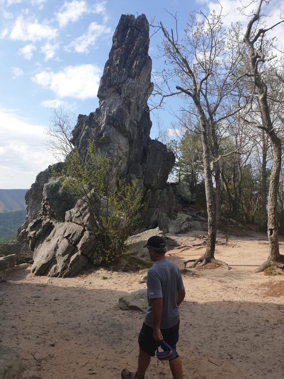 Früh am Morgen sitzt eine Eule schläfrig auf einem Baum neben dem Weg. Sie fliegt kurz auf, als wir uns nähern, und setzt sich ein paar Bäume weiter wieder in Ruhestellung. Zwei schwarze Schmetterlinge flattern dicht an dicht durch die Luft, wahrscheinlich ist das eine Art Balztanz. Auch die Eichhörnchen scheinen sich zu locken und zu jagen. Paarungszeit. Überall um uns herum ist jetzt der Frühling ausgebrochen. 🙂 Knackiger Aufstieg in der prallen Sonne. Der Schweiß rinnt in Strömen. Es ist heiß, wir haben Durst. Pause im Schatten an der Campbell Shelter. Ich folge einem „Blue Blaze“, um Wasser zu holen. Die Quelle ist viel weiter weg als gewünscht. Weiter geht es hinauf zum McAfee Knob auf 3197′ Fuß Höhe. Die abgeflachten Felsen sind ein sehr bekanntes Foto-Motiv. Aber uns ist hier oben entschieden zu viel los. Ein Dutzend Menschen, Musik und Party-Stimmung. Wir haben keine Lust, uns auf dem Gipfel in Position zu setzen und von Fremden fotografieren zu lassen. Also kein neues Bild vom McAfee Knob, alternativ stelle ich an dieser Stelle unser Foto aus dem Jahr 2012 ein. Schnell weg. 😉