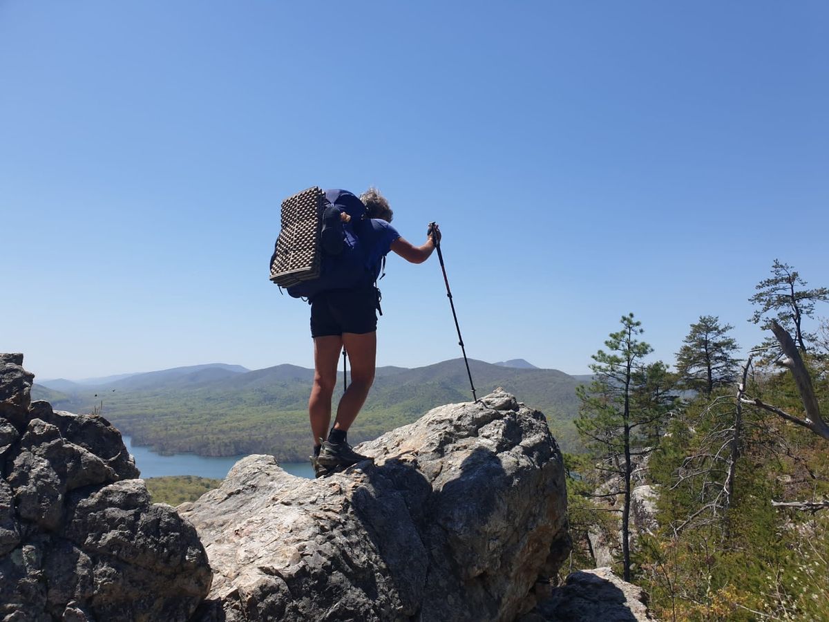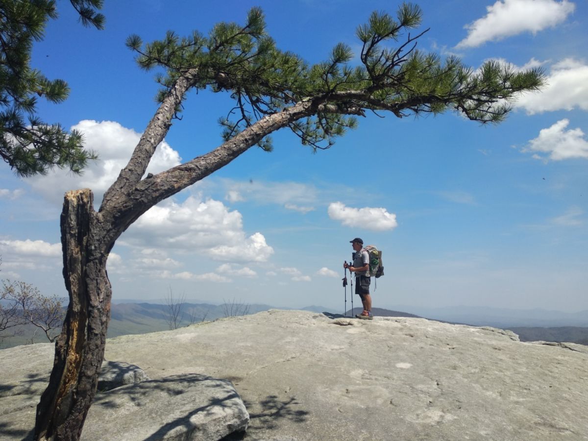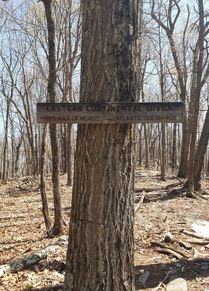Eine langbeinige Spinne hat sich über Nacht in meinem Schuh eingerichtet. Kontrolle morgens ist wichtig, denn es könnte sich ja auch eine Schlange dort einnisten. Drei Rehe stehen mitten auf dem Trail, ein Junges ist dabei. Wir sehen einen großen Greifvogel ganz entspannt in einem Baum sitzen. Er hat sein Gefieder weit ausgespreizt, um möglichst viel Sonne zu tanken. Die Monarchfalter werden immer zahlreicher, auch die schwarzen Schmetterlinge sind häufig zu sehen. Bäume mit weißen Blüten verströmen einen betörenden Duft, das ist die Vogelkirsche. Ein ausgewachsener Salamander kreuzt unseren Weg. Ein Stück weiter springen einige Weißwedel-Hirsche vor uns davon. Unsere erste Tagesaufgabe ist ein stundenlanger Anstieg zum Bruisers Knob. Unterwegs gibt es ein langes Stück, an dem wir auf schrägen Felsplatten balancieren. Das Gestein ist schön griffig, macht unheimlich Spaß, darauf zu laufen. Auf 3434′ Fuß Höhe kennzeichnet ein Holzschild den Eastern Continental Divide, das ist die Verbindung vom Atlantik zum Golf von Mexiko. 2325 Meilen bzw. 3750 Kilometer von einem Ozean zum anderen, diese Vorstellung hat uns schon damals fasziniert.