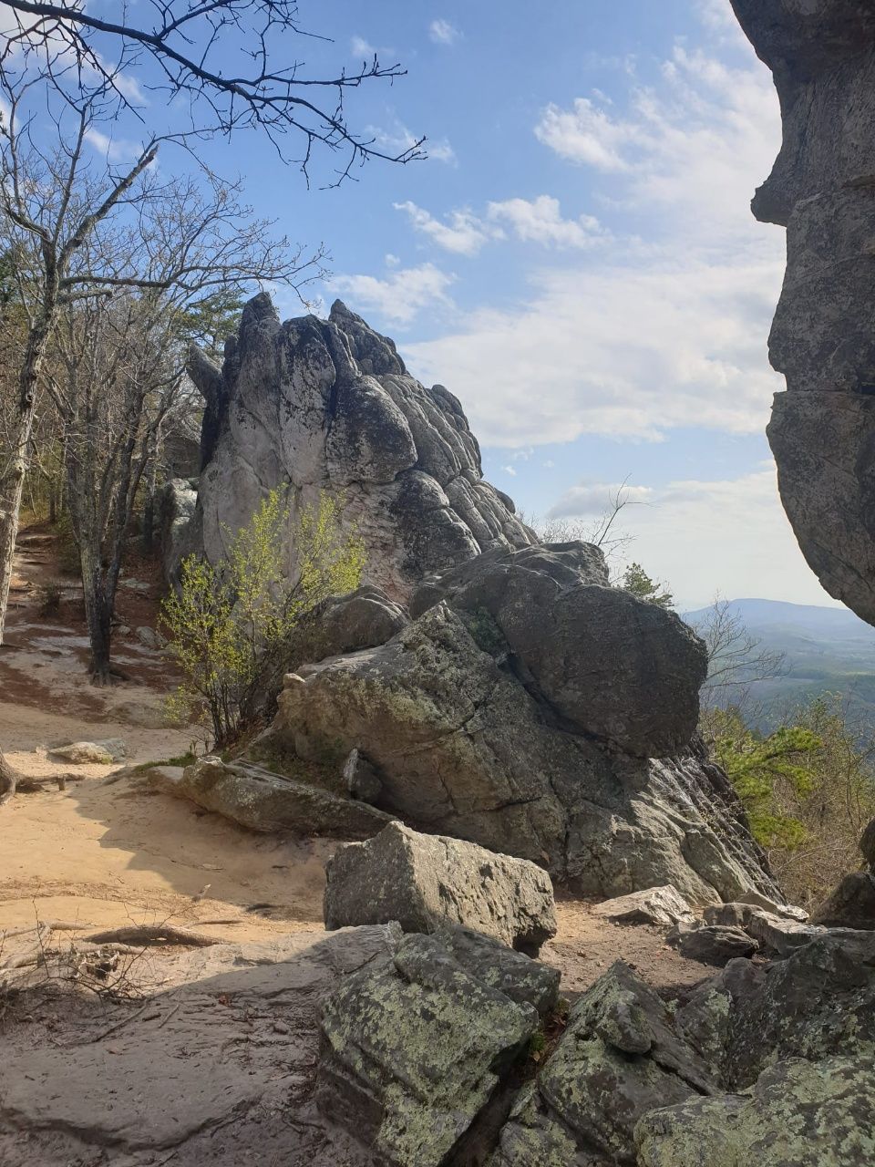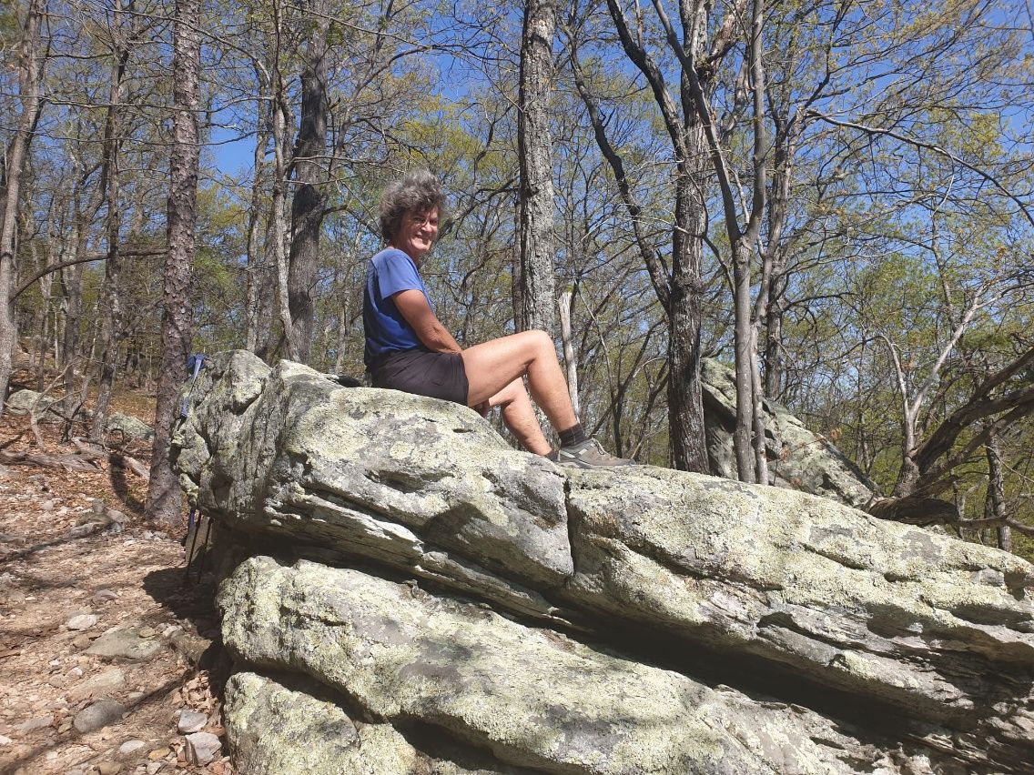 Am nächsten Morgen stellen wir fest, dass anscheinend auch der Sonnenhut bei der Feuerwehr geblieben ist. Dumm gelaufen. Die Kappe ist wichtig, weil die Bäume noch so kahl sind und keinen Schutz bieten. Sitzen um 8.00 Uhr früh an der Tankstelle und trinken Kaffee, danach gehen wir zwei Kilometer weiter zum Supermarkt, um ein paar Äpfel und Bananen zu kaufen. Um 12.00 Uhr macht ein Second Hand Shop in der Nähe auf. Bis dahin müssen wir noch ein paar Stunden Zeit totschlagen und essen ungesundes Frühstück bei Wendy’s. Ich mag das amerikanische Essen überhaupt nicht mehr. Drei Bissen vom Cheeseburger, es geht fast nicht runter. Ich schäle mir lieber einen Apfel. Einkauf von Sonnenkappe und T-Shirt ist schnell erledigt. Günstig und nachhaltig, so soll es sein. 🙂 Um 12.30 Uhr sind wir zurück auf dem Trail. Vor uns liegt ein gemäßigter Anstieg zum „Hay Rock“. Das ist eine interessante Fels-Formation, von der aus man ungehinderten Weitblick in das grüne Tal hat.
