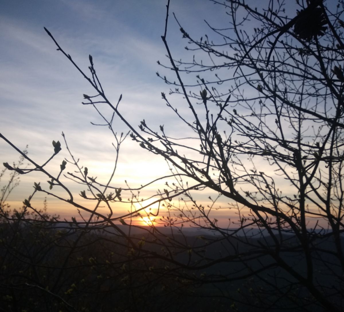 Wir sehen unseren ersten Monarchfalter in diesem Jahr. Das ist ein besonders hübscher Schmetterling mit ungefähr 10 Zentimetern Flügel-Spannweite und einer sehr schönen Zeichnung. 30°- 32° am Nachmittag, es ist richtig heiß. Morgen nochmal dasselbe, übermorgen Regen, und danach wird es die nächste Kältewelle geben. Verrücktes Wetter ist das in diesem Jahr, das bestätigen uns auch die Einheimischen. Zum Ende des Tages müssen wir uns noch einmal 300 Höhenmeter erarbeiten bis zu den Tinker Cliffs. Diese Klippen sehen von unten aus wie die Mauern einer alten Festung. Drei Liter Wasser schleppen wir den Berg hoch. Abendessen auf den Felsen im Licht der untergehenden Sonne. Dutzende von kleinen Fliegen nerven ein bisschen, aber sie stechen nicht. Inzwischen befinden wir uns erneut auf 3000′ Fuß Höhe, aber es ist warm. Nur noch ein kleines Stück weiter auf den Felsplatten der Tinker Cliffs, dann zeigen uns ein paar Rehe den Weg zu unserem Zeltplatz. Wir sind wieder auf dem Trail, beide glücklich und entspannt. 🙂