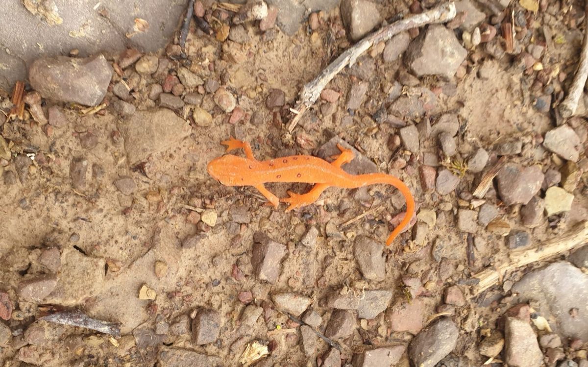 Dieses Mal laufen wir einen „Blue Blaze“, der uns bis zum Drachen bringt. Normalerweise läuft kein Thru-Hiker einen Extra-Weg, denn 3500 Kilometer sind eigentlich schon genug. 2012 und 2014 sind wir an diesem Abzweiger nur auf dem „White Blaze“ vorbei, jetzt bringt uns dieser Umweg endlich zum Drachenzahn. Es lohnt sich. Ein herausragender Einzel-Felsen kann sofort als Zahn erkannt werden. Ein Stück weiter bilden die aufeinander geschichten Felsplatten tatsächlich die Schuppen eines Panzers. Man braucht nicht viel Phantasie, um das Bild eines schlafenden Drachens zu erkennen. Faszinierend. 🙂 Nur eine Stunde später kommt uns ein Wanderer entgegen, den wir aus Florida kennen. „Scarv“ haben wir dort mehrmals getroffen. Er hat sich erst eine Woche vor Beendigung des Florida-Trails dazu entschieden, gleich weiter auf dem AT zu laufen. Auch wir wussten damals noch nicht, dass wir 800 Kilometer durch Virginia einschieben werden. Total überraschend also, und umso größer ist die Wiedersehens-Freude. 🙂 Mittags verdunkelt sich der Himmel schlagartig. Es donnert ein paar Mal, dann ergießt sich ein heftiger Wolkenbruch über uns. Innerhalb von 5 Minuten werden wir klitschnass. Regenpause an einer Shelter, die dummerweise einen Kilometer abseits vom Trail liegt. Es scheint die bessere Alternative zu sein, wenn man ein Dach über dem Kopf haben möchte. Im Regen draußen essen ist nicht schön. Gestern noch haben wir in der Sonne geschwitzt, heute trinken wir heißen Kakao zum Aufwärmen. Mit dem Regen hat es sich deutlich abgekühlt. Thomas ist hoch erfreut über den Temperatursturz, während ich sofort wieder friere. Nachmittags steigen wir auf den „Brush Mountain“ mit 3100′ Fuß Höhe. Den Abstecher zum Audie Murphy Monument können wir uns sparen. Das Grab des höchst-dekorierten Soldaten aus dem Zweiten Weltkrieg habe ich schon zweimal besucht. Amerikanische Fahnen, bunte Plastikblumen und grell-bunte Deko ….. einfach schauderhaft kitschig. Immer mal wieder regnet es in kurzen Schauern. Im Graben, aus dem Thomas unser Wasser schöpft, krabbelt ein Molch. Später sehen wir noch einen kleinen Regenmolch auf dem Weg, durchscheinend orange und zerbrechlich. Mehrmals hintereinander überqueren wir kleine Bäche auf Holzbrücken. An einem dieser Wasserläufe ist ein Zeltplatz mit Feuerstelle und Sitzsteinen eingerichtet. Den nehmen wir gerne und liegen schon im Schlafsack, bevor es richtig kalt wird.