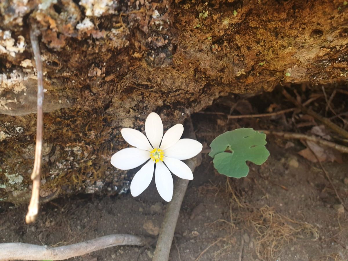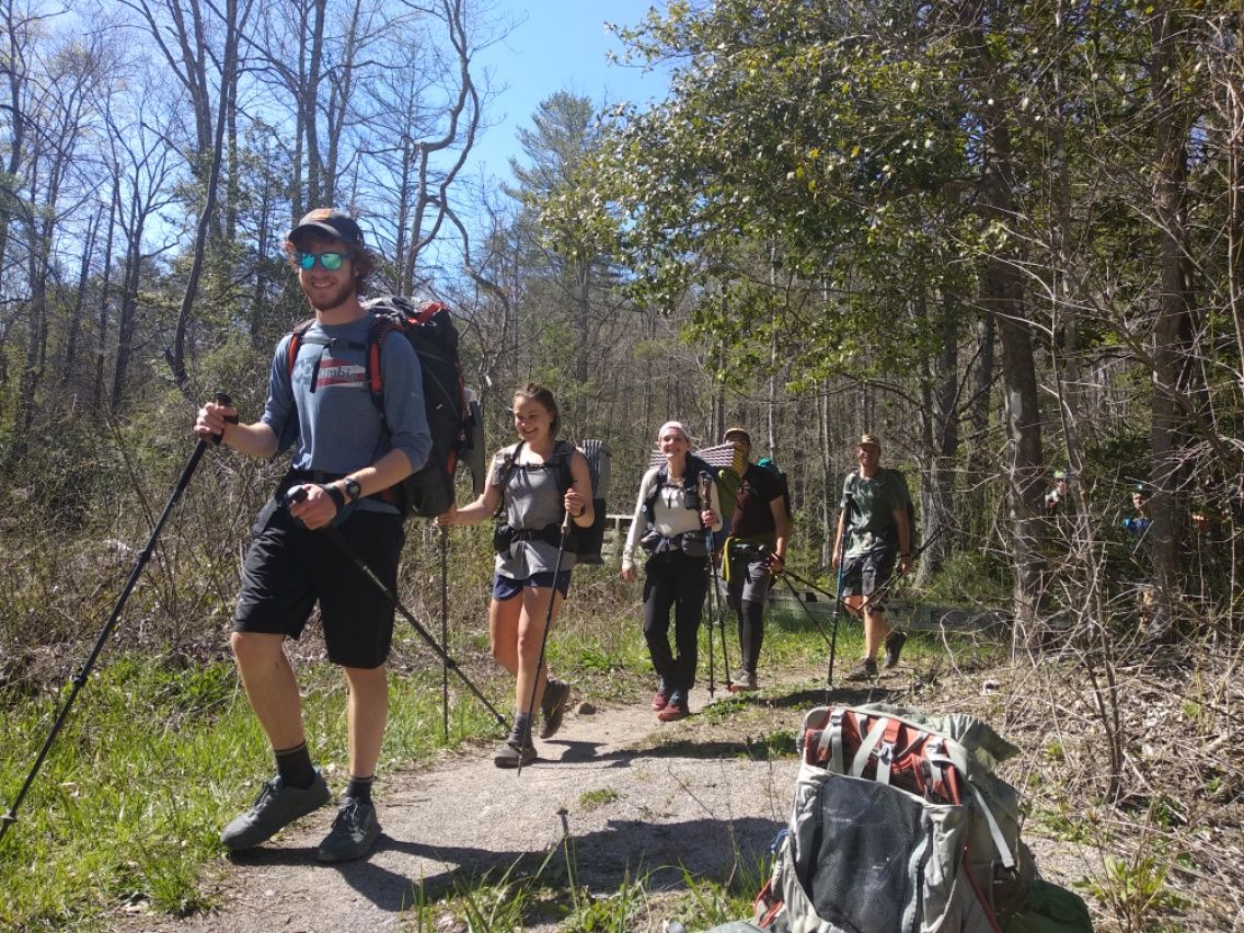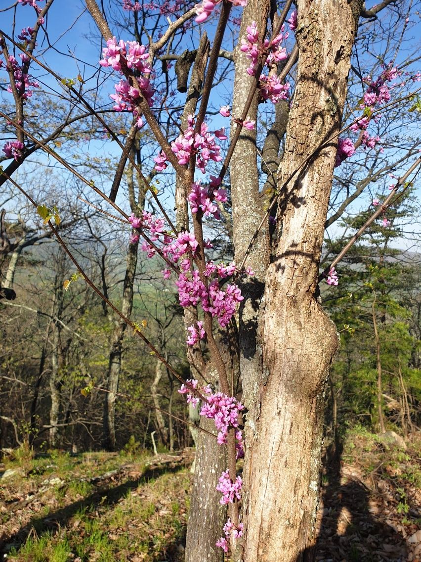 Plus 4° Celsius in der Nacht. Es ist nicht besonders warm im Zelt, aber das hatten wir schon viel schlimmer. Dagegen können wir uns anziehen. Einige Bärenspuren auf dem Weg und an den Bäumen erinnern uns daran, dass wir den Proviantbeutel draußen lassen sollten. Von 2000′ Fuß steigen wir auf den Wind Rock mit 4100′ Fuß, also 700 Höhenmeter zum Warmwerden. Der Gipfel des Wind Rock ist nach Norden hin weit offen. Es bietet sich eine ganz neue Aussicht in ein weiteres grünes Tal. Je weiter wir nach oben kommen, umso mehr laufen wir in den Winter hinein. Die Bäume sind kahl, keine Knospen, keine Blümchen, keine Schmetterlinge. Und der Gipfel macht seinem Namen alle Ehre. Ein schneidender Wind herrscht hier oben und lässt uns fast rennen. Die Kälte dringt sofort bis in die Knochen. Schon wieder 4 Stunden ohne Pause. An einer Wasserquelle machen wir Halt. Noch bevor Thomas richtig sitzt, fällt ihm ein morscher Ast auf den Kopf, über einen Meter lang und mehrere Zentimeter Durchmesser. Nicht ganz so schlimm, denn er hat ein Tuch um den Kopf gewickelt und eine Kapuze auf. Zum Glück ist das nicht letzte Woche passiert, als die Äste mit Eis ummantelt und schwer waren. Jeden Abend vor dem Zelt-Aufstellen checken wir die nähere Umgebung, um kranke Bäume und lose Äste zu vermeiden. Hier auf dem Wind Rock gibt es jetzt unerwartet was auf den Kopf. 😉 Wir trinken heißen Kakao zum Aufwärmen. Dann beeilen wir uns, um schnell aus dieser zugigen Gegend zu kommen. Etwa zwei Kilometer, die uns aber viel länger erscheinen, holpern und stolpern wir über wackelige Steine. Danach geht es auf einem schönen Waldweg sanft in Serpentinen bergab. Wir laufen entlang eines wild sprudelnden Baches. Zu beiden Seiten wachsen hohe Rhododendron-Sträucher, leider noch ohne Blüten.