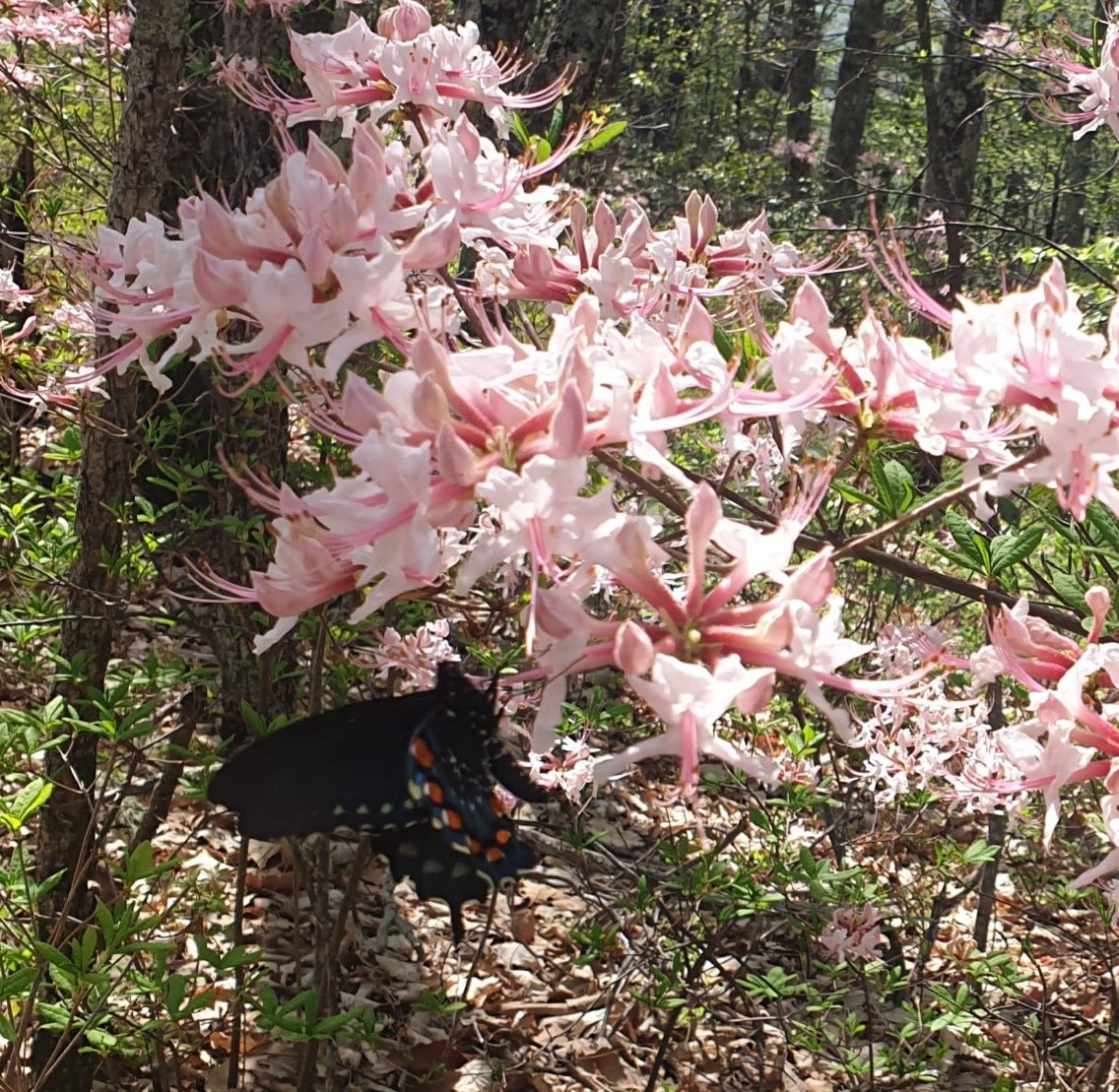 Wir entdecken den ersten Rhododendron-Strauch, an dem sich gerade die Knospen öffnen. Rote Blüten. Das lässt uns hoffen, dass wir demnächst das Rhododendron Gap in voller Blütenpracht erleben können. Heute neu sind schwarz-bunte Schwalbenschwänze und gelbe Zitronenfalter.