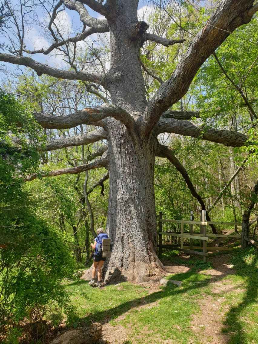 Eiskalt ist es hier oben. Wir sind schnell, sonst kommt man ins Frieren. Der Weg verläuft mehrere Kilometer über die Ridgeline, ein angenehmer Pfad auf Laub. Im Osten sieht man mehrere Hügelketten hintereinander. Berge, soweit das Auge reicht. 🙂 Ein Problem heute ist das Wasser. Von 10.00 Uhr morgens bis um 14.30 Uhr am Nachmittag gibt es keinen Tropfen. Das stimmt nicht ganz, weil ein Seitenweg zu einer Shelter mit Wasser geführt hätte. Zwei Kilometer Umweg zusätzlich, das ist nichts für uns. Da laufen wir lieber 5 Kilometer voraus. So kommt es, dass wir 15 Kilometer ohne Pause schnell unterwegs sind. Wir kommen an der „Keiffer Oak“ vorbei. Das ist die größte und älteste Eiche auf dem AT, über 300 Jahre alt. Wirklich ein sehr imposanter Baum, wenn man direkt davor steht. Um 17.30 Uhr erreichen wir eine Shelter, an der schon einige Zelte aufgebaut sind. Feierabend-Modus für die meisten Wanderer. Wir füllen dort nur unsere Wasserflaschen und leeren sie sogleich wieder, denn wir möchten noch ungefähr 8 Kilometer weiter. Es geht über den „Kelly Knob“, wieder hinauf auf 3796′ Fuß. Auf dem Gipfel ist die Aussicht phantastisch, aber es weht ein kalter Wind. Nach unten brauchen wir länger als gedacht. Ein ganz schmaler Pfad führt ziemlich steil nach unten. Geröll und lose Steine unter unseren Sohlen, das ist nicht angenehm, wenn man schon 10 Stunden auf den Beinen ist. Eine Stunde später haben wir es geschafft. Tagesziel kurz vor Einbruch der Dunkelheit erreicht, immerhin 30 Kilometer in schwierigem Gelände. Die Füße singen, wir sind müde und haben Hunger. Der Proviant wird schon wieder knapp. 😉