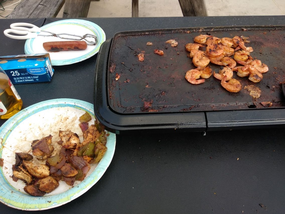 Am Nachmittag hängt Thomas unser klitschnasses Zelt zum Trocknen draußen über das Geländer. Jemand ruft von unten und fragt, ob wir Hiker sind. Er stellt sich vor als „Stone Leg“, ein Australier. Bereits dreimal auf dem AT gelaufen, jetzt ist er 56 Jahre und kocht für die Wanderer. Am Abend sind wir eingeladen zur Trail Magic. Eine Gruppe von 10 Leuten kommt im Hof zusammen. Es gibt Shrimps und gegrilltes Geflügel. 🙂