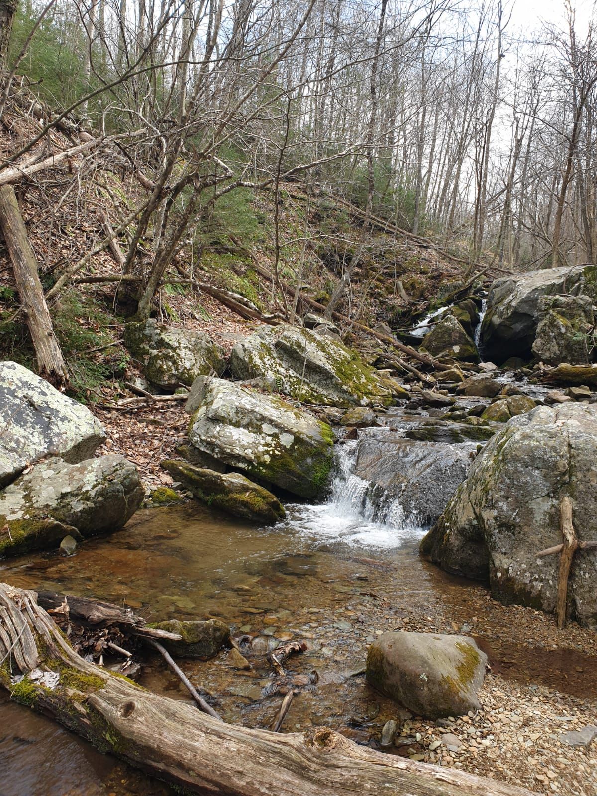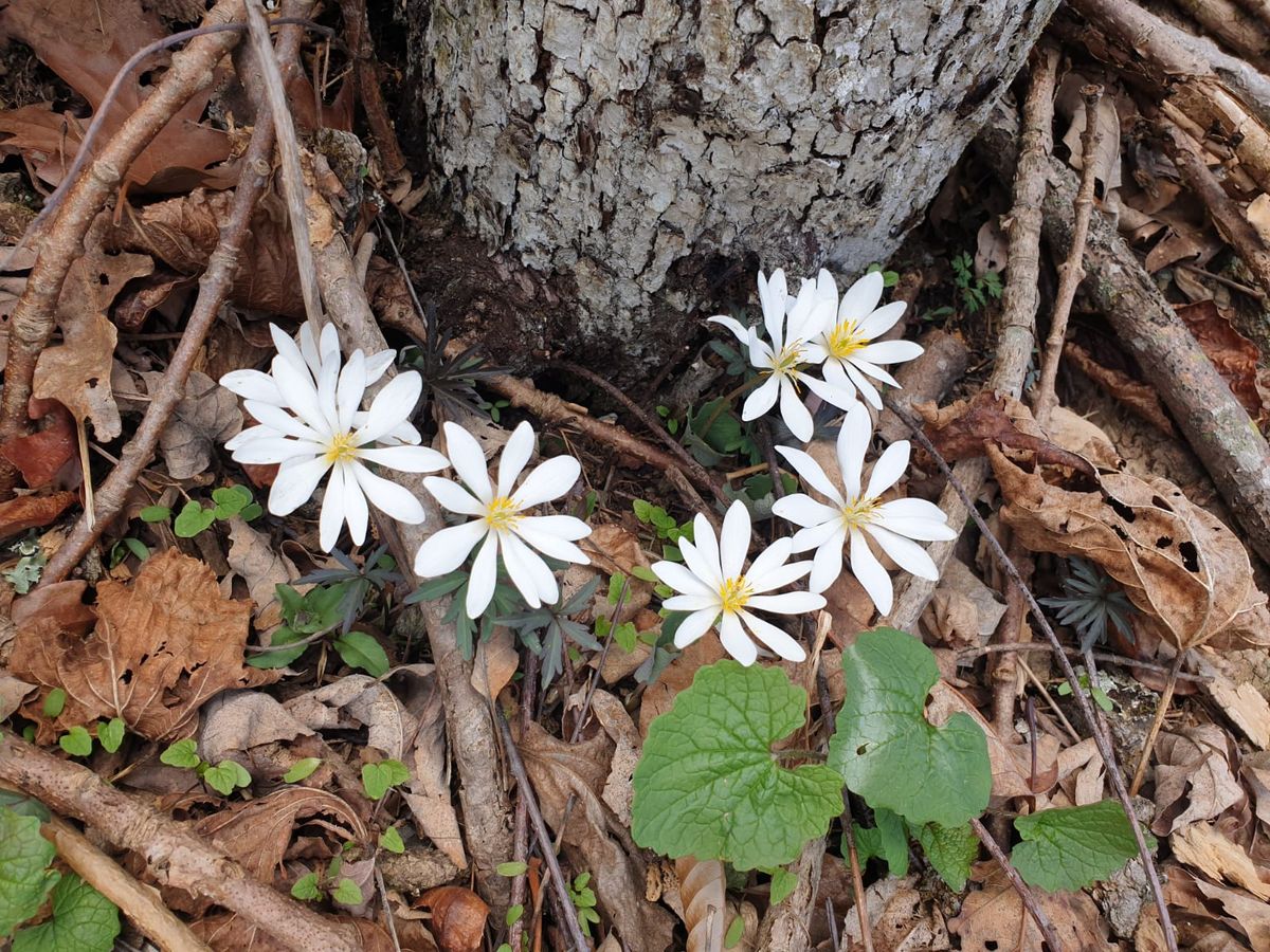 Fünfter Tag auf dem AT. Zunächst einmal verlaufen wir uns bereits kurz nach dem Start. An einem Parkplatz biegen gleich mehrere Wanderwege ab. Wir folgen unserer Spur geradeaus, queren eine Straße und bleiben wie selbstverständlich in dieser Richtung. Beide nicht aufgepasst, ohne nachzudenken folgen wir einem Pfad, der angenehm leicht bergab führt. So etwas hat man ja gerne. Nach einer Weile bemerken wir ein gelbes Zeichen an einem Baum. Moment mal …. da stimmt irgendwas nicht. Auf dem AT folgen wir doch den „White Blaze“ ! Umkehren, zurück bis zur Kreuzung, zum Glück nicht allzu weit. Es klappt im zweiten Anlauf, nachdem wir mit Brille auf den Wegweiser geschaut haben. 😉 Wir sind nun den fünften Tag ohne Unterbrechung nur im Wald. Kein störender Autoverkehr, kein Müll und keine toten Tiere an der Straße. Wir sind unheimlich glücklich mit der Entscheidung, noch einige Wochen auf einem richtig schönen Trail zu wandern. Der Frühling naht mit Riesenschritten. 🙂 Wir entdecken weiße Sternchen-Blumen, kleine Margeriten, lila Veilchen und die ersten Osterglocken. Neben unserem Pfad stehen Büsche mit hell-lila Blüten. Es zeigen sich die ersten Knospen an allen Bäumen.