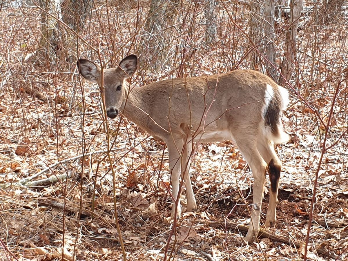 Die Nacht in der Hütte haben wir erstaunlich gut geschlafen. Anfangs störte das Kratzen der Hundepfoten über uns noch etwas, aber auch Hiker-Hunde sind abends müde. Es war warm genug, um nicht zu frieren. Morgens wachen wir erst nach 8.00 Uhr auf. Beide haben wir leichten Muskelkater in den Beinen und im Po. Der Wald verändert sich von Tag zu Tag. Die ersten Blümchen wagen sich vorwitzig an die Luft, lila und weiße Blüten. Löwenzahn streckt seine gelbe Köpfe durch das welke Laub. Eine Eule sitzt über uns auf einem Baum, flattert kurz auf die andere Seite des Weges und zurück. Umgedrehte Felsen sind ein deutliches Zeichen dafür, dass Meister Petz aus dem Winterschlaf erwacht ist. Unter den Steinen wird nach Insekten gesucht. Wir sehen Bärenkot und die typischen Kratzspuren an den Bäumen. Bisher haben wir noch keinen Bären beobachten können, sondern nur mehrmals lautes Knacken in den Büschen gehört, so als ob einer vor uns die Flucht ergreift. Wahrscheinlich halten die Schwarzbären sich zur Zeit noch in den unteren Lagen auf, wo es schon etwas grüner ist und mehr zum Fressen gibt. Wir überqueren den Ivy Creek auf Trittsteinen. Der Bach führt heute sehr viel Wasser, das sich in Kaskaden über die Felsen nach unten stürzt. Kein Wassermangel also, alle Quellen spenden erfrischendes Nass, dafür ist es genau die richtige Jahreszeit. Wir schrecken einen Adler auf, der sich majestätisch aus den Bäumen in die Lüfte erhebt. Zum Abendessen machen wir es uns am Loft Mountain Campground am Picknick-Tisch bequem. Die Zuwegung für Autos ist gesperrt. Am Straßenrand spaziert Damwild, zwei erwachsene Tiere und zwei Jungtiere. Der Platz ist geschlossen, der kleine Laden und das Restaurant auch, aber das wussten wir bereits. Der Betrieb beginnt hier erst Anfang Mai, weil es eigentlich noch zu kalt ist. Eine Toilette wurde aber freundlicherweise offen gelassen, dort können wir auch noch einmal Wasser zum Kochen holen. Sehr nett. 🙂 Nach dem Essen möchten wir noch ein Stündchen weiter, allerdings finden wir nicht sofort einen Platz. Laufen also weiter und bis in die Dunkelheit hinein. Nichts. Das Gelände ist entweder steil und abschüssig oder mit Gestrüpp und Stachelzeug zugewachsen. An der einzigen scheinbar geeigneten Stelle steht bereits ein kleines Zelt. Wir suchen noch ein paar Hundert Meter voraus, kehren dann um und bauen unser Lager in der Nachbarschaft auf. Das Aufhängen des Proviantbeutels dauert im Dunkeln viel länger als gewöhnlich. Beim ersten Baum, den Thomas ausgesucht hat, bricht der Ast schon alleine vom Gewicht des Wurfbeutels. Der nächste Baum, den ich ausgesucht habe, ist in der Mitte umgeknickt und mehrfach gegabelt. Dort bleibt die Schnur in einer Kerbe hängen, die Schnur mit dem Gewicht bleibt in unerreichbarer Höhe stecken. Aber im Shenandoah herrscht eine hohe Dichte an Schwarzbären, die jetzt aus dem Winterschlaf erwachen und hungrig sind. Also weiter …. Nach zahlreichen Würfen hängt unser Futter hoch und sicher im Baum. Fünf Anstiege an diesem Tag. Es reicht. Wir sind müde. Feierabend, aber noch nicht ganz …. Wir haben eine Spring-Spinne im Zelt. Mehrere Versuche meinerseits, den ungebetenen Gast in der hohlen Hand zu fangen, scheitern. Die Spinne ist blitzschnell und springt wirklich weit. Schließlich schafft Thomas es, sie mit einem Tuch einzufangen und nach draußen zu befördern.