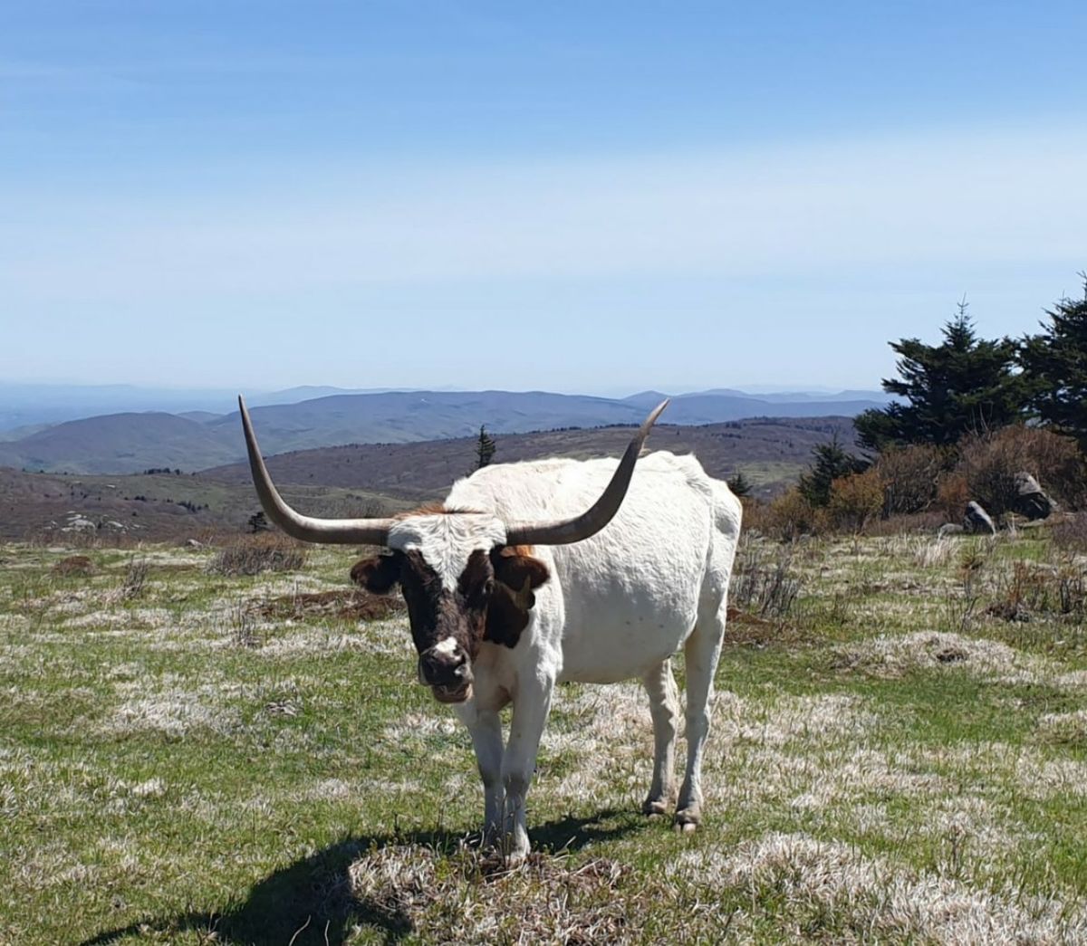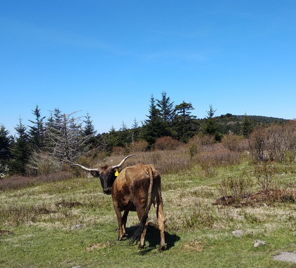 Etwas später sehen wir eine weitere Kleingruppe : Hengst, zwei Stuten und zwei schwarz-weiße Fohlen. Diese Ponys gehören Niemandem. Sie leben und vermehren sich „wild“ in den Grayson Highlands. 🙂 Weiter geht es bis zum höchsten Punkt der Weide, wo wir uns abseits des Pfades einen schönen Platz suchen. Wir müssen heute vor der Nordgrenze zum Grayson Highlands State Park Feierabend machen. Die nächsten 5 Kilometer darf man nicht zelten. Knapp 12 Stunden unterwegs, 32 Kilometer etwa geschafft.