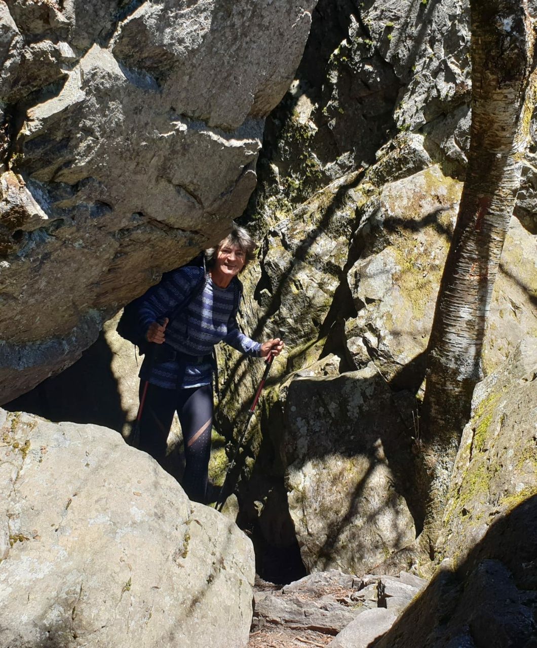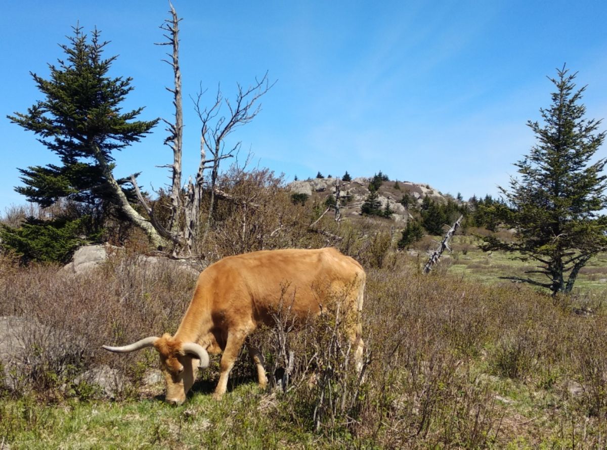 Abends im Zelt konnten wir die kleinen Pferdchen rund ums Zelt laufen und schnauben hören. Neugierig sind sie und lieben das Salz der Handschlaufen an den Stöckern. 5° Celsius in der Nacht waren angesagt, bei uns in der Höhe war es sicherlich etwas kälter. Dafür haben wir am Tage Sonne satt und über 20°. Im Grayson Highlands State Park vermissen wir die wilden Ponys. Die Landschaft hat sich in den letzten Jahren sehr verändert. Was früher sattgrüne Wiesen gewesen sind, da wächst jetzt Stachel-Gestrüpp. Wilde Himbeer-Sträucher sollen das sein, und die haben sich so massiv ausgebreitet, dass die Ponys sich anscheinend lieber woanders aufhalten. Wir steigen höher und wandern durch subalpines Gelände. Die Landschaft erinnert an die White Mountains in New Hampshire. Ein bisschen Felsen-Kletterei, dann wieder karge Bäumchen und offene Wiesen. Es riecht wunderbar nach Harz und Kiefernnadeln. Wir quetschen uns durch den „Fatman Squeeze“. Das ist eine schmale Felsspalte, durch die wir uns mit unseren Rucksäcken so gerade hindurch drängen können.