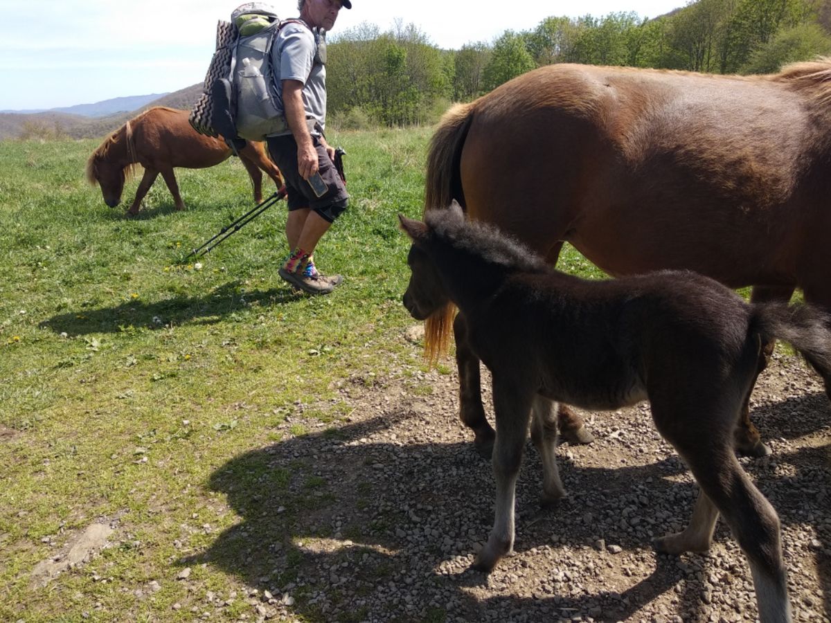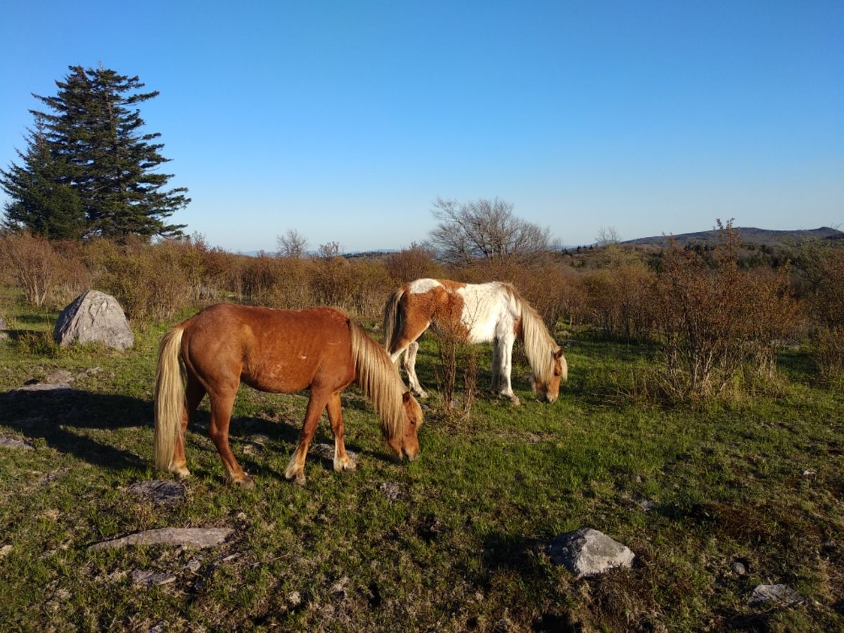 Kurz dahinter machen wir Pause am Wegesrand, während ungefähr ein Dutzend Wanderer an uns vorbei laufen und höflichen Small Talk machen. Menschen-Kino. 😉 Nachmittags steigen wir erneut bis auf 5000′ Fuß. Mehrere Brücken führen über den Fox Creek. Manchmal hüpfen wir über Steine ans andere Ufer. Beim Vorbeilaufen an der Old Orchard Shelter werden wir von einem Ridgerunner begrüßt, der anscheinend hier für Ordnung sorgt. Einige Leute haben sich bereits eingerichtet. Die besten Campsites drumherum sind besetzt. Auf einigen Plätzen stehen Rucksäcke, aber die zugehörigen Menschen sind nicht da. Unverständnis und Kopfschütteln von unserer Seite. Das ist ja wie im Hotel, wenn die Gäste schon vor dem Frühstück mit ihren Handtüchern die Liegestühle blockieren. Wie gesagt, wir gehen vorbei und noch einen Kilometer weiter. Dort kommt frisches Quellwasser aus dem Berg, ein guter Platz zum Kochen ohne Konversation mit Fremden. 😉 Danach nehmen wir die letzten 300 Höhenmeter des Tages in Angriff. Ein Aufstieg durch wilden Wald. Der Pfad ist sehr schmal. Von Baumwurzeln und Steinen durchsetzt windet er sich nach oben. Überall fließt Wasser. Schön blöd, dass wir alle unsere Flaschen an der Quelle gefüllt haben und schleppen. Aber darauf kann man sich nie verlassen, die Feuchtigkeit ist nur den starken Regengüssen der letzten Tage zu verdanken. Je höher wir kommen, umso karger wird die Vegetation. In der Abenddämmerung steht ein Reh vor uns mitten auf dem Trail. Schon mehrmals haben uns Rehe den Platz zu unserem Nachtlager gewiesen, aber heute möchten wir weiter. Der Wald endet abrupt, und vor uns liegt Wiese mit Nadelbäumchen. Es ist der Lebensraum der wilden Ponys, die eigentlich gar nicht so wild sind. Durch die vielen Wanderer sind die kleinen Pferdchen voll an die Menschen gewöhnt. Gleich zu Beginn der grünen Hügel entdecken wir unsere erste Pony-Familie. Stute, Hengst und Fohlen grasen friedlich und lassen sich durch uns nicht stören.