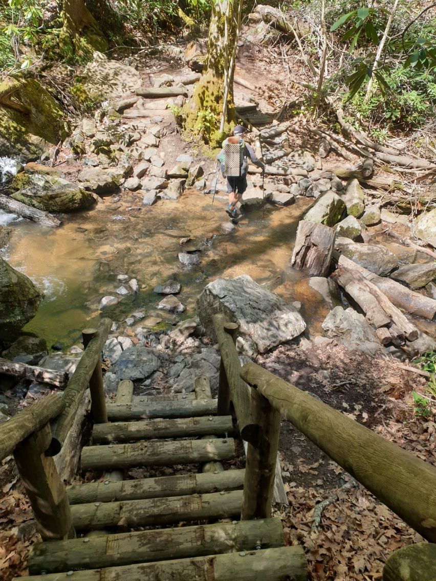 Drei Stunden Aufstieg am Morgen. Ruckzuck und mühelos sind wir auf 3700′ Fuß Höhe. Es gibt immer wieder Menschen, die unseren Tag erhellen. Dazu gehört die „Florida Family Five“. Zuerst kommen uns zwei hübsche Jungs entgegen, die eine verblüffende Ähnlichkeit miteinander haben. Thomas spricht sie an und fragt, ob sie Brüder sind. Ja, sind sie. Die Beiden sind ca. 16 und 14 Jahre, plus oder minus 1 Jahr. Sie stammen aus Florida und sind mit der ganzen Familie unterwegs. Diese Idee finden wir super, denn wir sind der Meinung, dass ein paar Monate auf einem Long Trail die beste Schule ist. Nur wenig später folgen zwei strahlende Mädels, ca. 12 und 10 Jahre. Das Schlusslicht bildet die Mutter, schlank und fit. Wir fragen uns natürlich, wo der Vater ist, ob es einen gibt und ob der vielleicht an den Schlüsselstellen mit dem Auto steht. Die 5-köpfige Familie hat einen Thru-Hike geplant, d. h. sie wollen den gesamten AT von Süden nach Norden wandern. Was für eine beeindruckende Leistung, vier Kinder jeden Tag auf’s Neue zu motivieren und die Verantwortung zu tragen. Wir reden noch lange über die „Florida Family Five“ und werden sie auf jeden Fall in bester Erinnerung behalten. 🙂 Den nächsten bleibenden Eindruck hinterlassen Mutter und erwachsener Sohn, ebenfalls beide mit der Plakette vom AT-2022. Die ältere Dame vorweg, klein und rundliche Statur, dazu mit schwerem Rucksack bepackt. Wir schätzen sie auf Mitte 70. Die Mutter läuft wie ein Hobbit, hat aber offensichtlich Freude an dem Unternehmen. Knapp dahinter folgt ihr Sohn, ein stattlicher Kerl um die 40. Erstaunliche Kombination. So eine Anstrengung über 6 Monate in der Mutter-Sohn-Kombination ist schon etwas Besonderes. 🙂 Ein Schild an einem Baum weist uns darauf hin, dass die Brücke über den Comers Creek nicht mehr existiert. Bei hohem Wasserstand soll das Überqueren des Flusses gefährlich sein, in diesem Falle wird eine Umleitung empfohlen. Etwa 3 Kilometer sind es bis dahin. Man hört schon von Weitem die Kaskaden, die den Berg hinunter plätschern. Als wir vor dem Comers Creek stehen, da relativiert sich die Gefahr. Ein kleiner Wasserfall stürzt sich vom linken Hang über Felsplatten hinunter. Heute kann man auf dicken Steinen und Baumstämmen durch den Strom balancieren, ohne nasse Füße zu bekommen.