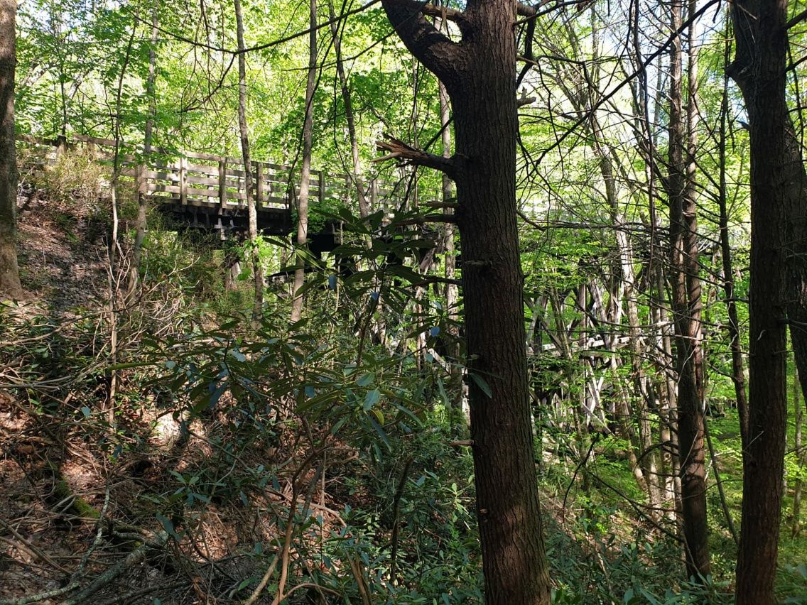 In der Nacht heulen die Wölfe ganz nah, laut und ausdauernd. Der Mond scheint hell zwischen den Bäumen hindurch und zaubert eine schöne Stimmung. Morgens gibt es nur noch einen Kaffee ohne Milchpulver und ohne Kekse. Schon wieder alles am Ende, der Proviantbeutel ist fast leer. Wir sind voll motiviert, heute noch Damascus zu erreichen. Der Trail führt abwärts. Auf halber Höhe werden die Baumwipfel grün, und es blühen die Rhododendren. Wir überqueren den Holston River auf der Luther Hassinger Memorial Bridge, einer imposanten Konstruktion aus Holz, an die wir uns noch sehr gut erinnern. Das Besondere ist, dass diese Brücke in schwindelerregender Höhe über dem Waldboden schwebt. Sie verläuft quasi zwischen den Baumwipfeln, uns erinnert es an einen Kletterwald. Thomas meint : „Wir sind jetzt auf Augenhöhe mit den Vögeln.“ Stimmt. 🙂 Die Luther Hassinger Memorial Bridge ist lang.