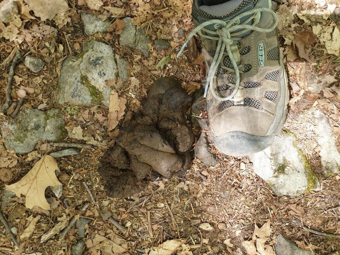 Ein bekanntes Gesicht nähert sich Arm-wedelnd, während wir noch staunend in der Mitte der Brücke stehen und den gewaltigen Eindruck wirken lassen. Das ist „Renegade“, den wir gestern bei der Trail Magic kennengelernt haben. Hiker durch und durch, ohne Familie, keine Freundin, keine Wohnung, kein Auto. Er arbeitet gerade an seinem Projekt, alle drei großen Long-Trails miteinander zu verbinden. Verrückte Idee – das wären dann ungefähr 10.000 Meilen oder 16.000 Kilometer am Stück. Natürlich sucht Renegade Sponsoren und möchte in Zukunft ein Buch schreiben. Seine Geschichten und Erfahrungen sind für uns wirklich interessant, denn die entgegenkommenden Wanderer haben erst knapp 500 Meilen hinter sich und sind diesbezüglich noch Anfänger. 😉 Virginia bleibt bis zum Schluss anstrengend, man bekommt hier nichts geschenkt. Nach der Mittagspause haben wir zwei weitere Berge vor uns, obwohl das Profil eigentlich harmlos aussieht. Ein riesiger Bärenhaufen liegt mitten auf dem Weg. Der Größe nach muss es ein ausgewachsener Schwarzbär gewesen sein.
