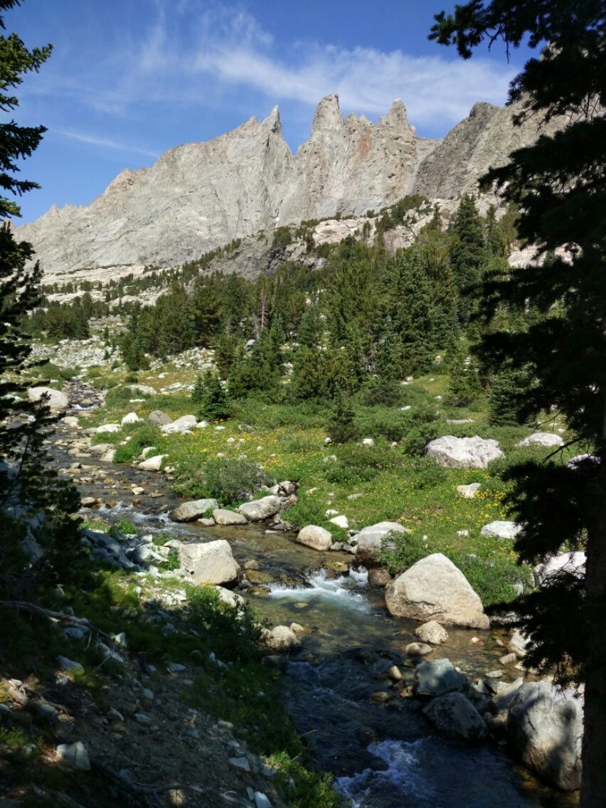 Eine hellbraune Schlange, lang und dünn, wird von Thomas aufgescheucht. Er hat sie gar nicht bemerkt, sondern ist einfach drüber gelaufen. Der Schlange ist nichts passiert, sie macht sich blitzschnell davon. Vor uns liegt eine Fluss-Überquerung. Normalerweise ist es kein Problem, über einen schmalen Baumstamm ans andere Ufer zu balancieren. Aber mir fällt das heute ohne Stöcker ziemlich schwer. Thomas ist blitzschnell auf der anderen Seite und wirft mir seine Stöcker zu. So geht es natürlich viel einfacher und ganz ohne nasse Füße. Mittagspause. Unsere Plastik-Schüsseln sind beide kaputt. Gestern haben wir einen Sprung in der ersten und heute zur Mittags-Mahlzeit einen Riss in der anderen Schlüssel entdeckt. Die haben wir seit dem Beginn des Te Araroa täglich benutzt, manchmal sogar zweimal. Nun sind sie nach fast 10 Monaten Trail-Leben beide gleichzeitig hinüber. 🙁 Unsere Alternativen, bis wir Ersatz finden : 1. Haferflocken mit Wasser kann man ganz prima aus dem Kaffee-Becher löffeln und 2. die warme Mahlzeit direkt aus dem Topf essen. Wir entdecken ein ungewöhnlich großes Insekt, welches mit ziemlicher Sicherheit die ausgewachsene Form unseres schleimigen Aliens ist. Etwa 5 Zentimeter lang, blauer Kopf mit langen Fühlern dran, gestreifter Leib, kräftige Sprungbeine, und es hat einen festen Stachel am Hinterteil. Der vermeintliche Schnabel unseres glibberigen Dings hat sich zu richtigen Beiss-Werkzeugen ausgebildet. Dieses Insekt ist bestimmt kein Pflanzenfresser, sondern ein kleines Raubtier. Es sieht nicht besonders sympathisch aus. Vermutlich haben wir dieses hässliche Vieh letzte Woche im Larven-Stadium auf dem Boden gefunden. Was genau es ist, das wissen wir aber immer noch nicht. Vielleicht eine Monster-Zikade ? Am Nachmittag treffen wir erneut auf unseren Sweetwater River, dessen Biegungen wir letztens in der Schlucht einen ganzen Tag lang gefolgt sind. Auch heute laufen wir lange Zeit parallel zum Fluss, der enorm schnell fließt. Wasser gibt es überall – was für eine Wohltat nach den trockenen Tagen in der Wüste ! 🙂 Unser Weg führt durch die Bridger Wilderness, immer weiter aufwärts. Noch laufen wir mehr oder weniger angestrengt über Hügel. Aber die ganz hohen Berge liegen schon dicht vor uns. Wir zelten am Fuße der Wind River Range, direkt vor dem Abzweiger, der uns morgen zum Cirque of the Towers bringt.