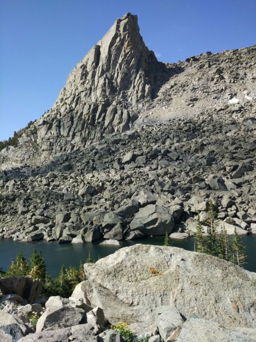 Thomas hat während der Nacht das Getrappel einer Herde von Tieren um unser Zelt herum gehört. Wahrscheinlich Bergziegen oder Dickhorn-Schafe auf dem Weg zur Tränke. Ich habe nichts gehört und nichts gesehen. Wunderschöne Morgenstimmung ! Die Oberkante der Berggipfel wird bereits von der Sonne angeleuchtet. Allerdings steht die Sonne noch nicht hoch genug, es ist kühl im Kessel. Eine der Besonderheiten unserer langen Wanderungen ist, dass wir jeden Morgen an einem anderen Ort aufwachen. Dieses Camp direkt am Ufer des Temple Lake, umgeben von den steilen Berggipfeln, ist einer unser besten Zeltplätze. Eigentlich hatten wir erwartet, dass hier mehr los ist. Die Wind River Range ist berühmt für ihre spektakuläre Szenerie, und es ist Wochenende. Trotzdem sind wir ganz alleine in der Schlucht, ringsherum nur hohe Türme aus Granit, die zum Teil noch mit Schnee bedeckt sind. Vor drei Tagen nach Verlassen von South Pass City haben wir den letzten Menschen gesehen, einen CDT-Hiker auf dem Weg nach Süden. Wir starten früh, stehen aber gleich vor einem Problem. Unser Weg führt um den See herum, aber dort liegt noch Schnee von etwa einem halben Meter Dicke. Es handelt sich nicht um eine gerade Fläche, sondern der See reicht direkt bis an einen Hang. Eine feste Schneewand mit Überhang bildet ein kaum zu überwindendes Hindernis. Thomas versucht, auf die Schneefläche zu steigen, um dort oberhalb des Wassers zu laufen. Aber sobald er einen Fuß dorthin gestellt hat, rutscht er ab. Keine Chance ! So früh am Morgen ist der Schnee knüppelhart gefroren. Die Schräge am Hang besteht aus purem Eis. Da bleibt keine andere Lösung als am Rand durch den See zu laufen. Tief ist es nicht in Ufernähe. Thomas ist mit seinen wasserdichten Hiking-Boots mit wenigen Schritten hindurch. Ich möchte nicht schon morgens um 8.00 Uhr für den Rest des Tages nasse Schuhe haben. Etwas umständlich und zeitraubend, aber ich ziehe Schuhe und Socken aus, um barfuß mit meinen Crocs durch den See zu waten. Das Wasser ist eisig ! Nachdem wir diese kritische Stelle passiert haben, muss ich noch einmal anhalten, Rucksack absetzen und mich wieder antüddeln. Meine Füße sind zwar im Moment eiskalt, aber ich bin sehr froh, dass ich diesen Umstand in Kauf genommen habe. Nicht lange danach werden wir gleich wieder herausgefordert. Die nächste steile Wand, an der wir entweder unten durch das Wasser oder oben am Hang entlang klettern müssen. Thomas entscheidet sich für Aufsteigen und Klettern, ich folge ihm. Er passiert eine knifflige Stelle relativ zügig, das hat er einfach viel besser drauf. Ich sehe mir die Passage genauer an und werde sofort unsicher. Es sind nur wenige Meter zu bewältigen, gute Griffe im Granitfelsen gibt es auch. Im Prinzip weiss ich ja, wie es geht und dass ich es kann. Dennoch ist eine Kletterpartie am steilen Hang so früh am Morgen nichts, was ich mir wünsche. Die Muskeln sind noch kalt, ich fühle mich noch nicht geschmeidig genug für so eine Aktion. Aber nützt ja nichts ….. es wird wohl Keiner kommen und mich abholen. Ich überwinde meinen inneren Schweinehund und taste mich zentimeterweise an der Felswand lang. Nach wenigen Minuten bin ich unter Schimpfen und Fluchen in Sicherheit angekommen und kann aufatmen. Der Tag hat gerade erst begonnen, und ich habe bereits in der ersten Stunde meine beiden Angstgegner ( Schnee und Klettern am steilen Hang ) besiegt. Wenn das kein guter Start ist ! 🙂 Es gibt ein wunderbares Echo zwischen den Bergen, wenn man von oben in die Schlucht hinein ruft. Wir machen eine Ton-Aufnahme für unseren Freund Piet. Oh, Helene ! 😉 Die nächsten Stunden vergehen wie im Flug. Ein See reiht sich an den nächsten : Miller Lake, Rapid Lake, Big Sandy Lake, Lonesome Lake, Texas Lake, Barren Lake, Billys Lake, Shadow Lake …. um nur die größten zu nennen. Uns begegnen zwei gut gelaunte Mädels, die eine Woche lang in der Wind River Range wandern. Die eine von Beiden ist Cloud, die wir bei den Trail Days in Silver City kennengelernt haben. Das war Ende April, ist mittlerweile also schon vier Monate her. Wir hatten damals gerade die ersten zwei Etappen mit Blasen an den Füßen hinter uns gebracht. Meine Güte – was sind wir schon lange mit Rucksack und Zelt unterwegs. Es ist ein Tag der Superlative. 🙂 Manchmal bekommen wir den Mund vor Staunen nicht wieder zu, so geniale Ausblicke haben wir auf die zackigen Türme ringsum oder auf schillernde Bergseen, in deren klarem Wasser sich die Gipfel spiegeln. Es gibt 360° -Panoramablick vom Feinsten. Wir sind einfach nur glücklich, in dieser grandiosen Natur wandern zu dürfen. 🙂 Aber dann kommt die Ernüchterung, denn vor uns liegt ein Schneefeld von ca. 300 Meter Breite. Es geht ziemlich steil abwärts. Da müssen wir durch, kein Ausweichen möglich. Thomas geht vor und macht mir eine Spur. Trotzdem ist es sehr eng, man muss ganz schmale Tritte direkt hintereinander setzen. Das alles ohne Micro-Spikes und mit nur einem Stock in der Hand. Bloß nicht nach vorne schauen, und erst recht nicht nach unten. Konzentrieren, Zähne zusammenbeißen, nicht nachdenken, sondern einfach weitergehen. Diese Schnee-Passage bringt mich an meine Grenzen. Ich hasse es ! Vor allen Dingen, wenn ich daran denke, was Cloud uns heute am Vormittag erzählt hat. Sie ist den kompletten CDT im letzten Jahr gelaufen und hat KEINEN Schnee gehabt. Uns begleitet der Schnee schon seit Cuba / New Mexico. Selbst jetzt im Hochsommer in Wyoming gibt es immer noch Ecken mit Schnee. Einfach unglaublich ! Der Jackass Pass mit 3300 Meter Höhe liegt auf unserer Strecke, ein Durchgang zwischen zwei hohen Gipfeln. Anfangs ist die Steigung durch Klettern und Hüpfen über dicke Felsbrocken gut zu meistern. Der Granit ist rauh und griffig. Nach der Hälfte wird es schwieriger, es gibt keinen eindeutigen Weg mehr. Einige Kletter-Einlagen erfordern volle Konzentration, aber insgesamt kommen wir bei diesem Aufstieg noch nicht einmal ins Schwitzen. Au
