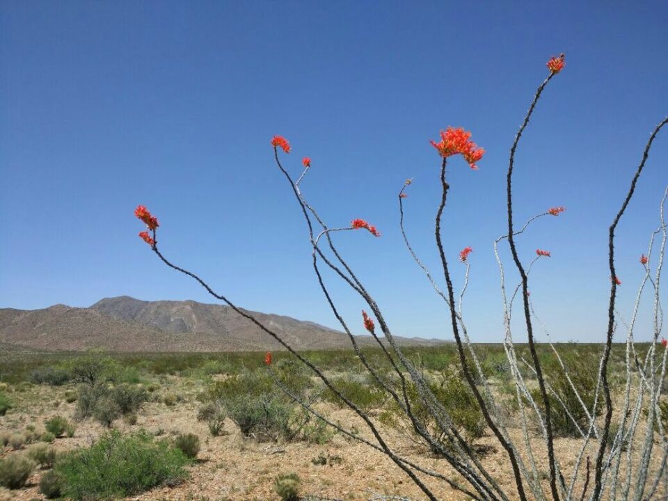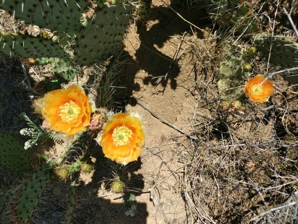 Wir befinden uns jetzt in der Chihuahua-Wüste, das ist die größte aller nordamerikanischen Wüsten. Unser Weg führt an den Flanken der Big Hatchet Mountains entlang. Unsere Rucksäcke sind viel zu schwer, obwohl wir unsere gesamte Winter-Ausrüstung und noch mehr vorausgeschickt haben bis nach Chama in Colorado. Jeder hat 5 Liter Wasser im Rucksack, zusammen tragen wir also 10 Liter Wasser und Proviant für fünf Tage. Die Wüste ist gnadenlos. Erst nach 14 Kilometern gibt es ein wenig Schatten …. einen einzelnen Baum. Hier macht wahrscheinlich jeder Wanderer Pause. Nachmittags steigt das Thermometer auf 35 Grad. Die Luft flimmert in der Hitze. Verschiedene Arten von Kakteen zeigen die ersten Blüten, viel schöner als im Blumenladen. Bilanz des ersten von über 200 Hiking-Tagen : 25 km zurückgelegt, meine Lesebrille ist zerbrochen, Thomas hat einen Wespenstich und eine kleine Blase an der Hacke zu beklagen. Tiersichtungen : Insekten, Vögel, kleine Echsen, Hasen und am Abend sogar 4 Antilopen in der Ferne. Um unser Lager herum sind große Höhlen in den Wüstensand gegraben. An den Eingängen liegen lauter Kieselsteine, so wie absichtlich dort hingelegt. Wir wissen noch nicht, was für Tiere in diesen unterirdischen Bauten leben. Für Kaninchen sind die Höhlen viel zu groß, und Hasen wohnen doch zumindest in unseren Breiten über der Erde. Nachts ein wundervoller Sternenhimmel über uns, so klar und zahlreich haben wir die Sterne sonst nur auf dem Ozean gesehen.
