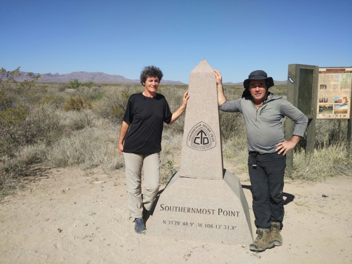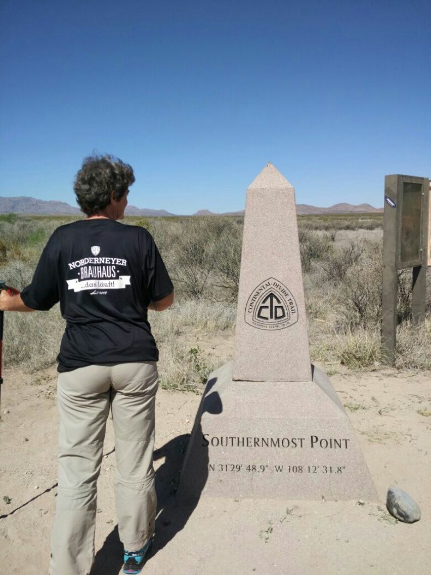 Das Crazy Cook Monument ist wirklich schön anzusehen, ein toller Punkt, um den Start des Continental Divide Trail zu würdigen. Direkt daneben befindet sich die Grenze zu Mexico, kaum zu erkennen, wenn man es nicht weiss. Ein einfacher Stacheldraht-Zaun teilt das karge Land, theoretisch leicht zu überwinden. Eine Mauer gibt es ( noch ) nicht. Thomas traut sich sogar an einer Art Viehgatter auf die andere Seite und steht dann ca. 2 Minuten lang in Mexico ( ganz ohne Pass-Kontrolle ).