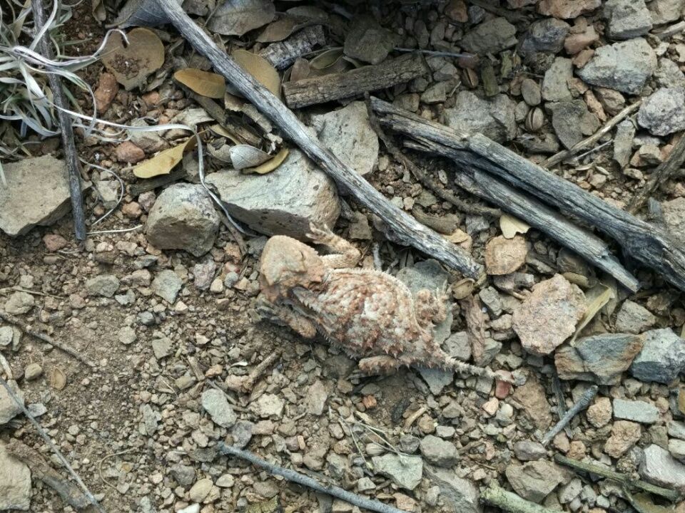Einen Wecker brauchen wir nicht. Wir werden frühzeitig von selber wach. Im Busch direkt neben unserem Zelt überbieten sich verschiedene Arten kleiner Singvögel beim Morgenkonzert. Bereits nach drei Stunden strammen Laufens, als wir gerade an Frühstückspause denken, entdecken wir in der eintönigen Wüstenlandschaft etwas Weißes leuchten. Schon am vierten Tag des CDT erwartet uns Trail Magic ! Ein älterer Herr mit Trail Namen “ Apple“ serviert eisgekühlte Getränke , Apple Pie und ein großes Sortiment an ungesunden, aber sehr kalorienhaltigen Snacks für unterzuckerte Hiker. Aber das Beste an dieser Pause ist der Schatten, den sein mit weißer Plastikplane umhülltes Metallgestell bietet. Er nennt diese Konstruktion “ The Dome „. Den ganzen Tag weht ein warmer Wind, was das Wandern etwas angenehmer macht. Thomas entdeckt eine gestreifte Echse mit Kragen, die sich vor uns aus dem Staub macht. Das ist eine Krustenechse, ein „Horned Lizard“. Des Weiteren stehen einige Schlangen-Begegnungen auf dem Programm. Ich laufe ahnungslos voraus und bemerke nichts …. Gleich dahinter läuft Thomas und wäre fast auf eine braune Schlange drauf getreten. Name unbekannt – wir sind noch nicht so vertraut mit der Flora und Fauna hier. Auf jeden Fall ist sie sehr schnell und verschwindet seitlich in den trockenen Grasbüscheln. Nur eine halbe Stunde später hat er eine weitere Schlange vor sich, die unseren Blindschleichen ähnelt. Die nächste Schlange voraus sehe ich dann endlich auch, wieder ein Stück weiter und etwa einen Meter neben dem Trail. Aber auch die hat kein Interesse an uns, sondern macht sich davon. Wir kommen an mehreren Vieh-Trögen vorbei, in denen Wasser steht. Allerdings tummeln sich dort auch Unmengen von lebenden wie toten Insekten. Ein grünlich-gelber Schleim reicht bis an die Oberfläche. Igitt !!! Zum Glück haben wir noch keine Not. Später haben wir dann aber doch ein Wasser-Problem. Die Quelle, die wir als unser Tagesziel auserkoren hatten, finden wir nicht. Zunächst sind wir zu weit gelaufen, kehren um, klettern über einige Felsen und suchen, suchen, suchen. Wir stolpern immer weiter, aber finden die Quelle nicht. Das ist schon frustrierend. Direkt neben uns liegt der Pyramid Peak, hinter dessen Gipfel wir einen spektakulären Sonnenuntergang bewundern können. Kurz bevor es ganz dunkel wird, schlagen wir unser Lager in einer sandigen Mulde auf. Es ist eindeutig unser bisher schönster Zeltplatz, fast wie in den Dünen. Wir haben leider nur noch einen Liter Wasser übrig. Das bedeutet, die Essensration wird gekürzt. Zum Kochen brauchen wir einen halben Liter, dazu gibt es einen Becher Trinken für Jeden. Das war’s, kein Tropfen Wasser mehr. Aber morgen ist ein neuer Tag …. Für heute haben wir genug getan. Mehr als 33 Kilometer auf dem Trail zurückgelegt, dazu kommen noch die Umwege beim Suchen. Zur Belohnung lassen wir den Abend gemütlich unter Milliarden funkelnder Sterne ausklingen. Jetzt würde ein Bierchen gut zur Stimmung passen.