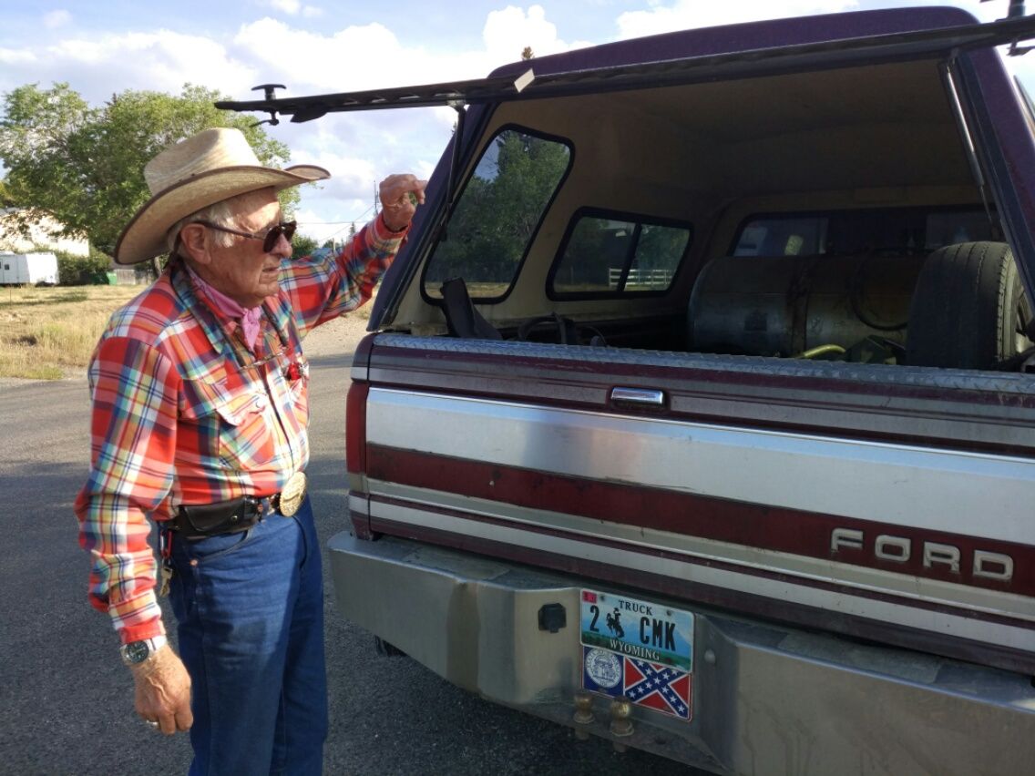 Unser Tag in Encampment ist nicht besonders spannend. Kleiner Einkauf an der Tankstelle, eine Pizza zum Mittagessen. Die meiste Zeit hängen wir im oder vor dem Café herum. Immer wieder gibt es heftige Regenschauer, so richtiges April-Wetter. Dieses Dorf ist so idyllisch, dass wir am Nachmittag genug haben und zurück zum Trail möchten. Es ist sehr wenig Verkehr, der Highway ist so ruhig wie der Ort selber. Die paar vorbeikommenden Autos sind entweder Einheimische auf dem Nachhauseweg, die nur ein paar Blocks weiter fahren oder aber Touristen mit riesigen Wohnwagen-Anhängern. Die halten sowieso nie an. 🙁 Nach mehr als zwei Stunden bin ich mächtig frustriert und schlage vor, in der Bar nebenan 1-2 Bier zu trinken. Kaum ausgesprochen, da dreht ein uralter Ford auf der Straße und hält neben uns. Der Fahrer ist extra für uns umgedreht und zurück gekommen. Schon wieder ein Opa, aber was für einer ! Ein Cowboy wie aus dem Wilden Westen, geschätzte 80 Jahre auf dem Buckel. Er ist sehr zünftig gekleidet mit einer Blue Jeans von Wrangler. Dazu trägt er einen Gürtel mit goldener Schnalle, ein kariertes Hemd, Halstuch, Cowboy-Hut und Cowboy-Stiefel. Unser Opa fährt eine alte Limousine wie aus einem Hollywood-Film. Der Wagen hat weinrote Samt-Polster, Holz-Verkleidung und aufklappbare Konsolen. Das alleine ist schon ziemlich beeindruckend. Neben sich hat der ältere Herr eine Kappe liegen mit der Aufschrift “ World War 2 Veteran „. Er erzählt uns, dass er während des 2. Weltkrieges in Europa an der Front gekämpft hat. Erst später rechnen wir mal genauer nach und kommen zu dem Ergebnis, dass dieser Mann schon mindestens 90 Jahre alt sein muss. Ein Unikat, einfach unbeschreiblich cool ! Dafür hat sich das Beine-in-den-Bauch-Stehen gelohnt. 🙂