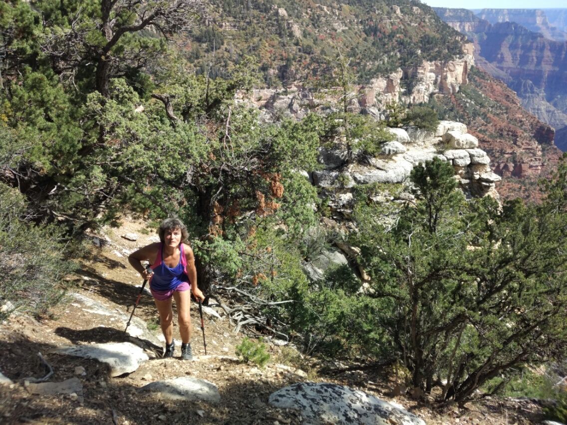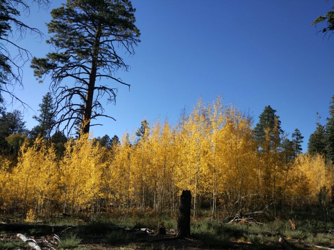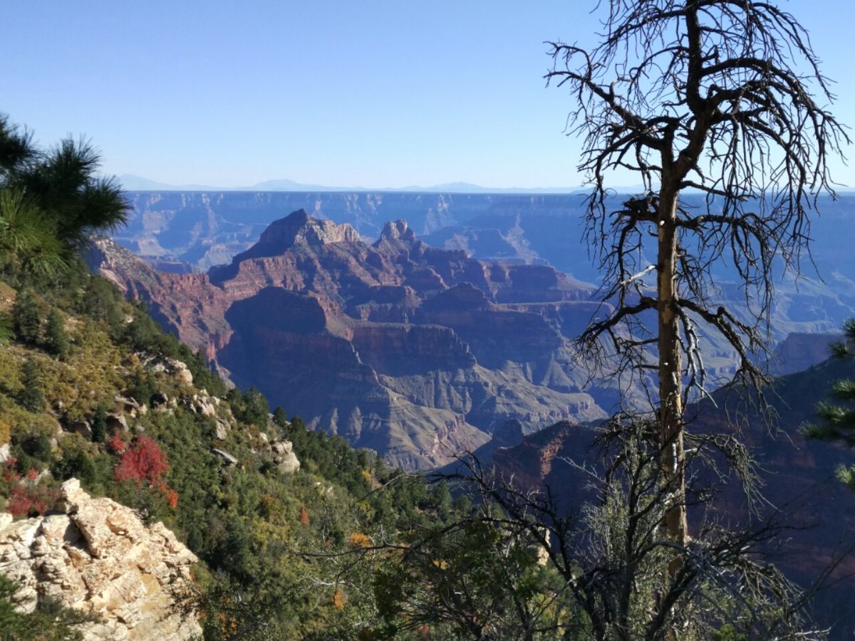 Zunächst einmal stehen wir am Sonntag eine Stunde zu früh auf, weil wir unsere Uhren nicht umgestellt haben. Trotzdem ist es um 6.00 Uhr schon hell und warm. Was für ein Unterschied zu den frostigen vergangenen drei Wochen ! Thomas geht rechtzeitig zum Ranger Office wegen unseres Backcountry Permits. Um Viertel vor acht warten dort bereits 6 Leute, die reservieren möchten, aber wir sind an zweiter Stelle auf der Warteliste. Die Situation hat sich nicht geändert, unsere gewünschten Plätze sind nicht verfügbar. Also ändern wir mal wieder unsere Pläne, damit wir morgen auf unsere 3-Tage-Tour starten können. Als Nächstes möchten wir unseren Zeltplatz für eine Nacht verlängern. Stehen um 9.00 Uhr beim Büro und erfahren, dass freie Einheiten erst nach 12.00 Uhr vergeben werden. Das Dumme ist nur, dass wir nicht einfach stehenbleiben können. Wir müssen unseren Platz bis um 11.00 Uhr räumen, das bedeutet, unser Zelt abbauen und alles im Auto verstauen. Was für ein Schwachsinn ! Jedenfalls in unseren Augen …. und die Dame im Office ist nicht kompromissbereit. 🙁 Okay, wir werden warten und wiederkommen. Wir checken aus, nutzen die Zeit für Kaffee und Internet im General Store, gehen duschen. Immer noch haben wir zwei volle Stunden zum Totschlagen. Mittags steht hinter Thomas eine junge Frau in der Schlange, die gar kein Zelt dabei hat, sondern im Auto schläft. Gestern war sie auch schon hier, musste allerdings abends aus dem Park herausfahren, weil sie keine Parzelle bekommen hatte. Das ist ja noch unverständlicher. 🙁 Theoretisch könnte der Wagen auf einem der zahlreichen Parkplätze stehen, aber das ist streng verboten. Als Thomas endlich an der Reihe ist, bekommt er tatsächlich einen neuen Zeltplatz für die nächste Nacht. Wir bilden eine Mini-Gruppe mit der jungen Frau. Drei Personen, zwei Autos und ein Zelt auf einer Parzelle zahlen dasselbe wie wir alleine. Ist nicht ganz logisch …. Die junge Frau freut sich, dass wir zusammen stehen, denn die letzte Nacht war es ihr alleine am Waldrand etwas unheimlich. Uns ist es egal. Sie ist ein nettes Mädel. Und wir sind nicht gemacht für solche starren Regeln. Im Grand Canyon Nationalpark brauchen wir die Erlaubnis und zahlen für etwas ganz Elementares : Wandern und Zelten, was wir auf dem CDT über 5 Monate lang umsonst hatten. Wahrscheinlich sind diese strengen Vorschriften notwendig, um den Besucher-Strom zu regulieren, aber deswegen müssen wir es ja trotzdem nicht toll finden. Das ganze Theater dauert bis um 13.00 Uhr, dann dürfen wir unser Zelt in einer anderen Ecke des Campingplatzes wieder aufbauen und einräumen. Wir ärgern uns sehr darüber, dass wir nun einen halben Tag mit Warten und Anstehen verbracht haben, anstatt die Gegend zu erkunden. 🙁 Am Nachmittag reicht die Zeit gerade noch für den Widforss Trail. Das sind nur 16 Kilometer über einen schönen Waldweg bis zum äußersten Ende, wo der Berg steil abfällt und eine grandiose Aussicht auf die verschiedenen Canyons freigibt. Am Widforss Point steht ein Picknick-Tisch, an dem wir Pause machen. Dann geht es auf demselben Weg wieder zurück. Trotzdem sieht aus der veränderten Perspektive alles ganz anders aus. Die Sonne scheint durch jungen Birkenwald und lässt die Blätter goldgelb leuchten. Ein richtiger Hingucker ! Nur leider bekommen wir keine Tiere zu sehen. Die sind wohl so schlau, dass sie sich in Regionen mit nicht so vielen Menschen zurückziehen …. oder erst abends aus ihrer Deckung kommen, wenn der Wald ihnen alleine gehört. 😉