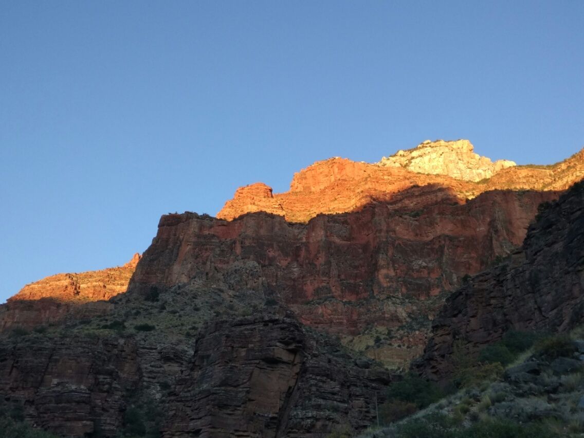 Danach starten wir voll motiviert den North Kaibab Trail. Wir möchten von Norden nach Süden durch verschiedene Canyons laufen. Es geht nur bergab, eine gut angelegte Spur, steil, aber ohne weitere Schikanen. Wir laufen durch den Supai Tunnel, einem Durchgang aus rötlichem Gestein. Von da aus geht es auf einem schmalen Pfad tiefer und tiefer in den Keller des Grand Canyons. Die hohen senkrechten Felswände zur rechten Seite, den Abgrund zur linken Seite …. Da wird es uns direkt schwindelig, wenn wir stehenbleiben und mit gerecktem Hals nach oben blicken. Anfangs begegnen uns noch manchmal ein paar Wanderer, die schwitzend auf dem Weg nach oben sind. Je weiter wir uns vom Startpunkt am Parkplatz entfernen, umso einsamer wird es. Wegen unseres späten Starts haben wir den ganzen Nachmittag Schatten, weil die Sonne bereits hinter den Bergen steht. Einmal kommt uns eine Gruppe mit 15 Maultieren am Hang entgegen. Offensichtlich werden die Mulis von Touristen geritten, die ihre eigenen Beine nicht so anstrengen wollen. Wir verlassen den Weg und machen uns an der Felswand dünne, um die Karawane vorbei zu lassen. Dabei denke ich, dass mir das Reiten auf diesem schmalen Pfad gar nicht geheuer wäre. Da laufe ich doch lieber selber und passe auf, wo ich hintrete. 😉 Über die Redwall Bridge marschieren wir weiter bis zur Roaring Forks Spring. Das ist eine Quelle, die hoch oben aus dem Berg entspringt und so einen breiten Wasserstrahl hat, dass man dazu getrost “ Wasserfall “ sagen kann. Die Roaring Forks Spring stürzt sich mehr als 50 Meter tief bis in den Canyon, wo sie sich als rauschender Bach weiter durch die Schlucht windet. Je tiefer wir kommen, umso wärmer wird die Temperatur. Am Wegesrand stehen vereinzelte Wacholder-Büsche, und es gibt wieder Kakteen. Die Abendsonne beleuchtet die Berge auf der Ostseite, die Gipfel sehen aus wie mit Gold überzogen. Gegen 18.00 Uhr erreichen wir unseren gebuchten Platz am Cottonwood Campground. Nicht ganz so eng wie befürchtet – wir haben eine eigene Parzelle mit Picknick-Tisch und verschließbarer Metallkiste für unser Essen. Tiere scheint es hier kaum zu geben. Unterwegs haben wir nur einige besonders dicke graue Eichhörnchen ( Aberthörnchen ) gesehen. Beim Abendessen fliegt eine Fledermaus mehrmals über uns hinweg ( oder waren es vielleicht zwei ?). Grillen zirpen laut, das haben wir schon lange nicht mehr gehört. Durch die Zeitverschiebung wird es schon sehr früh dunkel. Den größten Höhenunterschied haben wir heute bereits hinter uns gebracht. In den letzten drei Stunden sind wir ungefähr 1300 Höhenmeter abgestiegen in den Canyon. Ich mag mir gar nicht vorstellen, dass wir diesen steilen Weg übermorgen wieder aufsteigen müssen, um zurück zum Auto zu gelangen. 😉