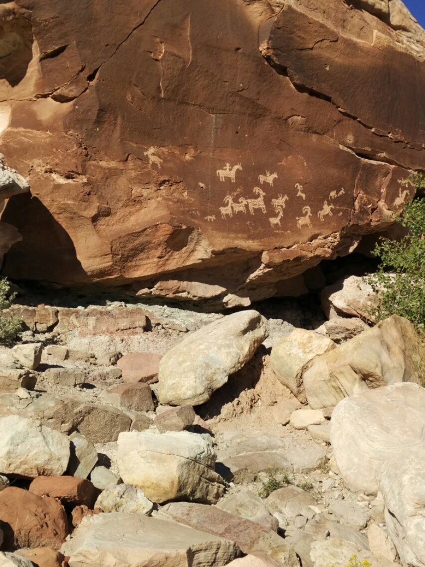 Samstag früh passieren wir erneut eine Staaten-Grenze und sind jetzt wieder in Utah. Es wird immer wärmer, seit wir die hohen Lagen Colorados verlassen haben. Stundenlang fahren wir durch öde Wüsten-Landschaft, so gut wie unbesiedelt, nur ab und an liegt eine Tankstelle am Highway. Mittags stehen wir in der Auto-Schlange am Eingang zum Arches National Park. Geduld …. 😉 Das Ticket kostet 25,- Dollar für eine Woche. Dafür dürfen wir uns über eine gewundene Straße nach oben schrauben. Erste Anlaufstation ist, wie immer, das Visitor Center. Hier müssen wir leider erkennen, dass dieses ein Autofahrer-Park ist. Der schwierigste Wanderweg hat eine Länge von nur 12 Kilometern. Wir fragen bei den Rangern nach anspruchsvolleren Hiking-Trails und bekommen einen Weg von 4 Kilometern empfohlen. 😉 Etwas weiter außerhalb entdecken wir noch den Tower Arch-Trail mit 5,5 Kilometern Länge. Das hatten wir uns irgendwie anders vorgestellt. 🙁 Wir machen eine erste Erkundungs-Tour mit dem Wagen, vorbei an Aussichtspunkten und bizarren Fels-Skulpturen. Im gesamten Park sind durch Erosion mehr als 2000 große und kleine Steinbögen entstanden. An einer Felswand gibt es gut erhaltene Petroglyphen zu sehen : stilisierte Pferde, Reiter und Bighorn-Schafe.