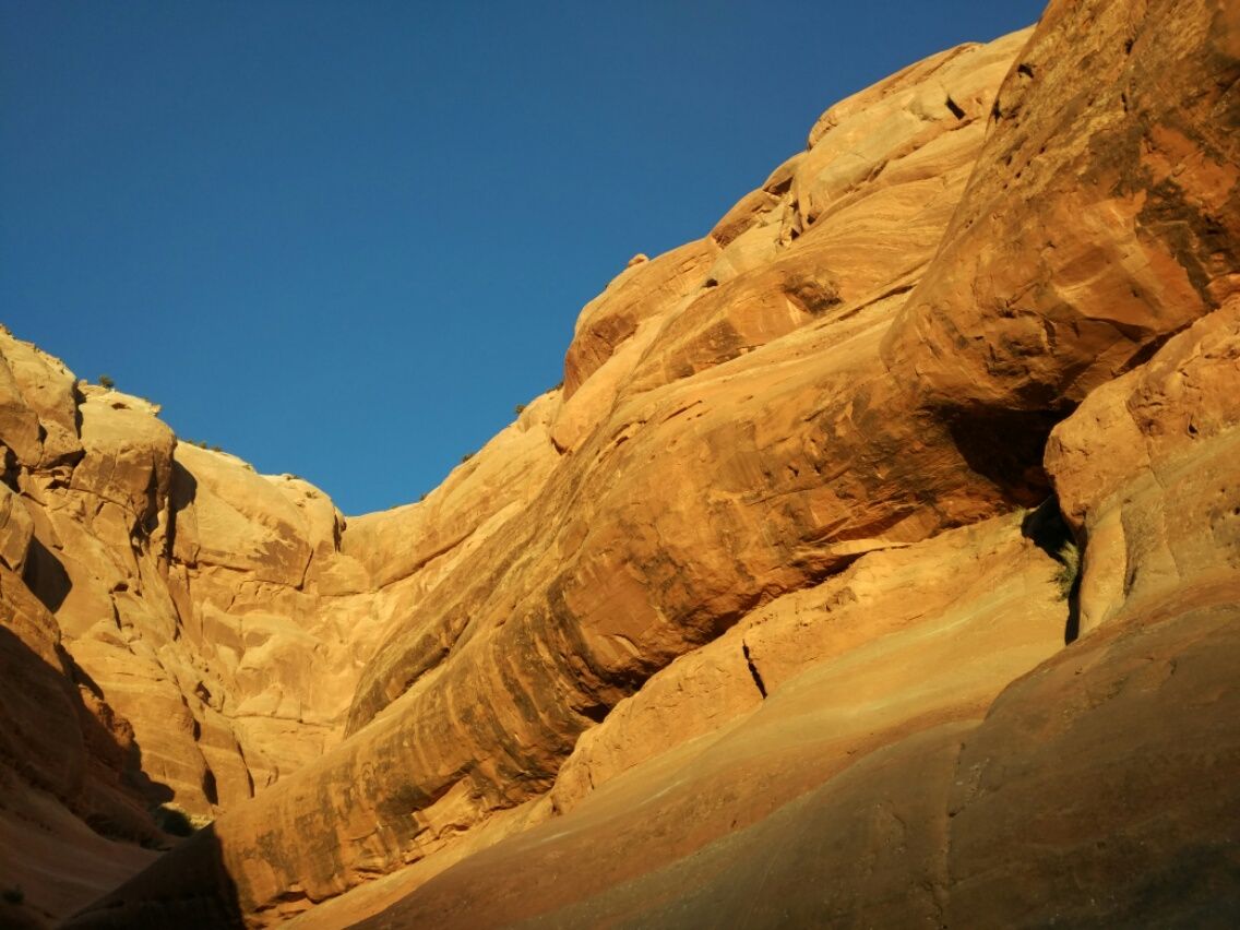 Heute laufen wir nur noch einen Mini-Trail bis zum Delicate Arch. Das ist ein hoher Bogen aus rotem Sandstein, der isoliert am Rande eines Canyons steht. Durch die Öffnung kann man im Hintergrund die La Sal Mountains sehen. Das wirkt schon toll, aber uns stören die vielen Menschen, die dort für Selfies posieren. Der Weg zum Delicate Arc wird in der Informations-Broschüre als schwierig beschrieben. Er hat eine Länge von 3 Kilometern bei einem Höhenunterschied von knapp 150 Metern. Uff ! 😉 Also für heute haben wir genug. Morgen werden wir extra früh aufstehen, um vor den Menschenmassen am Start zu sein. Dann möchten wir den Devils Garden Trail wandern sowie noch 1-2 kürzere Trails dranhängen. Wir verlassen den Nationalpark schon um 17.00 Uhr und fahren ins nahe gelegene Moab. Diese Kleinstadt hat ungefähr 5000 Einwohner und wirkt sehr touristisch. Uns gefällt es nicht, aber wir brauchen Internet, um uns einen Platz für die Nacht zu suchen. Es gibt nur einen einzigen Campingplatz im Arches Nationalpark, und den muss man 6 ( in Worten : sechs ) Monate im Voraus reservieren. Das ist ja gar nichts für uns – ziemlich doof hier. 🙁 Nur eine Viertelstunde Fahrt bis zur Kane Springs Picnic Area, wo wir kostenlos übernachten können. Ein schöner Park mit Grünflächen und dichtem Baumbestand, Toiletten, Wasser aus der Leitung, Mülleimern. In allen vier Ecken stehen überdachte Pavillons mit Tischen und Bänken, weit genug auseinander, so dass wir sogar Privatsphäre haben. Bis auf den Lärm von der Straße ist das ein sehr guter Platz, und morgen werden wir innerhalb einer halben Stunde wieder im Nationalpark sein. 🙂