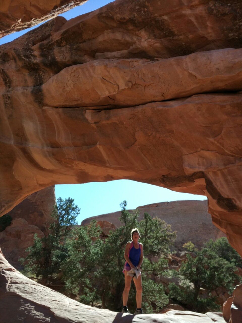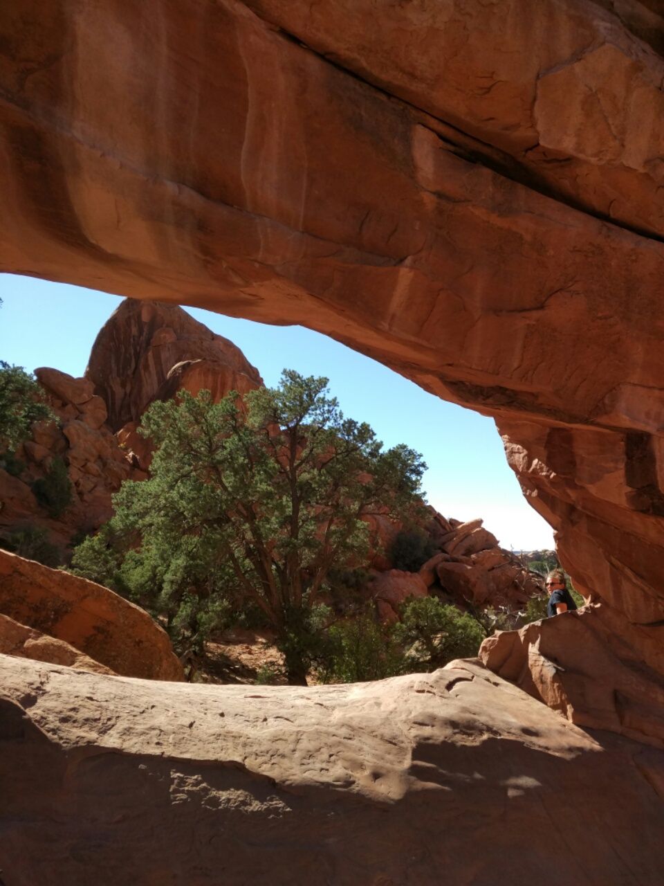 Auf jeden Fall gefällt uns dieser Teil des Devils Garden Trails ausgesprochen gut. Auch danach geht es richtig toll weiter, mit Kletterpartien und steilen Passagen. Keine Wegweiser, ab und zu ein Steinmännchen, man muss schon genau gucken und aufpassen. Irgendwann sind wir gar nicht mehr so sicher, ob wir noch richtig sind. Lange Zeit bin ich vorweg gelaufen, bis ich so meine Zweifel bekam. Dann hat Thomas die Führung übernommen und uns zwischen Felsen und Schluchten hindurch manövriert. Kaum zu glauben, dass dieses der richtige Trail sein soll ! Nachdem wir dann auch noch eine kleine Wasser-Hürde bewältigt haben, kann man schon in der Ferne viele Menschen sehen. Wir nähern uns dem Hauptweg, der uns dann wieder zurück zum Parkplatz führt. Kurz bevor wir unseren einsamen Primitive Trail verlassen, dürfen wir noch eine Reh-Mutter mit ihrem Jungtier beobachten. Die stehen plötzlich direkt vor uns neben dem Weg und sind völlig entspannt. Außer einigen Echsen und den fast zahmen Raben haben wir hier im Arches Nationalpark sonst überhaupt keine Tiere gesehen. Die längste Wanderung, die im Park existiert, war zum Glück nicht so überlaufen wie die ganzen kurzen Wege. Nur das erste Drittel war extrem nervig, da mussten wir uns durchbeißen. Dafür wurde die weiter entfernt gelegene Route am Nachmittag immer besser. Letzendlich sind wir mit dem Devils Garden Trail wohl den besten Teil aus diesem Autofahrer-Park gewandert und haben einen tollen Tag in unglaublich schöner Landschaft gehabt. Aber nun reicht es auch. 😉