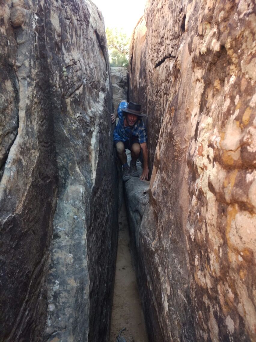Ganz nebenbei haben wir noch unseren Spaß an einer ca. 50 Meter langen Felsspalte, durch die wir uns nacheinander zwängen. Thomas macht Faxen, ich bleibe beinahe stecken.