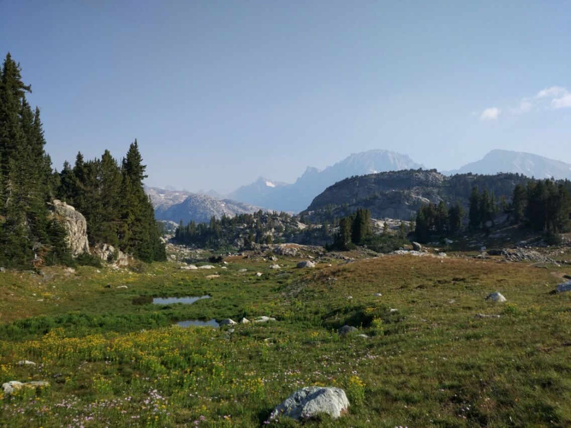 Thomas hat während der Nacht mehrere Elche im Wasser stehen sehen, als er einmal kurz draußen war. Faszinierend, was man alles ganz nebenbei beobachten kann. 🙂 Wir sind gestern bis zum Green River Lake so tief abgestiegen, dass wir heute beinahe wieder Wüsten-Vegetation haben. Es geht die ersten drei Stunden des Tages sanft bergauf. Ein Herde Antilopen sprintet über die Hügel. Zwei kleine Schlangen liegen am Weg und machen sich ins Gebüsch davon, als wir vorbei laufen. Garter Snake oder Strumpfband-Nattern sind in Nordamerika weit verbreitet und ungiftig. Nach der Pause geht es weiter mit einem knackigen Aufstieg. Zwei Stunden schieben wir uns nach oben, steil und anstrengend in der Mittagshitze. Die Pinon Ridge verläuft von Ost nach West, unser Trail verläuft über den Gunsight Pass mit 3100 Meter Höhe. Wir beobachten einen Falken im Landeanflug. Anschließend sitzt der stolze Vogel seelenruhig auf der Wiese und verzehrt seine Beute. Der Pass liegt unterhalb der Baumgrenze, deswegen ist alles schön grün. Von da an haben wir fast nur noch flaches bis leicht hügeliges Gelände für den Rest des Tages. Sehr angenehm. 🙂 Wir befinden uns jetzt im Bridger-Teton National Forest. Vor uns auf dem Weg liegt ein großer schwarzer Bären-Haufen. Die haben wir schon länger nicht mehr gesehen. Thomas übt bereits seit einigen Tagen immer mal wieder den Ernstfall. Er läuft meistens ein Stück hinter mir und ruft irgendwann ganz unerwartet “ Bären-Alarm !“ Ich muss dann möglichst schnell richtig reagieren. Laut werden, mich ganz groß machen und das Bären-Spray aus der Tasche meines Rucksacks ziehen. Beim ersten Versuch steckte die Spray-Dose an der falschen Seite, aber das kommt nicht noch einmal vor. Das Ganze ist ein bisschen so, wie wenn man das “ Mann-über-Bord „- Manöver auf dem Boot übt. Es kann ja nicht schaden, wenn man das Notfall-Szenario mehrmals durchspielt und die Abläufe verinnerlicht. Insgeheim hoffe ich nur, dass es hier keine versteckte Kamera gibt. 😉 Links von uns über dem Feld steigt ein Schwarm fetter Krähen in die Luft. Beim Näherkommen sehen wir den Grund dafür, denn da liegt eine verendete Kuh, an der wohl herumgepickt wurde. Plötzlich wird mir ganz mulmig, denn ich stolpere fast über eine riesige Portion Bären-Kacke. Ganz eindeutig nicht von einem Schwarzbären. Ein Haufen dieser Dimension kann nur von einem Grizzly sein. Es gibt sie also hier.