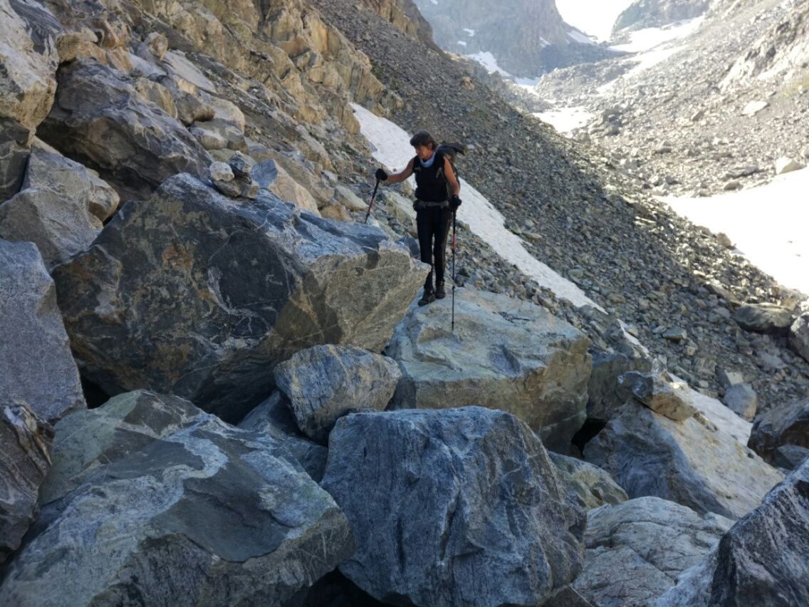 Nachts sind wir mehrmals wach geworden, weil wir unbekannte Schreie von Tieren gehört haben. Trotzdem hatten wir insgesamt mindestens 10 Stunden Schlaf, viel besser als im Zimmer. Weiße Atemwolken steigen auf, winterliche Luft im Zelt. Das Kaffee-Wasser braucht bei dieser Kälte ewig, bis es kocht. Der Himmel ist milchig. Entgegenkommende Wanderer erzählen uns, dass westlich vor uns ein großes Feuer brennt. Deswegen ist die Luft so trübe. Auf dem Indian Pass Trail kommen wir in ein Tal, wo sich etliche Bergseen aneinander reihen. Ein schmaler Pfad verläuft durch Wiese mit bunten Blumen und Felsen durchsetzt. Der Weg führt zunächst um den Island Lake herum, von dort aus folgen wir dem Titcomb Lakes Trail. Ringsherum bietet sich ein atemberaubendes Panorama. Um uns herum ragen schroffe Felswände aus Granit mit Schneewänden und Gletschern in die Höhe. Dann stehen wir am Knapsack Col, vor dem ich ein bisschen Bammel hatte. Wir haben mehrere Tage darüber geredet, ob wir diese Alternativ-Route gehen sollen, weil sie als sehr anspruchsvoll gilt. Ich habe in zwei Büchern darüber gelesen, und in beiden wird diese Passage als ganz furchtbar dargestellt. Wir beginnen mit einem supersteilen Aufstieg durch Geröll. Nicht schwierig, aber blöd zu laufen. Das ganze lose Zeug ist beweglich und rutscht bei jedem Schritt. Das bedeutet, man macht zwei Schritte nach oben und rutscht einen wieder hinunter. Überall rinnen Unmengen von Schmelzwasser. Manchmal bilden sich sogar kleine Wasserfälle, die an den Felsen herunter strömen. Links von uns liegt ein Schneehang mit Gletscher. Das ist der Twins Glacier, eine riesige glatte Eisfläche, über die wir zum Glück nicht müssen. Aber Schnee haben wir trotzdem genug am Knapsack Col, so viel hatten wir seit Colorado nicht mehr. Die nächste Herausforderung ist dann auch ein riesiges Schneefeld auf dem Weg nach oben. Den ersten Teil passieren wir schräg in einer Traverse. Dann gibt es ein größeres Stück mit Felsen und Geröll. Wir möchten einen Teil des Schneehanges umgehen und klettern an der oberen Kante entlang über die Felsen. Wackelige Angelegenheit, denn die Steine sind nicht alle fest. Die Felsen werden immer dicker und unregelmäßiger. Die Kletterei wird schwieriger, wir kommen fast nicht mehr weiter. Unser Ausweich-Manöver hat nicht viel gebracht, wir kehren zurück zum Schneehang. Dort geht es jetzt steil hinauf. Obwohl der Schnee in der Nachmittags-Sonne angeschmolzen und weich ist, muss man höllisch aufpassen, um nicht abzurutschen. Mich stresst die ganze Situation ziemlich. Darf gar nicht nach vorne schauen, wie weit es noch ist, sondern versuche mich nur auf die nächsten 2 Meter vor uns zu konzentrieren. Mittlerweile rinnt mir der Schweiß in Strömen und tropft von meinem Gesicht in den Schnee. Endlich oben angekommen habe ich nicht nur weiche Knie, sondern auch noch Pudding in den Armen von der anstrengenden Kletterei. Kann nicht mehr, will nicht mehr. Bin total genervt – besser nicht ansprechen ! 😉 Von der höchsten Stelle des Knapsack Col sehen wir einen weiteren Gletscher, den Stroud Glacier. Für einen kurzen Moment genießen wir die phantastische Aussicht und freuen uns darüber, dass wir es geschafft haben. Aber schon bald werden wir desillusioniert, denn der Abstieg ist auch nicht viel besser. Steil und rutschig, loses Geröll, kleine Steinchen, Sand. Einfach alles, was ein Hang auf dem Weg nach unten an Gemeinheiten zu bieten hat. Nicht gefährlich, wenn man sich konzentriert und gut aufpasst, aber sehr mühsam. Durch die dünnen Sohlen in meinen abgelaufenen Schuhen spüre ich jeden Stein. Und meine Knie tun weh. Ohne die neuen Stöcker hätte ich übrigens weder den Aufstieg noch den Abstieg geschafft. Inzwischen bin ich richtig wütend und schimpfe laut vor mich hin. Warum sind wir nicht einfach auf dem Original-CDT geblieben, wo wir mit viel weniger Anstrengung mehr Strecke geschafft hätten ? Okay, es war eine gemeinsame Entscheidung, über die wir lange nachgedacht haben. Irgendwo in unseren Köpfen muss ein kleines Teufelchen sitzen, dass uns immer den schwierigsten Weg nehmen lässt. 😉 Der eigentliche Auf- und Abstieg hat 3 Stunden gedauert. Tatsächlich sind wir in dieser Zeit nur 3 Meilen, also knapp 5 Kilometer, vorwärts gekommen. Insgesamt haben wir heute nur 16 Kilometer geschafft. Die Extra-Route über den Knapsack Col hat uns spektakuläre Landschaft geboten. Trotzdem ist so eine harte Tour nicht das, was ich freiwillig nochmal machen würde. Es war ein echt anstrengender Tag. Dafür gibt es ein besonders schönes Lager am Peak Lake in 3230 Meter Höhe mit eiskaltem Wasser.