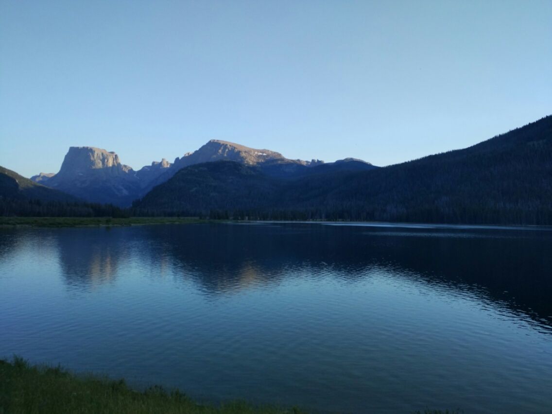 Uns begegnen zwei junge Frauen, die ein paar Tage in der Wind River Range wandern. Voraus läuft ein kräftiger Hund mit Glocke am Halsband. Damit werden sicherlich alle Tiere gewarnt und verscheucht. Beide Frauen sind mit Bären-Spray bewaffnet, eine trägt außerdem noch eine Knarre am Gürtel. Nicht so eine niedliche silberne Pistole, die in eine Damen-Handtasche passt, sondern einen richtigen Revolver. Schießen kann die Lady damit vermutlich auch. Da hat wohl kein Bär eine Chance, und böse Männer auch nicht. Die Landschaft erinnert jetzt sehr an das Great Divide Basin, gelbe Grasbüschel, stachelige Büsche und Pieker in den Schuhen. Eine braune Echse läuft im Zickzack vor mir her und verschwindet dann hinter einem verrotteten Baumstamm. Und dann schon wieder Bären-Exkremente auf dem Trail, wieder enorme Ausmaße. Diese Größe haben wir vorher noch nie gesehen, obwohl wir schon viel in Bären-Regionen gewandert sind. Bisher war alles nur Theorie, so ganz ernst genommen haben wir das Gerede und die Warnungen nicht. Aber heute sehen wir ganz deutlich die Beweise vor uns liegen. Wir befinden uns in Grizzly-Gebiet. Unser Tagesziel ist der Lake of the Woods, ein ziemlich großer See. Beim Wasserholen fallen die Moskitos über mich her und stechen durch die Kleidung. 🙁 Am anderen Ufer gegenüber scheint es eine Straße zu geben. Da steht ein schickes Wohnmobil, zum Glück weit entfernt von unserem Platz. Kurz vor Einbruch der Dunkelheit hören wir lautes Motoren-Geräusch. Wir wundern uns zuerst, woher das kommt …. Die Camper haben einen Generator angeschmissen, damit sie fein Licht und Fernsehen und was weiss ich noch alles haben. Wir sind ziemlich fassungslos. Der Strom-Erzeuger passt überhaupt nicht in diese sonst so ruhige Natur. Das Geräusch stört enorm. Warum müssen die meisten Menschen eigentlich immer Lärm machen ?
