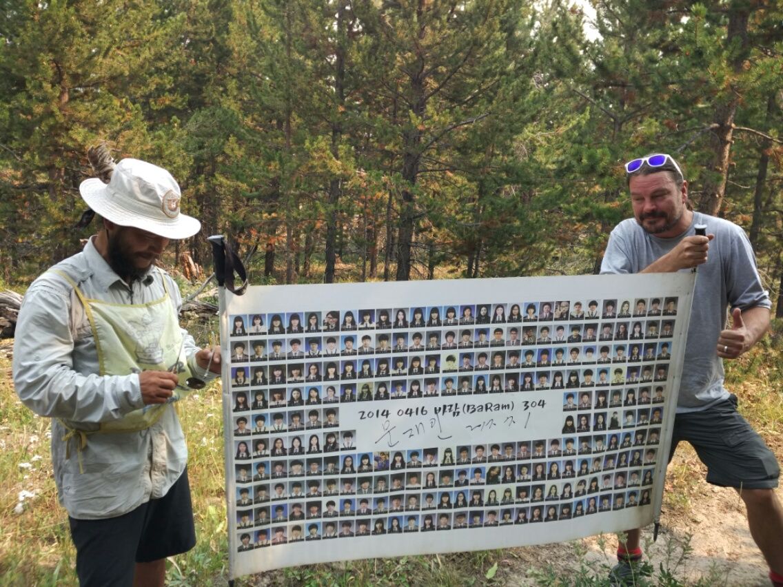 Upps – wir haben verschlafen. Als wir wach werden, da ist es schon 10 nach 8. Bis wir loskommen, vergeht nochmal eine gute Stunde. Der Himmel ist gelblich-trübe, die Luft ist rauchig. Ach ja, die Waldbrände westlich von uns …. Heute kann man das Feuer riechen, nicht besonders angenehm. Auf dem Weg sehen wir deutliche Spuren von Bären-Pfoten. Die Füße müssen riesig sein, denn die Abdrücke haben ungefähr 20 Zentimeter Durchmesser. Wir haben erst wenige Kilometer zurückgelegt, da kommen uns zwei Hiker entgegen. Ein sehr interessantes Gespann, wie wir bald darauf erfahren. Ein junger Mann aus Südkorea, der von Canada nach Mexico unterwegs ist und sein Freund, der ihn ein paar Tage begleitet. Die Beiden haben sich letztes Jahr auf dem PCT kennengelernt. Ba Ram ist auch schon den Appalachian Trail gewandert, er läuft also dieses Jahr für die Triple Crown. Das allein bietet schon genügend Gesprächsstoff, aber er hat noch viel mehr zu bieten. Ba Ram hat sich nämlich eine Aktion überlegt, für die er unterwegs ist. Er trägt eine riesige Leinwand an zwei Stöckern mit sich, die er unterwegs allen Interessierten zeigt. Darauf abgebildet sind die Köpfe der Schüler, die bei einem Schiffs-Unglück im Jahr 2014 ums Leben kamen. Die südkoreanische Regierung hat sich bislang geweigert, irgendwelche Entschädigungen an die betroffenen Familien zu zahlen. Unser engagierter CDT-Hiker möchte mit seiner Mission an die Sewol-Katastrophe erinnern und die Ungerechtigkeit öffentlich machen. Zudem steht er in Kontakt mit den Familien, die immer noch um ihre Kinder trauern. Er hält sie auf dem Laufenden und schickt ihnen Fotos von allen Leuten, mit denen er über das Unglück gesprochen hat. Gleichzeitig ist es eine politische Aktion, und er hofft, dass er etwas Positives in Bewegung bringt. Seinen Aussagen nach ist der neue südkoreanische Präsident in dieser Angelegenheit etwas zugewandter. Es kam sogar zu einem persönlichen Treffen in Washington, bei dem Präsident Moon Jae-In dieses Plakat unterschrieben hat, welches jetzt 5000 Kilometer weit durch die USA getragen wird. Hut ab vor diesem engagierten Hiker, der sich diese Aufgabe selbst gestellt hat ! 🙂 Die Idee und der gute Zweck der Sache imponieren uns.