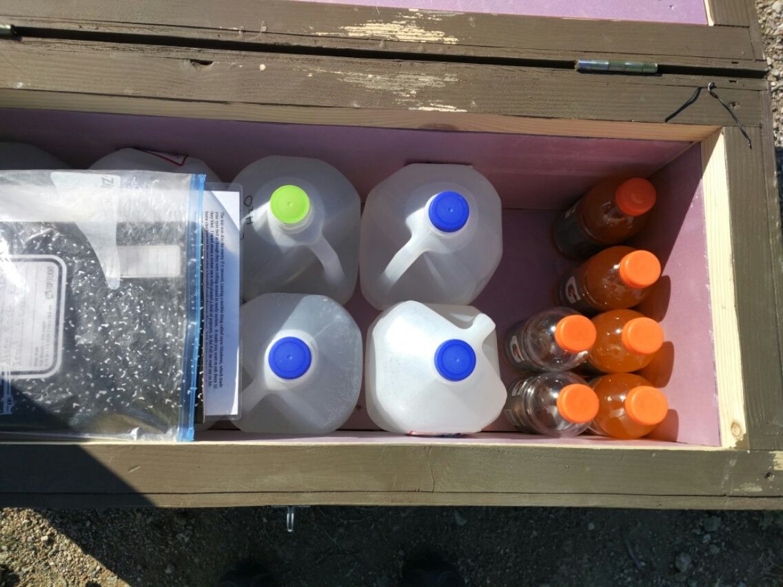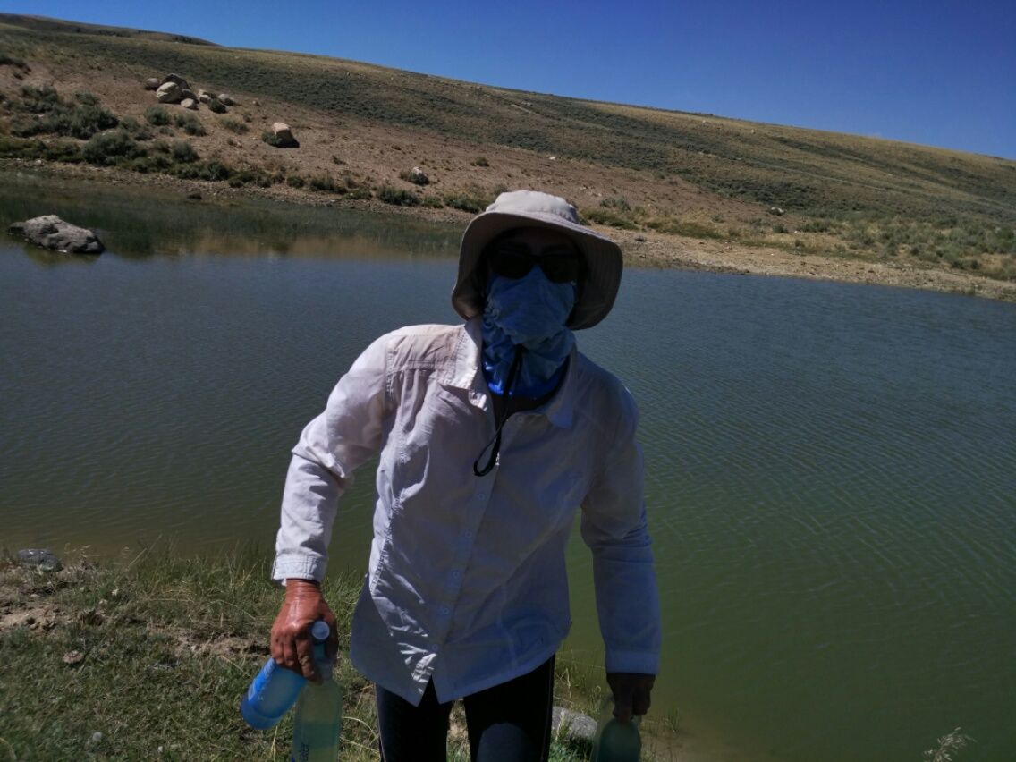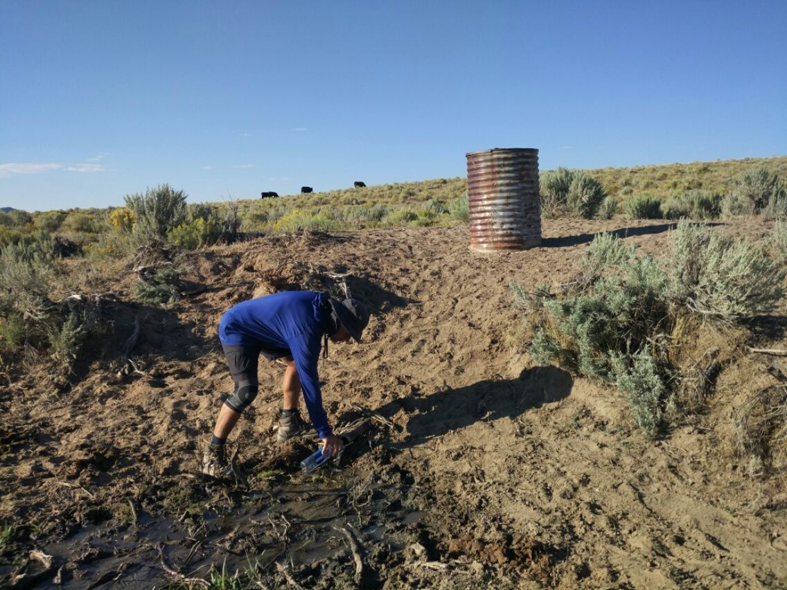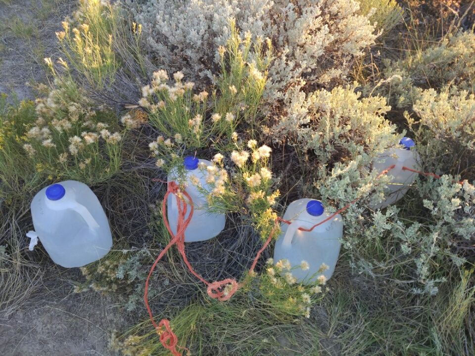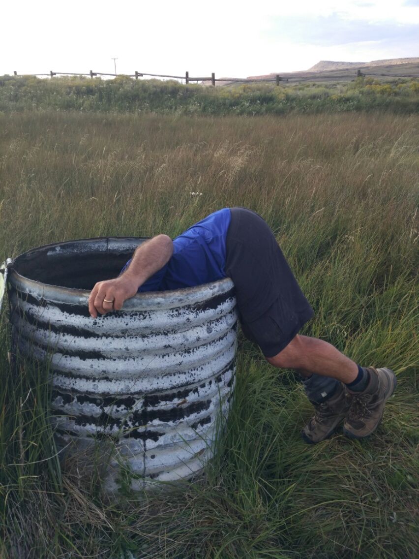 Die Landschaft im Great Divide Basin wird von Sagebrush bestimmt. Der Wüsten-Beifuss wächst überall und lässt die Ebene vor uns braun-gelb aussehen. Fiese Kakteen mit langen festen Stacheln stehen dazwischen. Man muss wieder gut aufpassen, wo man sich hinsetzt. In der Pause werden wir von Fliegenden Ameisen heimgesucht. Erst sind es nur wenige, aber dann fällt eine ganze Armee über uns her. Zeit zum Weiterlaufen. Die Luft über der Steppe flimmert in der Sonne. Seit heute sind wieder Echsen links und rechts des Trails zu sehen. Insgesamt haben wir 7 der grau-braunen Krötenechsen ( Horned Lizard ) entdeckt. Die sind hier deutlich kleiner als die Echsen in New Mexico. Einige sind eindeutig Jungtiere, die Baby-Echsen können mit ihren kurzen Beinen schon richtig schnell flitzen. Wahrscheinlich sind die erst vor Kurzem geschlüpft, weil der Winter in diesem Jahr so lange gedauert hat. Östlich von uns sieht man rote Felswände, die dieser Gegend wohl ihren Namen gegeben haben. Besonders schön sieht das aus, als die Sonne schon tiefer steht und die Felsen anleuchtet. Von Rawlins aus sind wir mit 4 Liter Flüssigkeit gestartet. Es liegen nun wieder 30 trockene Kilometer vor uns. Das Wasser für den Abend und für morgen entnehmen wir bei der Fish Pond Springs. Thomas muss sich tief über Kopf in ein Fass beugen, um an das kühle Nass zu kommen.