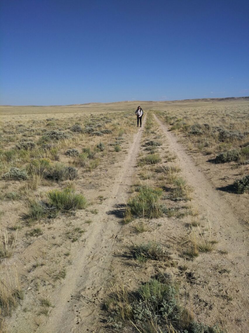 Das rechte Knie von Thomas ist nicht gut. Wir müssen reduziert laufen, das sind in diesem flachen Gelände aktuell zwischen 30 und 35 Kilometer am Tag. Die Landschaft bleibt den ganzen Tag gleich. Auch die Aussicht zu beiden Seiten verändert sich nicht. Einzig die Tier-Sichtungen sind unterschiedlich. Früh am Morgen sehen wir eine Gruppe von vier Mustangs in der Ferne. Das könnte der Pascha von gestern mit seinem kleinen Harem sein. Später nochmal eine Herde von ca. 20 Wildpferden, die dicht gedrängt an einem Wasserloch stehen. Ab und zu weiden Rinderherden auf dieser grenzenlosen Ebene. Vereinzelte Antilopen springen durch die Gegend. Die sind immer am Rennen, ständig auf der Flucht, wenn sie uns Menschen nur von Weitem sehen. Unzählige Echsen fühlen sich offensichtlich wohl in diesem Klima. Uns ist es heute entschieden zu heiß. Blauer Himmel, kein Wölkchen, kein einziger Baum, kein bisschen Schatten. Früh am Morgen laufe ich zwei Stunden in Shorts, danach bevorzuge ich lieber wieder meine Sonnenschutz-Kleidung. Lange Hose, langärmelige Bluse, Sonnenhut, Sonnenbrille, Halstuch und Handschuhe wie Michael Jackson. Wenn wir gegen die Sonne laufen, ziehe ich mir das Tuch über Mund und Nase bis zum Rand der Sonnenbrille hoch und sehe dann aus wie ein Bandit. 😉 Thomas muss wegen seiner Knie-Bandage in kurzer Hose gehen. Seine gleichmäßig braun gebrannten Waden erinnern mich an knusprige Hähnchen-Schenkel. 🙂 Gegen Mittag erreichen wir einen künstlich angelegten See, wo wir recht gutes Wasser entnehmen können. Da steht ein Holzschild, an dessen zwei Pfosten wir unseren Poncho befestigen, um der Sonne zu entgehen. Lange Pause, wir möchten gar nicht mehr weiter. Wasser und Schatten – da fällt das Weiterlaufen schwer. Nachmittags begegnen wir einer weiteren Herde Mustangs, insgesamt sieben Stück. Diese Gruppe fällt dadurch auf, dass sie alle sehr unterschiedliches Fell haben. Da gibt es braun und schwarz und gescheckt, eine Stute ist vorne hellgrau, die hintere Hälfte ist weiß. Diese Pferde sind nicht scheu und zeigen ein gewisses Interesse an uns. Sie bleiben eine Weile stehen, schauen uns entgegen, kommen ein paar Schritte näher. Dann, wie auf Kommando, drehen sie um und galoppieren geschlossen über die weite Steppe davon. Ein toller Anblick ! Sehr muskulös und doch elegant. So schöne Tiere ! 🙂 Stunde um Stunde marschieren wir in einer trockenen Dünen-Landschaft und spulen unsere Meilen ab. Es gibt nicht viel zu sehen. Hin und wieder eine Herde Gabelböcke, dann nochmal einige wilde Pferde in der Ferne. Zum Abend hin sind wir plötzlich von Kühen umzingelt. Wir müssen uns wohl oder übel mit denen das Wasser teilen. Der Kuh-Tümpel sieht schlimm aus, völlig verunreinigt. Eigentlich ist mehr brauner Matsch als Wasser im Teich. Aber auf den zweiten Blick entdecken wir ein Rohr, aus dem sauberes Wasser in den Tümpel läuft. Wir wissen zwar nicht, wie das funktioniert und wo die Pumpe ist, aber anscheinend handelt es sich um sauberes Grundwasser. Wir füllen unsere Flaschen, packen 5 Liter Wasser ein und marschieren vollbeladen noch ein Stündchen weiter. Beim Auspacken am Lagerplatz stelle ich fest, dass ich etwas Wichtiges verloren habe. Ich laufe schon seit Rawlins ohne meine Hiking-Stöcker, weil ich sie in diesem flachen Gelände nicht brauche. Damit gebe ich auch den offenen Stellen in meinen Hand-Innenflächen mal eine Chance zu heilen. Die Stöcker habe ich klein zusammengeschoben außen in meinen Seitentaschen vom Rucksack befestigt. Heute nicht – ich habe sie an unserem letzten Zeltplatz im Gebüsch liegenlassen. Ungefähr 35 Kilometer zurück …. das wären zwei volle Tage Laufen, um die Stöcker wieder zu holen und erneut bis hierhin zu kommen. Nein, danke. 🙁 Ich ärgere mich kurz über meine Blödheit, Thomas schreibt die Dinger sofort ab. Vielleicht hat sie ja ein nachfolgender Hiker gefunden und mitgenommen. Im nächsten Ort werden neue bestellt, kosten knapp 100,- Euro, aber auf so ein wichtiges Ausrüstungsteil können wir nicht verzichten.