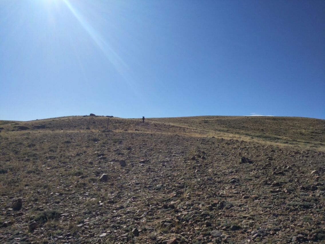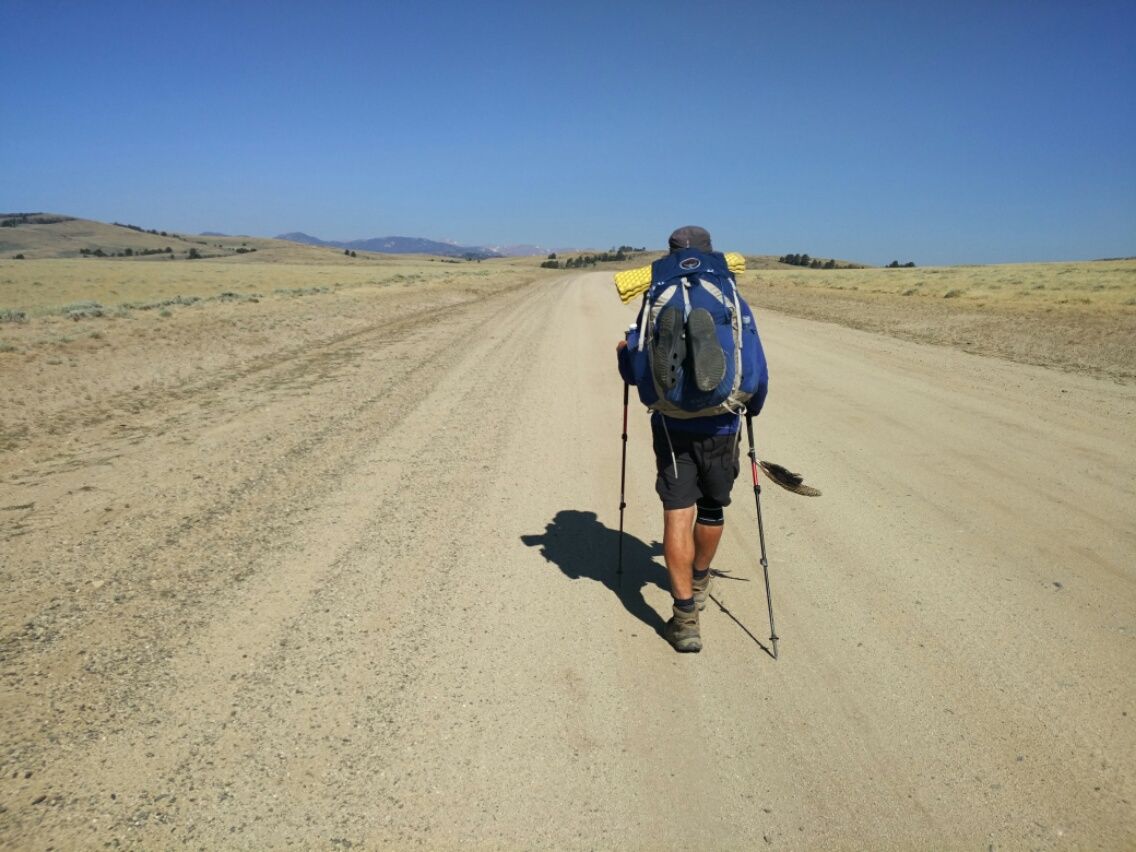 Gestern hatten wir spät am Abend noch Besuch von einem großen Tier. Man konnte spüren, wie sich schwere Tritte näherten. Da war ein ganz tiefes Muhen und Grunzen, wie wir es von Kühen noch nie gehört haben. Dazu kontinuierliches Mampfen von Gras, während die stampfenden Schritte weiterziehen. Kühe laufen normalerweise nicht im Dunkeln durch die Gegend, und schon gar nicht alleine. Wir vermuten, dass ein kräftiger Bulle um unser Zelt herum gelaufen ist. Beim Leuchten mit der Taschenlampe gab es nichts zu erkennen, nur tiefschwarze Nacht draußen. Aber wir sehen am Morgen sehr große Hufabdrücke eines Paarhufers auf dem Weg. Die eintönige Landschaft ändert sich, es wird tatsächlich ein wenig hügelig. Ein leichter Anstieg von 350 Metern bringt uns in ein Gelände, wo sogar vereinzelt mickrige Kiefern stehen. In der Ferne voraus ist eine hohe Bergkette zu erkennen. Zackige Konturen, auf den Gipfeln liegt immer noch Schnee. Das muss die Wind River Range sein, unsere nächste Aufgabe nach dem Durchqueren des Great Divide Basin. Auf dem Trail sind deutliche Spuren von Katzen zu sehen. Die Raubkatze muss ziemlich lange Krallen haben, die sich tief in den Sand eingegraben haben. Keine Wolke am Himmel. Es ist heiß. Sonnencreme mit Schutzfaktor 50 für’s Gesicht. Mittags wird die Prozedur noch einmal wiederholt. Am Besten hilft meine Vermummungs-Taktik. Wir machen an einer eingezäunten Wasserquelle Pause, erstaunlicherweise ist dort alles voller Kuhfladen. Da fragt man sich doch, wie die Kühe dorthin gekommen sind. Anscheinend sind sie über den Zaun aus Holzbalken gesprungen. Der Kadaver eines großen Tieres liegt an einer Seite. Schwarze Vögel steigen davon auf. Es stinkt fürchterlich. Ich kann gar nicht genau sagen, was es war, weil ich nicht näher herangehen mag. Vermutlich ein Rind, das von den Greifvögeln und vierbeinigen Raubtieren jetzt fein säuberlich zerfleddert wird. Die Wasserquelle ist nur ein müdes Rinnsal. Wir nehmen gerade so viel, wie wir aktuell zum Kochen und Trinken brauchen. Den ganzen Tag wandern wir in der prallen Sonne durch die Crooks Mountains. Dazu weht ein kräftiger Wind, meistens kommt er von vorne. Und der Trail geht tatsächlich wieder über jeden Hügel, der im Weg liegt. Wir laufen Schleifen, Serpentinen, Umwege, anscheinend sinnlose Wegführung. Haben heute wieder eine 20 Kilometer lange wasserlose Strecke vor uns. Feierabend gibt es erst an einem See, der allerdings noch in weiter Ferne liegt. Wir haben beschlossen, auf jeden Fall bis zu diesem Teich zu laufen, damit wir nicht so viele Liter stundenlang tragen müssen. Es wird ein langer Tag ! Das Knie von Thomas hat sich gebessert, er hat in diesem einfachen Terrain kaum Schmerzen. Trotzdem machen wir mehrere Pausen zwischendurch und erreichen unseren Feierabend-Platz erst um 20.00 Uhr, kurz bevor die Sonne untergeht. Eigentlich hätten wir noch hinunter zum morastigen Teich steigen , Wasser holen und filtern müssen …. aber es gibt Trail Magic von Hawkeye. 🙂 Auf einer etwas breiteren Schotterstraße finden wir mehr als ein Dutzend Kanister mit sauberem Wasser. Das erleichtert die Sache natürlich, wir nehmen gleich zwei Kanister mit zu unserem Lager. Ich habe wohl einmal zu viel über’s Essen gemeckert. Zur Strafe muss ich heute kochen. 😉