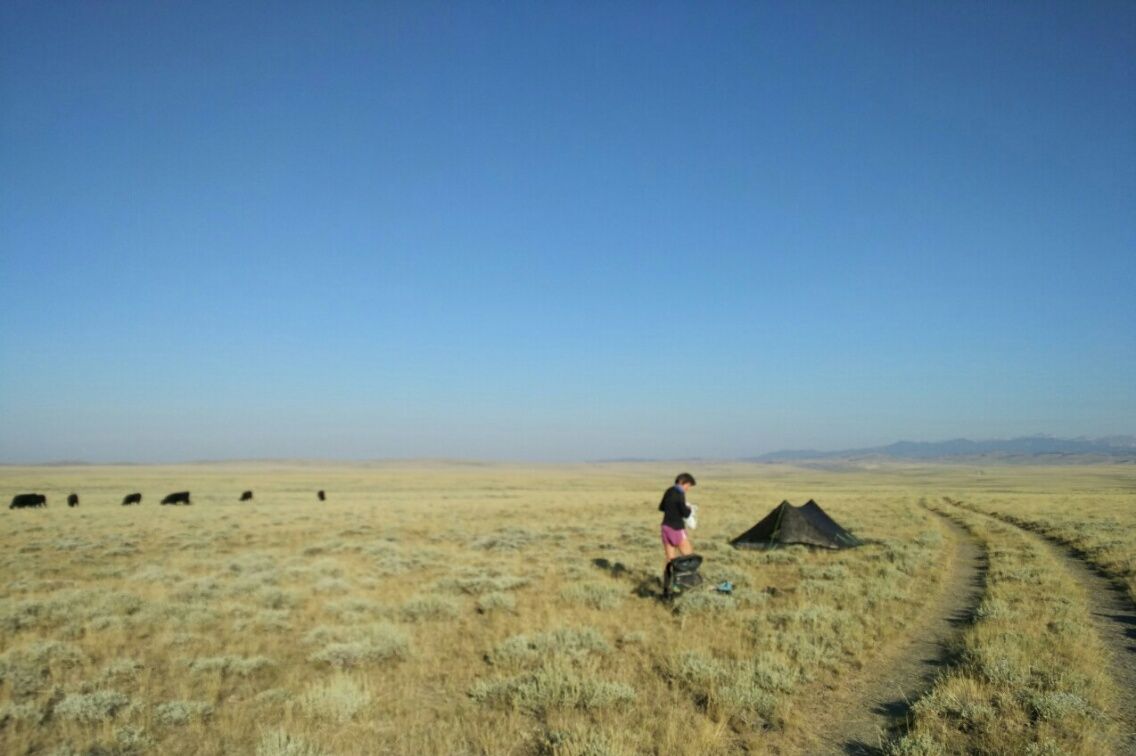 Unserer erster Blick aus dem Zelt zeigt öde flache Landschaft in gelb-braunen Farbtönen. Eine Gruppe schwarzer Kühe hat sich angenähert. Die Damen stehen in respektvollem Abstand und schauen uns bei der Morgen-Routine zu. Es sind nur ungefähr 15 Kilometer bis nach Atlantic City. Diese Häuser-Ansammlung liegt nicht auf dem CDT, sondern erfordert einen kleinen Umweg. Langweilige Schotterstraße, dieselbe Ansicht wie die ersten vier Tage in der Wüste. Unsere Rucksäcke sind angenehm leicht. Die Futterbeutel sind leer, und wir müssen kein Wasser mitnehmen. Wir tragen zwar mehr Proviant in den letzten beiden Etappen, aber wir essen auch viel besser. Mehr Masse, mehr Kalorien und mehr Geschmack. 🙂 Inzwischen kann ich zu jeder Tageszeit Öl-Sardinen essen, zum Frühstück, als Vorspeise oder als Dessert nach der Haupt-Mahlzeit. Hauptsache Fett und Protein ! 😉 Zwei tote Hasen liegen am Straßenrand, erstaunlich große Tiere. Und wir kommen an zwei plattgefahrenen Schlangen vorbei. Das ist schon eine Kunst, bei dem wenigen Verkehr unter ein Auto zu geraten.
