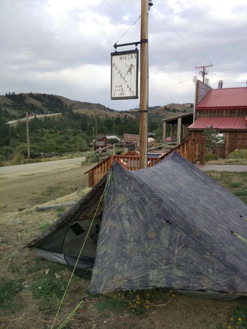 Schnelles Vorwärtskommen, gegen 12.00 Uhr mittags sind wir bereits da. Die erwartete Imbiss-Bude erweist sich als waschechter Western-Saloon. Echt urig ! 🙂 Die Lady in “ Miner’s Grubstake “ empfängt uns herzlich und kocht eine frische Kanne Kaffee für uns, obwohl die Frühstücks-Zeit schon vorbei ist. Es gibt sogar eine Speisekarte, das Essen ist lecker. Allerdings wird auf Papptellern serviert. Ganz ähnlich wie auch in Pie Town, einem winzigen Dorf in New Mexico, ist hier wohl auch das öffentliche Tragen von Waffen nichts Ungewöhnliches. Viele männliche Besucher des Saloons tragen Revolver am Gürtel. Neben der Eingangstür steht ein Gewehr, wahrscheinlich um böses Gesindel abzuschrecken. Der ganze Laden ist mit Relikten aus der Vergangenheit dekoriert. Der präparierte Kopf eines riesigen Bisons hängt im Gastraum an der Wand und schaut uns beim Essen zu. Wir kommen uns wirklich ein bisschen vor wie im Wilden Westen. Nach aktuellen Aussagen eines Einheimischen leben hier zur Zeit genau 36 Menschen. 😉 Wir treffen einen Radfahrer auf dem Weg von Canada nach Mexico. Nach kurzem Gespräch und Informations-Austausch schenkt er uns sein nicht mehr benötigtes Bären-Spray. Das ist für uns sehr wertvoll, wir hätten uns sonst vor dem Eintritt in den Yellowstone National Park im Waffengeschäft eine Dose kaufen müssen. In der Zukunft werden wir es auf dem Trail nicht nur mit Schwarz- und Braunbären zu tun haben, sondern dort leben auch die gefährlicheren Grizzlys. Wir fühlen uns wohl in Atlantic City und werden eine Nacht bleiben. Die Lady vom Saloon erlaubt uns, auf dem Rasen vor ihrem Restaurant das Zelt aufzubauen. Super ! Übernachtung kostenlos, aber auch ziemlich clever. Wir lassen einen Haufen Geld hier, denn wir verzehren Mittagessen, Abendessen und etliche Dosen kalter Getränke zwischendurch. Das Frühstück morgen ist auch gesichert, danach geht es dann weiter nach South Pass City. 🙂