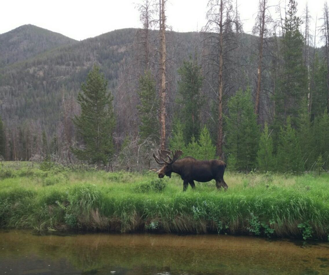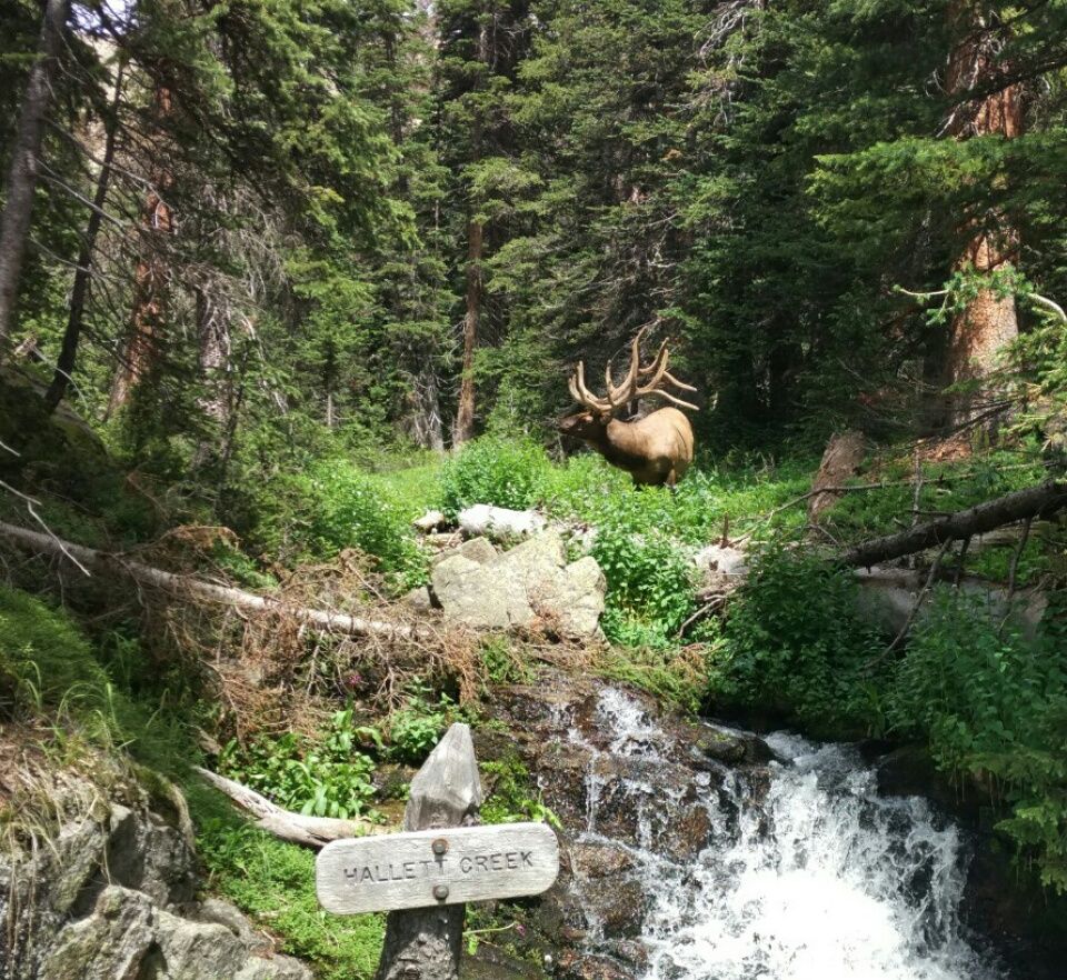 Wir sind während der Nacht nicht von Bären überfallen worden. Haben ja auch ausnahmsweise unsere Lebensmittel in einem Bären-Kanister sicher deponiert. 😉 Zwei Abdrücke von Bärenpfoten im Matsch, das ist alles, was wir zu sehen bekommen. Dafür haben wir ganz besonders tolle Begegnungen mit Hirschen und Elchen. Die sind hier im Nationalpark gar nicht scheu, sondern anscheinend an Menschen gewöhnt. Und sie vermehren sich ungestört, weil sie nicht gejagt werden. 🙂 Westlich von unserem Trail liegen die „Never Summer Mountains“. Etliche Gipfel mit knapp 13000 Fuß Höhe, das sind etwas unter 4000 Meter, reihen sich aneinander. Eine Menge Schnee liegt noch in den Nordflanken und Gletscherspalten. Der höchste Berg auf unserer Route ist der Flattop Mountain, den wir aber unterhalb des Gipfels passieren. Es sind zu viele Menschen oben, die einen Tagesausflug machen. Erinnert zu sehr an den Mount Elbert, wir genießen die Berge lieber ohne Menschenmassen. Der Rocky Mountain National Park ist ansonsten nicht so überlaufen wie wir befürchtet haben. Durch die Reglementierungen der Nationalpark-Behörde und die Pflicht zur Reservierung der Campsites gibt es eine gute Kontrolle, so dass die Besucherzahl in Grenzen gehalten wird. Wir treffen zwar hin und wieder ( vielleicht jede Stunde ) auf Wanderer, aber uns begegnet kein einziger CDT-Hiker. Die werden wohl überwiegend die schnelle Variante wählen, entweder die 1-Tages-Tour durch den Park oder die Abkürzung. Am Vormittag liegt eine lange Strecke auf einer Hochebene vor uns. Zu Beginn des Aufstiegs lesen wir auf einem Schild über die Gefahren bei Gewitter, die Verhaltens-Regeln bei Wetter-Änderung usw. Dann folgt der lange Aufstieg bis über die Baumgrenze und weiter. Belohnt werden wir mit einer mehrstündigen einfachen Wanderung und grandioser Natur. In der Ferne entdeckt Thomas etwas, was aussieht, wie die Äste eines toten Baumes. Beim Näherkommen erkennen wir, dass es sich um das Geweih eines Wapiti-Hirsches handelt. So ein gewaltiges Geweih haben wir noch nie gesehen. Das ist der größte Hirsch, der uns bisher begegnet ist, ein 10-Ender. Ganz entspannt liegt dieses stattliche Tier im Gras und frisst. Nicht weit davon weidet noch ein zweiter Hirsch, kleineres Geweih, also deutlich jünger. Wir sind total beeindruckt und froh, dass hier im Nationalpark nicht gejagt werden darf. Nach Verlassen der Hochebene laufen wir durch eine Steinmännchen-Allee. Das sieht verrückt aus ! Zu beiden Seiten des Trails sind etwa alle 10 Meter Steinmännchen aufgebaut, die eine Höhe von mehr als einem Meter haben. Wahrscheinlich, weil dieser Weg auch im Winter bei Schnee begangen wird. So viel Steine sind verbaut, so viel Arbeit …. wer hat sich wohl diese Mühe gemacht ? Eine Baumstamm-Brücke führt am Hallett Creek über den Fluss. Hier stolpern wir fast in eine weitere Gruppe von Wapiti-Hirschen hinein. Erstmal entdecken wir einen kapitalen Hirsch ganz nah am Wegesrand, der keine Anstalten macht, vor uns wegzulaufen. Ebenfalls ein ansehnliches Exemplar, ein mächtiger Wapiti mit 7-Ender-Geweih. Nachdem wir genug beobachtet und fotografiert haben, balancieren wir über den Baumstamm und sehen auf der anderen Seite zwei weitere jüngere Wapiti-Hirsche. Weiter folgen wir dem Weg an einem lebhaften Fluss entlang, der uns bis zu den Cascade Falls bringt. Ganz nett, diese Wasserfälle, aber wir halten uns nicht lange auf. Ab hier treffen wir dauernd auf Wanderer, denn wir sind bereits im Einzugsgebiet des Parkplatzes. Aber vorher wird uns noch ein besonderes Schauspiel geboten : Zwei Elche, ausgewachsene Männchen mit riesigen Schaufeln, stehen auf der Wiese am gegenüberliegenden Ufer. Sie sind keine 10 Meter von uns entfernt, aber entweder blind und taub oder völlig desinteressiert an uns Menschen. Lange beobachten wir diese behäbigen Tiere, die sich beinahe nicht vom Fleck rühren. Fressen, ab und zu mal den Kopf heben, uns ansehen und weiter fressen. Faszinierend ! 🙂 Wenn das eine Aufgabe des Nationalparks ist, diesen Tieren so viel ungestörten Lebensraum zu bieten, dann sind die vielen Vorschriften absolut sinnvoll und unser Geld für die Übernachtung gut angelegt. Wir flüchten, als sich immer mehr Wanderer einfinden, stehenbleiben und Elche beobachten. In den letzten zwei Tagen sind wir nun 60 zusätzliche Kilometer gelaufen, die nicht zum Continental Divide Trail gehören. Als ob der CDT nicht lang genug wäre ! 😉 Wir schaffen es gerade noch, vor Ladenschluss um 19.00 Uhr ein paar Lebensmittel einzukaufen, kochen, duschen und freuen uns darüber, dass wir im Haus von Shelley und Jim wohnen dürfen. 🙂