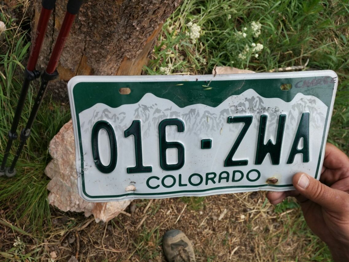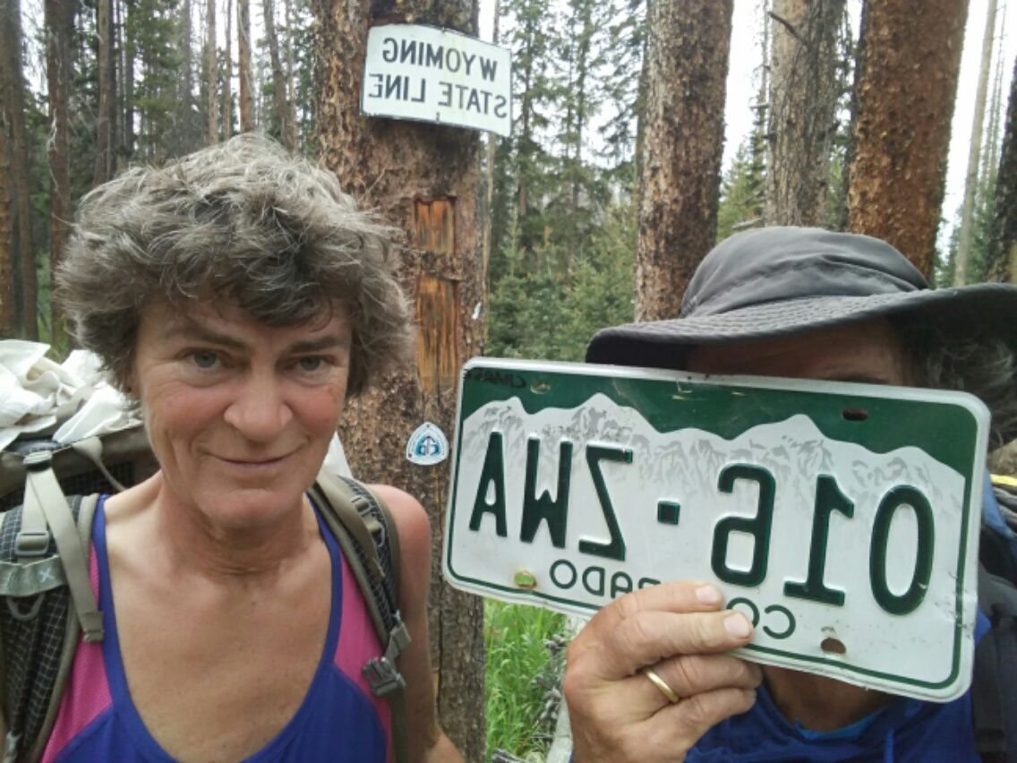 Die sogenannte Straße, auf der wir umgeleitet werden, ist eine schon lange nicht mehr genutzte Schotterpiste. Dicke Steine, Schlaglöcher und vom Regen ausgewaschene tiefe Rinnen. In einer Bodensenke gibt es sogar fließendes Wasser. Ein kleiner Fluss hat die Schotterstraße komplett überspült. Es ist erstaunlich tief, so dass wir nach einer geeigneten Stelle zum Überqueren suchen. Ein Stückchen oberhalb der Senke scheint es möglich zu sein. Aber dafür müssen wir uns durch nasse Sträucher zwängen und unter tropfenden Bäumen hindurch. Bei dieser Aktion werden wir richtig nass, nur die Schuhe eben nicht. Anschließend geht es auf Trittsteinen trockenen Fußes auf die andere Seite. Kein Auto fährt hier, keine Menschen in Sicht. Nur ein Reh erscheint hinter einer Kurve. Es ist völlig entspannt und läuft uns sogar ein Stück auf dem Weg entgegen. Nach der Umleitung treffen wir wieder auf den Wyoming-Trail, der natürlich stetig bergauf führt. Auf einem sonnigen Abschnitt können wir reichlich Himbeeren ernten. Die sind so reif, dass sie uns beinahe in die Hand fallen. Dafür lohnt es sich, die Rucksäcke abzusatteln und eine halbe Stunde zu futtern. Zwischen den Himbeeren stehen einzelne Johannisbeer-Sträucher. Auch die Johannisbeeren sind reif und sehr schmackhaft. So haben wir zwar Einiges an Zeit verloren, aber dafür eine leckere und vitaminreiche Zwischen-Mahlzeit. Genau wie gestern bauen sich zur Mittagszeit graue Wolkenwände vor uns auf. Während unserer Mittagspause grummelt es bereits am Himmel. Vorsorglich haben wir einen Platz unter dichten Bäumen gewählt, bereits die Regenjacken angezogen und die Ponchos bereitgelegt. Aber wir haben Glück ! Es regnet 500 Meter weiter, aber wir bleiben trocken. Die Sierra Madre, in der wir uns jetzt befinden, ist eine Bergkette, die sich von Nord-Colorado bis ins südliche Wyoming erstreckt. Den ganzen Nachmittag wandern wir in gutem Tempo auf einer schönen Hochebene. Insgesamt drei mal sehen wir schwarze Wolken auf uns zukommen, hören Donnergrollen und rechnen mit einem Wolkenbruch. Aber wir bleiben verschont, das Gewitter zieht entweder links von uns, mal rechts oder hinter uns vorbei. Wie gut, dass hier so viel Bewegung im Wetter ist. Immer ganz nahe dran, und trotzdem sind wir trocken geblieben. Auch unser letzter Tag in Colorado ist mühsam. Es gibt nochmal mehrere lange Aufstiege, insgesamt 700 Höhenmeter. Damit hatten wir eigentlich nicht mehr gerechnet. Dann wieder geht es über Geröll und rutschige Sandpisten steil nach unten. Unser Tagesziel ist die Colorado-Wyoming-Grenze. Gegen 18.00 Uhr sind wir da. Ein dicker Baumstamm liegt quer über dem Weg. Der einzige offizielle Hinweis ist ein einfaches Metallschild mit “ Wyoming “ an einem Baum. Zusätzlich hat Jemand ein Auto-Kennzeichen mit “ Colorado “ auf die andere Seite gelegt. Auf dem Waldboden wurden mit Steinen und Ästen die Initialen beider Bundesstaaten gemalt- das waren vermutlich CDT-Hiker. Für uns ist dieses ein weiterer Meilenstein auf unserem weiten Weg nach Canada. Mehr als die Hälfte ist geschafft. Wir haben nun New Mexico und Colorado, die beiden längsten Bundesstaaten vom CDT, zu Fuß von Süden nach Norden erobert. 🙂 Das anstrengende Colorado mit seinen Wetter-Kapriolen ist Vergangenheit. Ganz allgemein kann man sagen, dass Colorado spektakuläre Landschaft bietet, aber auch sehr touristisch geprägt ist. Das schlägt sich besonders in den Preisen nieder. In New Mexico sind wir für umgerechnet zwischen 40,- € und 50,- € in einem Mittelklasse-Motel untergekommen. In Colorado mussten wir ungefähr das Doppelte für eine Übernachtung ausgeben. Da drängt sich uns der Vergleich zu Neuseeland auf : Nordinsel dünn besiedelt und preiswert, Südinsel landschaftlich reizvoller, aber Massen-Tourismus und teuer. Erste Schritte in Wyoming ! Direkt hinter der Grenze haben wir dank der Angaben und Zeichen anderer CDT-Hiker eine versteckte Wasserquelle gefunden. Super, denn bis zum nächsten Wasser müssten wir sonst noch eine Stunde laufen. Soeben fängt es an zu tröpfeln. Ausnahmsweise geben wir uns mit einem nicht ganz so perfekten Zeltplatz zufrieden. Bevor es richtig anfängt zu regnen, ist unser Zelt aufgebaut und das Essen fertig. Wir feiern heute den Eintritt in unseren dritten Bundesstaat mit einem richtig guten Abendessen von Backpackers Pantry, teuer, aber hochwertig und lecker. 🙂
