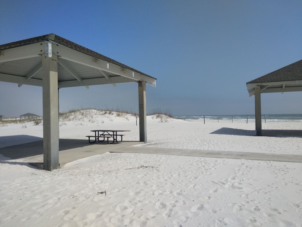 Die weitere Besichtigung von Fort Pickens sparen wir uns. Wir sind nicht besonders interessiert und wollen eigentlich nur weg. Der Himmel sieht nach mehr Regen aus. Schon das zweite Auto stoppt. Leider fährt die Lady nur bis zum Campingplatz, aber immerhin sind wir ein kleines Stückchen weiter. Es dauert keine 5 Minuten, dann hält der nächste Wagen an. Darin sitzt ein Paar mit hartem Akzent, im ersten Moment kaum zu verstehen. Sie sind etwas zurückhaltend. Bald erfahren wir, dass sie Russen sind. Aus der Sowjetunion sagen sie, genauer gesagt aus Moskau, und sie leben seit 32 Jahren in den USA. Die können uns ja nur leid tun. Sie entschuldigen sich für Putin, obwohl sie rein gar nichts damit zu tun haben. Familie und Freunde haben sie seit vielen Jahren nicht gesehen, aber natürlich machen sie sich Sorgen. 🙁 Unser russisches Paar steuert ein Restaurant in Pensacola Beach an. Unsere Fahrt ist hier erst einmal zu Ende.