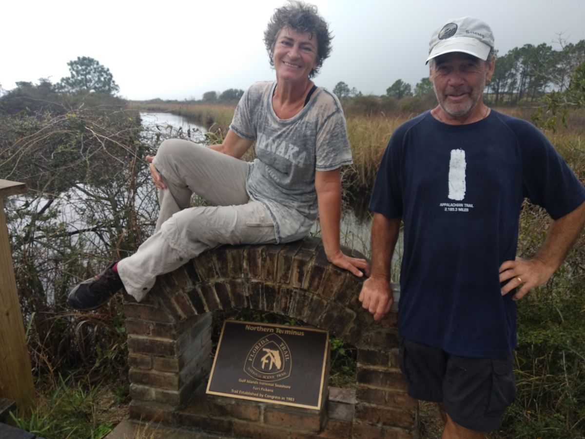 Wir wechseln die Spur und wandern weiter an der Wasserkante. Kanada-Reiher stehen am Flutsaum. Strandläufer hüpfen in Scharen umher, picken im nassen Sand und rennen davon, wenn eine Welle anrollt. Diese putzigen Vögel kennen wir von Norderney. Sie überwintern im Süden Nord-Amerikas. Stundenlanges Laufen im weichen Pudersand ist anstrengend. Wir verlassen den Strand, um auf einem Fahrrad-Fußweg schneller vorwärts zu kommen. Die Landzunge ist inzwischen so schmal, dass wir zu beiden Seiten das Wasser sehen können. Wenige Kilometer vor dem Ende gibt es einen teuren Campingplatz. Nichts für uns, ein riesiges Gelände mit Appartements auf Rädern. Auf einem der Kamine sehen wir schon von Weitem ein großes Nest. Sehr gut ausgewählt, denn das Haupthaus vom Campingplatz ist weit und breit das einzige Gebäude im Westen der Halbinsel. Zunächst denken wir dabei an Störche. Darin sitzen zwei junge Adler – Zwillinge – und schreien nach Fütterung. Faszinierend. 🙂 Unser Weg führt vorbei an einem schwarzen Bollwerk. Das ist „Battery Langdon“, ein Vorbote des Fort Pickens. Diese Verteidigungsanlage war bis 1947 in Betrieb. Wir steigen hoch, blicken einmal in die Runde und sind schnell fertig. Da hatten wir sogar auf unserer Deutschland-Wanderung beeindruckendere Burgen und Ruinen. Letzte Pause drei Kilometer vor dem Ende. Meine Füße tun weh. Und Zeit spielt jetzt keine Rolle mehr. Roter Kardinal im Busch gegenüber, gleich zwei davon. Wir sitzen auf einem Baumstamm und können das Paar in Ruhe beobachten. Die haben anscheinend Frühlingsgefühle. 🙂 Am 8. März 2022 gegen 13.30 stehen wir am Northern Terminus. Ungefähr 1800 Kilometer in 10 Wochen zu Fuß durch Florida. Ziel erreicht. Das Monument, auf dass wir seit dem 25.12.2021 unseren Fokus gerichtet hatten, übersehen wir fast. Es steht ziemlich unscheinbar hinter einer Brücke. Auf den Fotos bei Facebook wirkte es viel größer. Ehrlich gesagt ist das Erreichen des Monuments nicht besonders emotional. Unser „Siegerfoto“ können wir nicht sofort schießen, denn just in diesem Moment fängt es an zu regnen. Wir kauern uns auf den Boden und verkriechen uns in den Poncho. Typisch Florida-Trail, war irgendwie klar, dieser Abgang. 😉