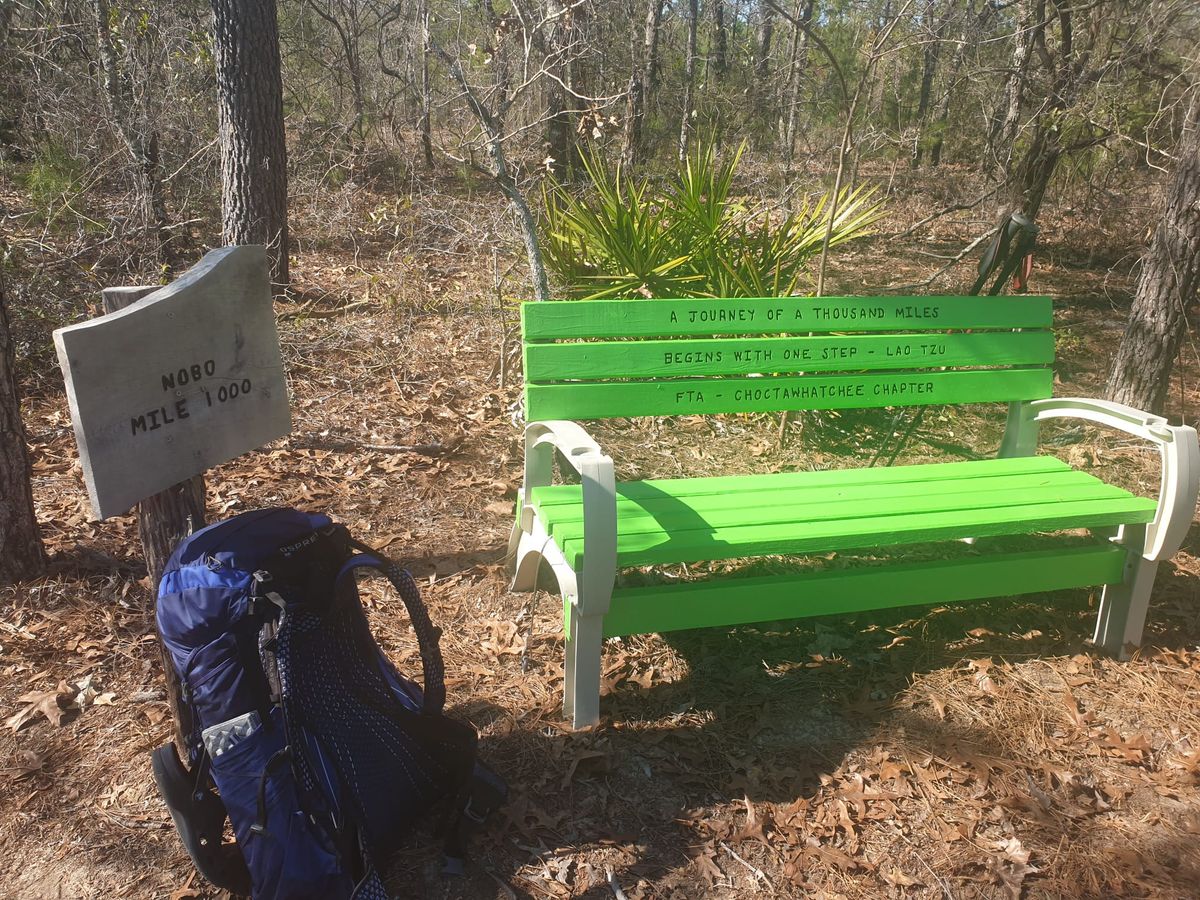 Am Nachmittag erreichen wir eine deutliche Markierung im Sand, da wurde ein breiter Strich quer über den Trail gemalt. Wir schalten das Handy an und bekommen unsere Vermutung bestätigt. Unsere App zeigt : 1000.0 Miles. Eine magische Zahl. Das sind 1600 Kilometer, wir sind bald fertig mit dem Florida-Trail. Na, wenn das kein Grund zum Freuen ist ! 🙂 Wir gehen ein kleines Stückchen weiter um die Kurve herum und staunen über eine grüne Bank am Wegesrand. Eine tolle Inschrift zum Erreichen der 1000-Meilen-Grenze ist in der Rückenlehne eingeritzt. 🙂 Daneben, etwas bescheidener, steht noch ein Holzschild, ebenfalls mit derselben Botschaft. Das wäre heute so ein besonderer Platz für den Feierabend …. aber es ist noch zu früh. Daneben wäre ein superschöner Platz, um ein Zelt aufzustellen …. aber das ist nicht erlaubt. Dann könnten wir heute Abend auf dieser grünen Bank sitzen und mit einem Bier auf unsere 1000 Meilen anstoßen …. aber wir haben leider kein Bier dabei. 😉 Nützt also nichts, wir marschieren weiter.