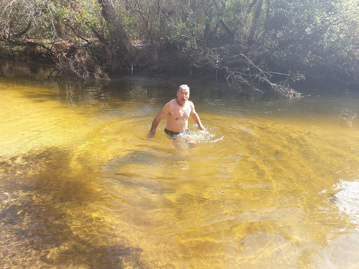 Die Landschaft ist gleichbleibend schön, und das nun schon den dritten Tag in Folge. Man kann nicht meckern, wir fühlen uns sehr wohl hier im Eglin. Vor uns liegt eine Senke, mit dicken Baumwurzeln und Cypressen-Stümpfen durchsetzt. Alles trocken, aber bei Hochwasser ist das hier Überflutungs-Gebiet. Boardwalk extra lang, bis zu einer Brücke über den Gun Creek. Danach geht es noch weiter …. gerne mehr. Die Bretterstege sind mit rutschfester Dachpappe überzogen, also super zum Laufen. Das macht Spaß. 🙂 Heute treffen wir die ersten Menschen im Eglin-Gebiet, sie nennen sich „Tigger“ und „Graybeard“. Sofort fällt uns auf : Keen-Schuhe. Beide sind Vollblut-Hiker durch und durch. Tigger und Graybeard kennen den AT, den PCT und noch einige andere. Sehr beeindruckend ! Er ist stolze 77 Jahre alt und war Organisator bei der ALDHA, in der auch wir schon lange Mitglied sind. Lange bleiben wir stehen und quatschen mit den Beiden. Schade, dass wir in verschiedenen Richtungen unterwegs sind. Eine Stunde später kommen wir an die Eglin Bridge. Darunter fließt klares Wasser, an einigen Stellen tief genug für ein Bad. Der Grund ist gut zu erkennen, kein Müll, keine Pflanzenteile, einfach nur weißer Sand. Wir steigen eine kleine Böschung hinunter und gehen schwimmen. Das Wasser ist eiskalt, es kommt aus dem Norden. Uns bleibt fast die Luft weg, aber es ist herrlich erfrischend. In der Mittags-Sonne werden wir blitzschnell wieder trocken ( Handtücher tragen wir natürlich nicht ), so dass wir einfach wieder in die Klamotten steigen können.