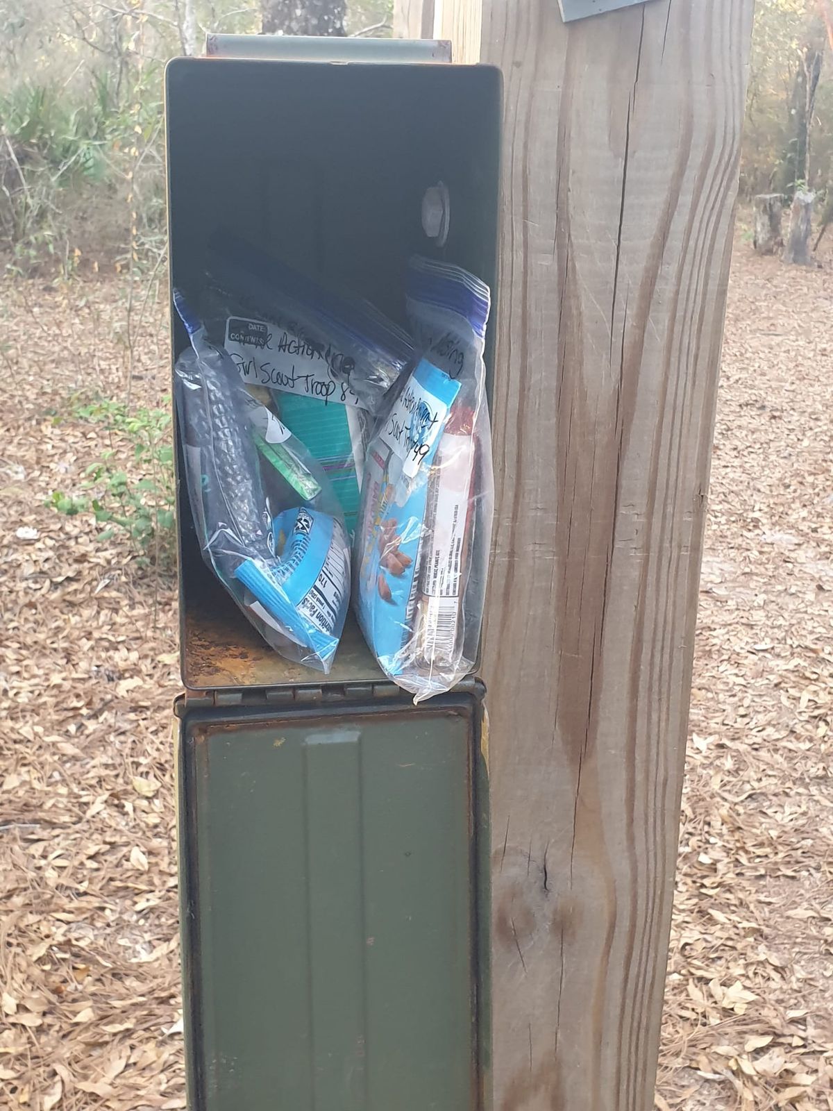 Am Honey Creek füllen wir unsere Flaschen mit Trinkwasser und nutzen den Steg als Sitzgelegenheit während der Pause. Da kommt schon wieder ein Mensch, ein junger Mann mit Trail Namen „Squirvert“. Der war auch schon auf dem AT, also haben wir genügend Gesprächsstoff. Wir laufen eine Weile zusammen, bis sich unsere Wege am Pearl Campsite trennen. Wir machen früh Feierabend, damit wir morgen einen guten Start haben. Vor uns liegen erneut ungefähr 35 Kilometer auf Straßen, davon wollen wir den größten Teil an einem Tag hinter uns bringen. Am Ziel erwartet uns eine Überraschung. Mehrere Boxen mit Trail Magic von den Girl Scouts, den Pfadfinderinnen. In verschließbaren Tüten finden wir ein Sortiment von Mandeln, Keksen, Kaukummi, Pflastern, Feucht-Tüchern, Sanitizer …. lauter nützliche Dinge für Wanderer. Eigentlich brauchen wir nichts, aber man freut sich trotzdem über die nette Geste. 🙂