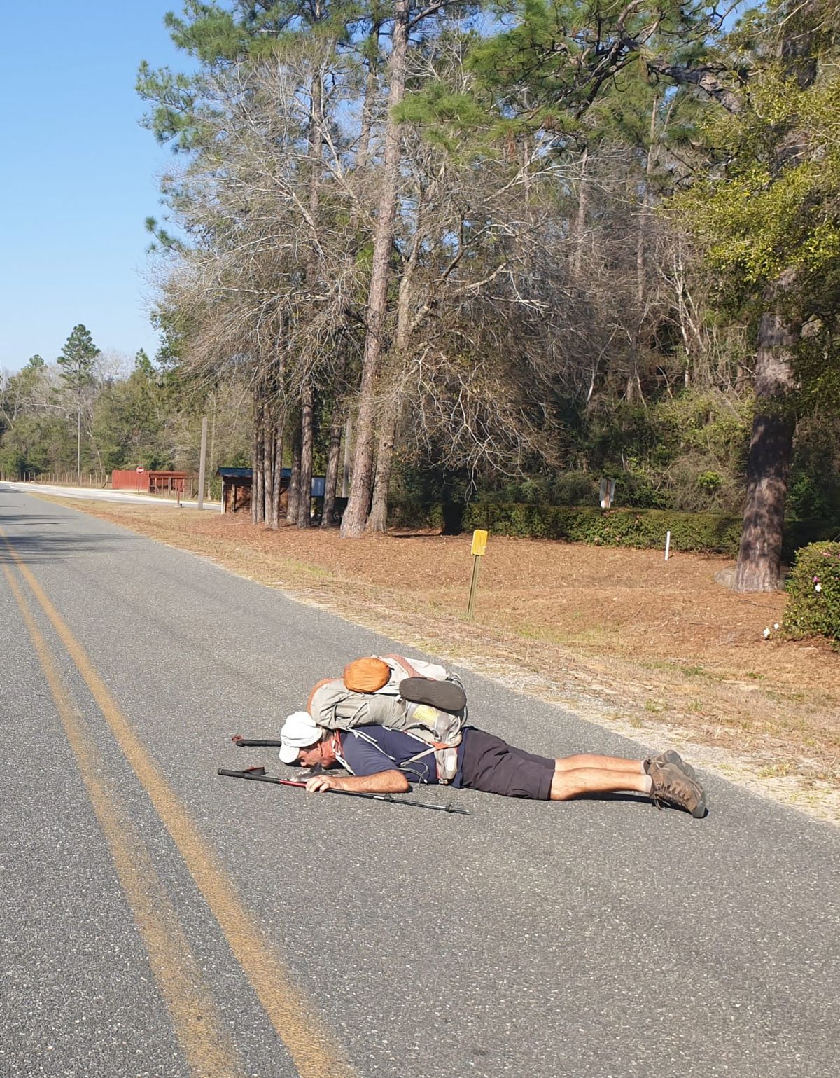 Die Florida-Symphonie ist besonders laut auf diesem Platz. Die Autobahn ist nicht weit, und der Verkehr reißt die ganze Nacht nicht ab. Unser Wecker klingelt schon um 5.30 Uhr. Wir wollen früh los, denn es wird ein langer Tag auf Asphalt. Frostige Temperaturen. Nach einer halben Stunde verlassen wir den Eglin Forest ( leider ) und stehen an einer vierspurigen Straße, der SR 85. Unsere App sagt dazu „High Speed Traffic“. Stimmt, es wird gleich wieder gefährlich. Der Florida-Trail verläuft neben der rechten Fahrbahn, also haben wir den Verkehr im Rücken. Zwei Stellen mit verengter Fahrbahn, wir müssen als Fußgänger zwei Brücken überqueren, die nur für Autofahrer gemacht wurden. Wir sind es inzwischen gewohnt. Dauert nicht lange, dann erblicken wir die ersten Hotels und Tankstellen von Crestview. Temperatur 4° Celsius, immer noch ganz schön frisch. Erste Pause beim Walmart, der liegt fast auf dem Weg. Dort kaufen wir eine neue Gas-Kartusche ( die letzte auf diesem Trail ). Außerdem gibt es das obligatorische Brat-Hähnchen und literweise Orangensaft. Gut gestärkt geht es zurück auf die Straße. Ein Problem ist, dass es auf dieser Strecke wieder keine Möglichkeit zum Zelten gibt. In Crestview kann man in einer Art Hostel kostenlos übernachten. Sehr nett, tolle Aktion für die jungen Leute. Aber in dieser Art von Unterkunft fühlen wir uns nicht so richtig wohl. Mir stellen sich schon bei dem Namen „Hiker’s Heaven“ die Nackenhaare hoch, wenn ich mir vorstelle, was für ein Trubel dort in den Gemeinschaftsräumen herrscht. Muss wohl am Alter liegen …. 😉 Zweite Pause an einer Tankstelle, weil ich zur Toilette muss. Wir brauchen einen stabilen schwarzen Müllsack, damit wir für den Flug aus zwei Rucksäcken ein Gepäckstück machen können. Im Laden liegen die herum, weil gerade gereinigt wird. Wir fragen die Putzfrau und bekommen einen schwarzen Sack geschenkt. Draußen werden wir von einer netten Dame angesprochen, während wir unsere Cola trinken. Dann schenkt sie uns ein paar Dollar „für einen Kaffee“. Sehen wir aus wie Bettler oder wie Obdachlose ? 😉 Die Lady sagt, dass es ihr eine Freude ist, uns auf unserem Trail zu unterstützen. Zum Abschied gibt sie uns ein „God bless you“ mit auf den Weg. Eine Stunde lang folgen wir den Markierungen quer durch die Stadt. Es ist gar nicht langweilig, auf der Main Street zu flanieren, denn es gibt viel zu sehen. Schaufenster-Bummel. Die Stadt Crestview gefällt uns. Nach Verlassen des Ortskerns wird es wieder hässlich. Zu viel Verkehr, kein Rand für Fußgänger, eine ellenlange Brücke voraus, wo es dann noch enger wird. 🙁 Trail Angel Sparkles hält an, während wir verdrossen am Highway stehen. Sie ist eine Freundin von FlatTop, der uns aus der Trail-Gemeinschaft und von Facebook gut bekannt ist. 🙂