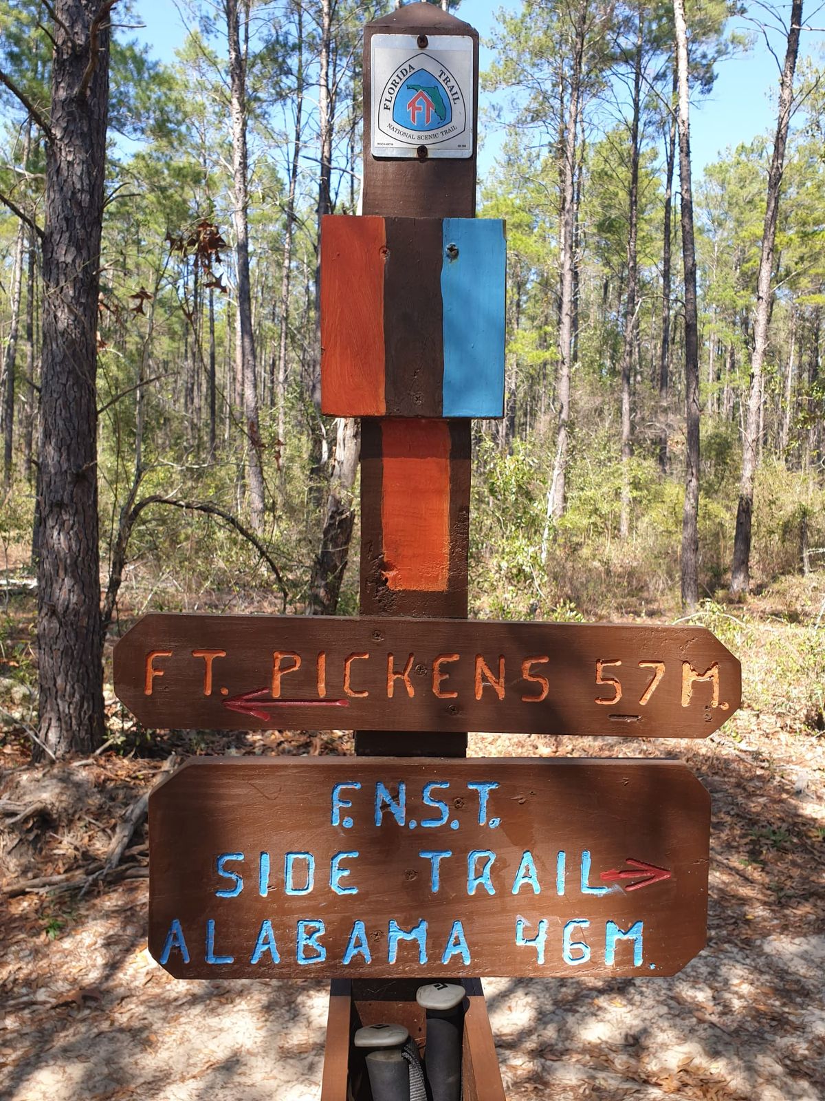 Schüsse während der Nacht, anscheinend nicht weit entfernt. Da haben wir es wieder, die Sache mit dem „falschen Film“. Es dauert zum Glück nicht lange, dann herrscht wieder Ruhe. Wir drehen uns um und schlafen noch ein paar Stunden weiter. Vogel-Spektakel sehr früh am Morgen. Viele verschiedene Stimmen, alle zwitschern durcheinander. Wir stehen wohl etwas im Weg, denn mehrere Sportler im Fußball-Dress stapfen um unser Zelt herum. Aufstehen und los. Der Weg führt zunächst wieder durch abgebrannten Wald. Schwarz vom Ruß, es stinkt nach erkaltetem Feuer. In der Ferne wird geballert. Das hört sich nach schwerem Geschütz an, es wird wahrscheinlich aus dem Eglin-Militärgebiet zu uns herüber hallen. Nicht schön. Keine Tiere zu sehen. Langweilig ist es. Jeder hängt seinen Gedanken nach, wir laufen einfach nur stumpf den Markierungen nach. Und dann kommt uns ein Sonnenschein entgegen : „Siesta“ sieht sauber und adrett aus, ist richtig schick gekleidet und hat eine modische Sonnenkappe auf dem Kopf. Eine tolle junge Frau, etwas kräftiger, hübsches Gesicht und eine wahnsinnig positive Ausstrahlung. Das Besondere an ihr sind zahlreiche Schmuckstücke, bunte Armbänder und Gold-glitzernde Ketten um den Hals. So etwas fällt echt auf im Wald. Siesta hat vor drei Tagen ihr Ziel erreicht und wandert jetzt zurück bis Crestview, von wo sie die Rückfahrt nach Hause arrangiert hat. 🙂 Das Bild des Waldes ändert sich, der Pfad wird schmal und richtig fein. Boardwalk über ein sumpfiges Gebiet, dann geht es hinunter an einen See. Unser Trail ist kaum noch zu erkennen, der Weg ist mit dicken Wurzeln durchsetzt und zugewachsen. Balancieren über Baumstämme, Klettern auf die andere Seite eines Baches, so gefällt uns der Florida-Trail schon besser. Weiter laufen wir durch einen grünen Tunnel. Inzwischen ist der Frühling angekommen, die Bäume tragen Knospen. Pause an der Wild Azalea Campsite mit sauberem Wasser und Picknick-Tisch. 🙂 Ungefähr zwei Stunden bleibt es schön. An einem Abzweiger steht ein Wegweiser. Der Florida-Trail geht nach links weiter, rechts verläuft der Side Trail nach Alabama. Unser Endziel ist Fort Pickens, noch 57 Meilen bzw. etwas mehr als 90 Kilometer.