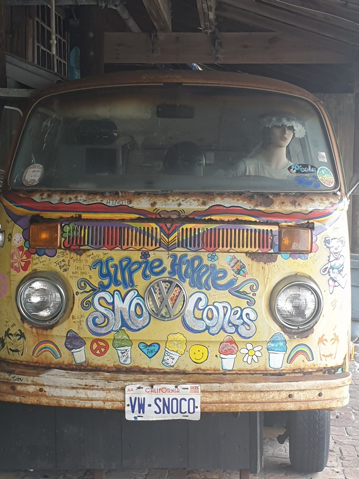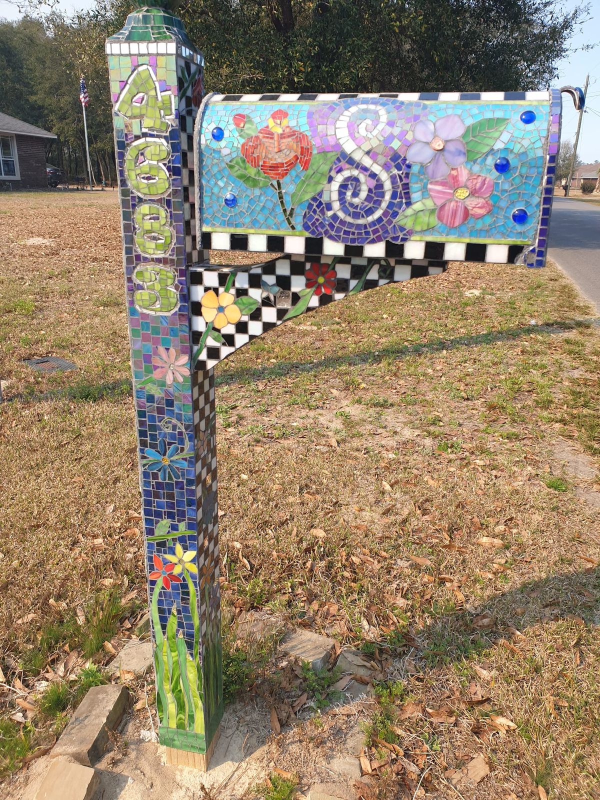 Wir genießen die entspannte Atmosphäre im Wald, denn bald geht es erneut auf die Straße. Dort stören wir uns an einer hässlichen Müll-Ecke. Zu beiden Seiten liegen kaputte Säcke, der Hausmüll verteilt sich daneben. Armselige Wohngegend, die Leute haben anscheinend kein Geld, um die ordnungsgemäße Entsorgung zu bezahlen. Die Luft ist dick und grau, südlich von uns wird ein Gebiet abgefackelt. Es riecht stark nach Rauch. Wir grüßen einen älteren Mann, der mit Bierflasche in der Hand am Zaun steht ( und das am frühen Nachmittag ). Er trägt eine Kappe mit der Aufschrift „FREAK“. Zerrissene Kleidung, ungepflegter Vollbart, wieder so eine verlorene Seele. Wir kommen ins Gespräch und erfahren, dass er erst 66 Jahre alt ist und sein Leben während der Hippie-Zeit voll genossen hat. In jungen Jahren ist er kreuz und quer durch die USA getrampt und hat dabei 48 Bundesstaaten besucht. Er wohnt jetzt bei einem Freund im Mobil-Home, nichts Eigenes, also eher geduldeter Gast. Heute sieht er gar nicht gesund aus, hustet ganz übel, wahrscheinlich COPD vom Rauchen. Er schimpft über die Politik, klagt darüber, dass alles teurer wird. Viele Jahrzehnte hat der „Freak“ mit Vollgas gelebt, aber jetzt kommt das große Jammern. Eigentlich viel zu früh, denn mit 66 muss man sich noch nicht aufgeben. Gleich nach dieser Begegnung biegen wir ab in die Nicholas Creek Road. Hier gleicht ein Haus dem anderen. Die Bauweise, die Grundstücks-Größe, drei Garagentore pro Gebäude, offene Veranda, Eingang mit Säulen …. Das sind Lego-Häuser, alle gleich bis auf den Farb-Anstrich. Einzelne Module kann man anscheinend nach dem Baukasten-System aussuchen. Es dauert eine ganze Weile, bis wir verstehen, dass wir durch eine Militär-Siedlung laufen. Ungefähr 200 Familien wohnen hier friedlich und langweilig nebeneinander, aktive und Ex-Militär-Angestellte. Einzig und allein ein Briefkasten im Hundertwasser-Stil fällt auf. Der ist wirklich einzigartig mit seinen bunten Mosaiken.