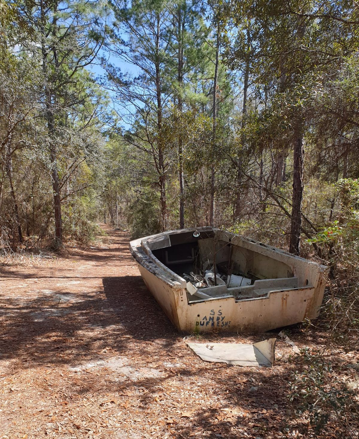 Lange Nacht, ja, aber ohne Ruhe …. Der Highway ist viel zu nah. Wir sind total übersättigt von Straßen, Autos, Verkehrslärm. Schon morgens um 6.00 Uhr läuft ein Wanderer an unserem Zelt vorbei, gefolgt von einem Hund. Den kennen wir vom Wilton Hilton bei der Baptisten-Kirche. Erstmal brauchen wir unseren Kaffee, dann folgen wir seinen Spuren. Es geht zwei Stunden lang durch schwarze Baum-Gerippe, nicht das erste Mal, aber immer noch deprimierend. An einem Bach treffen wir Herrchen und Hund wieder. Er raucht gerade sein Pfeifchen und erzählt vom 6-er-Pack Bier, das er sich gestern gegönnt hat. In der gemeinsamen Pause erfahren wir noch mehr aus seinem Leben. Der Mann hat schätzungsweise unser Alter, ist aber ein ganz armer Schlucker und hat praktisch kein Geld. Heimatlos und ziellos. Er wird noch nicht einmal bis zum Ende laufen, sondern 10 Meilen vorher abbiegen auf irgendeinen anderen Trail. Thomas schenkt ihm ein paar Snacks, denn wir haben gerade zu viel davon, außerdem können wir am späten Nachmittag unterwegs einkaufen. Wir sind privilegiert. Wir haben die Wahl zwischen Zuhause, Boot, Zelt und Rucksack. Und wir sind zu Zweit. 🙂 Uns zieht es weiter, Hund und Herrchen bleiben länger sitzen und denken über Mittagsschlaf nach. Nach dem verkohlten Gebiet wandern wir eine halbe Stunde durch’s Grüne, danach ist schon wieder vorbei mit schönem Weg. Gerodete Flächen, abgeholzter Wald, Kraut und Rüben, Furchen und Holzsplitter überall. Hässlich. Eine Straße kreuzt, dort stehen zwei Wagen. Ein sportlich gekleideter Herr steigt aus und fragt, ob wir Thru-Hiker sind. Seine Frau möchte eine kleine Sektion laufen, aber sie finden den Trailhead nicht. Thomas kann ihm den Weg erklären und auf dem Handy zeigen, welche Straße dorthin führt. Zum Abschied drückt der Mann ihm einen Schein in die Hand „für Essen“. Schon wieder 20,- Dollar geschenkt bekommen. Warum ? Das erschließt sich uns nicht so ganz. Anscheinend finden die Leute es toll, dass wir über 1000 Meilen zu Fuß durch Florida gelaufen sind. Wenn die wüssten, dass wir das ganz bestimmt nicht noch einmal machen würden. 😉 Wir müssen einmal den Highway überqueren, relativ wenig Verkehr, also nur halb so gefährlich. An der nächsten Kreuzung liegt ein verrottetes Motorboot. Es steht einfach so mitten auf dem Weg, anscheinend schon etwas länger, denn es wachsen kleine Bäumchen drin. Das ist ja verrückt. Wie kommt dieses Boot denn dorthin ? Die einzige Erklärung, die uns einfällt, ist Hochwasser. Dafür kommen der Yellow River oder der Buck Pond in Frage. 50-60 Zentimeter Tiefgang, da muss schon sehr viel Wasser über die Ufer treten und viele Meter steigen, bis es ein Motorboot ins Binnenland versetzt. Den ganzen Nachmittag laufen wir entlang des Highway. SR 87 zum dritten oder vierten Mal. Dichter Feierabend-Verkehr. Eine Tankstelle zur Auflockerung, danach ein kleiner Einkauf im Dollar General. Zeltplatz gibt es nicht, wir schlagen uns neben dem Highway in die Büsche. Nicht schön, aber damit haben wir die gestrige Distanz von 45 Meilen gedrittelt. Morgen gibt es für uns nur die Campsite Big Sabine Point in 15 Meilen. Keine Alternativen, weil Zelten am Strand strengstens verboten ist.